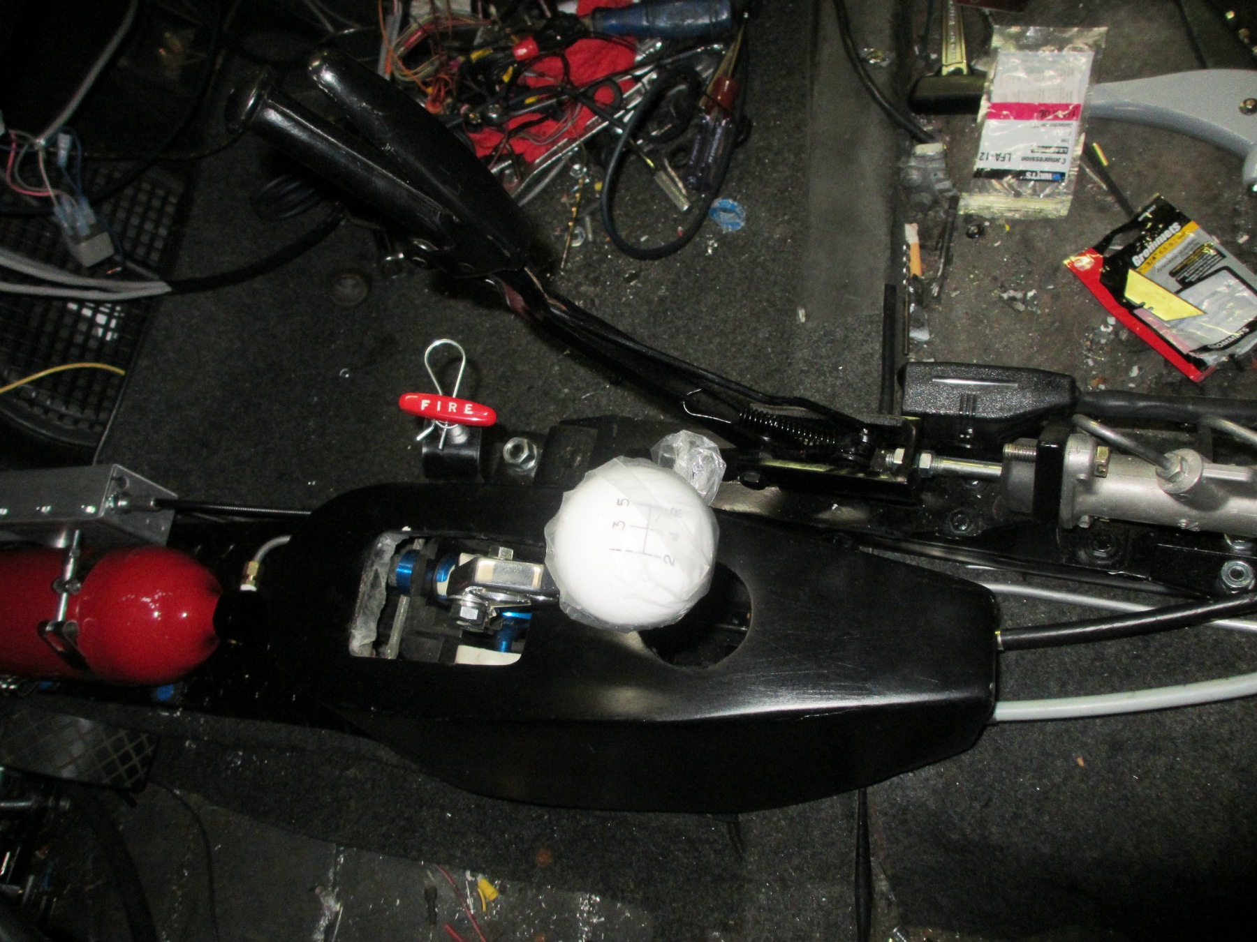 I also picked up a FireCharger AFFF fire system. Pretty cool and it allows me to re-charge it at will. I still need to plumb it to the engine bay and rig the pull handle, so for now I just have the location of the bottle mocked up. I picked up a short shifter for the boxster assembly. The Boxster shift knob is a press on fit to a flat bar. So.. I cut the Lever off, drilled, tapped and installed a Mustang lever. I topped it off with a Hurst style knob with the proper 5-spd pattern embossed on top. You can see the wire frame/fiberglass console I made to snap over the shifter assembly. I cut a gauge hole in it for a future something. Maybe a vintage VW clock... (IMG:style_emoticons/default/idea.gif) Please excuse the wiring hanging. I will dress it up once I'm sure all the wiring is complete. (IMG:style_emoticons/default/type.gif) Here you can see a teaser shot of my Rat Rod 1936 Buick parking brake setup. It's modified (like everything else) to work with my hydraulic parking system. |
