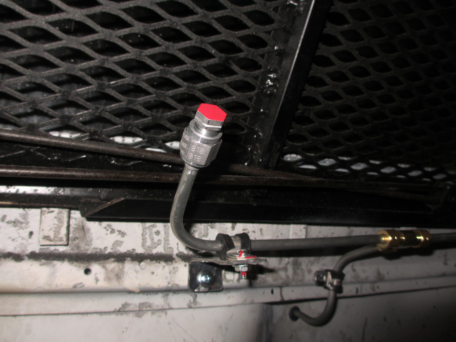 The bottle and CO2 housing are mounted on the front tunnel. I mounted the handle on my shifter console. The nozzle tubing is routed on top of the tunnel, up the firewall and pops out into the engine bay at the top. The two nozzles are mounted slightly to the left of center. One over the fuel rail and one over the intake manifold. I painted the top of the tips red so they don't blend in to the rest of the stuff back there. |