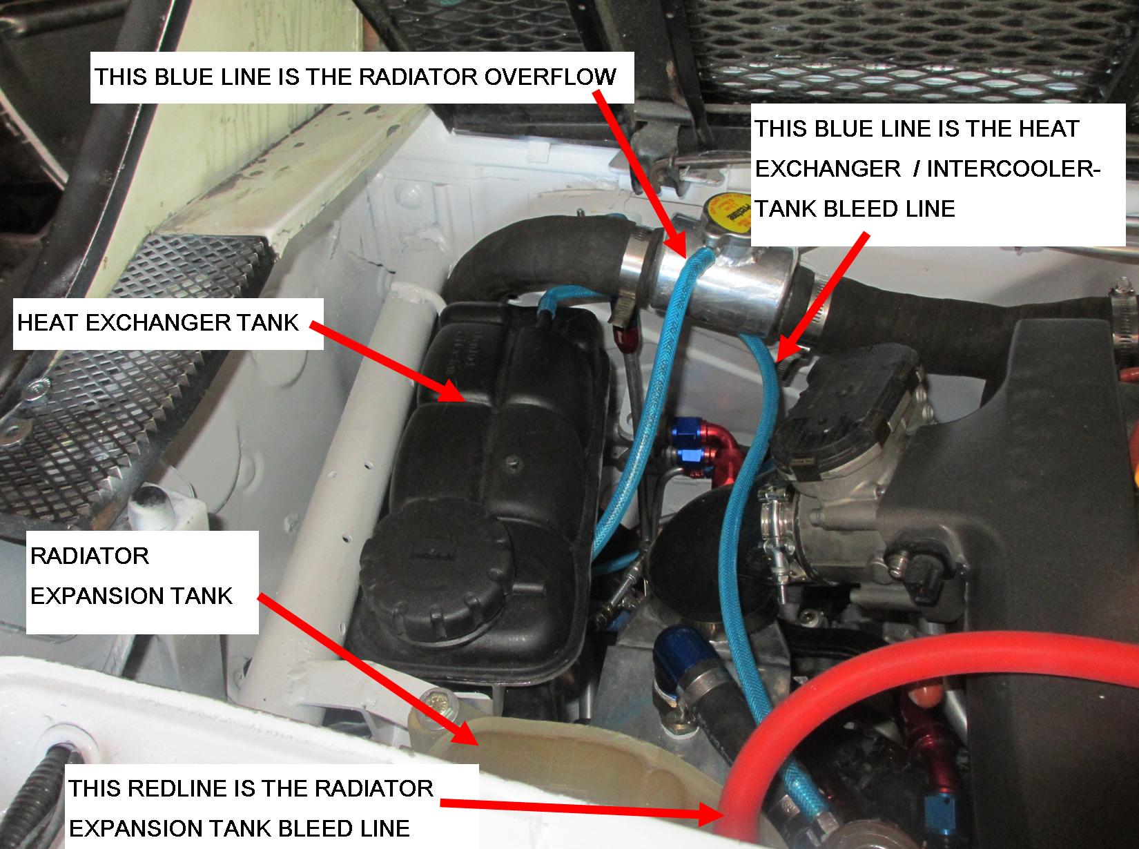 Dude this is just killer!!! Im confused on your overflow tank. Why is there 2 lines going to it? It looks confusing since I have 2 tanks. One is the normal engine expansion tank. The other is the intercooler / heat exchanger tank. Both systems are setup to self bleed. Just like the factory designed... |