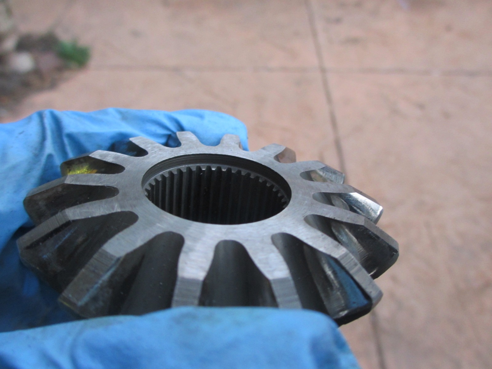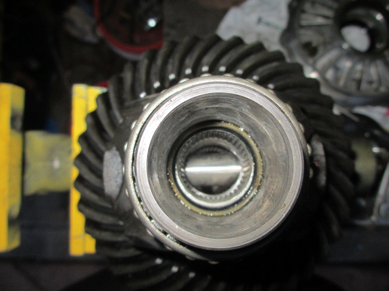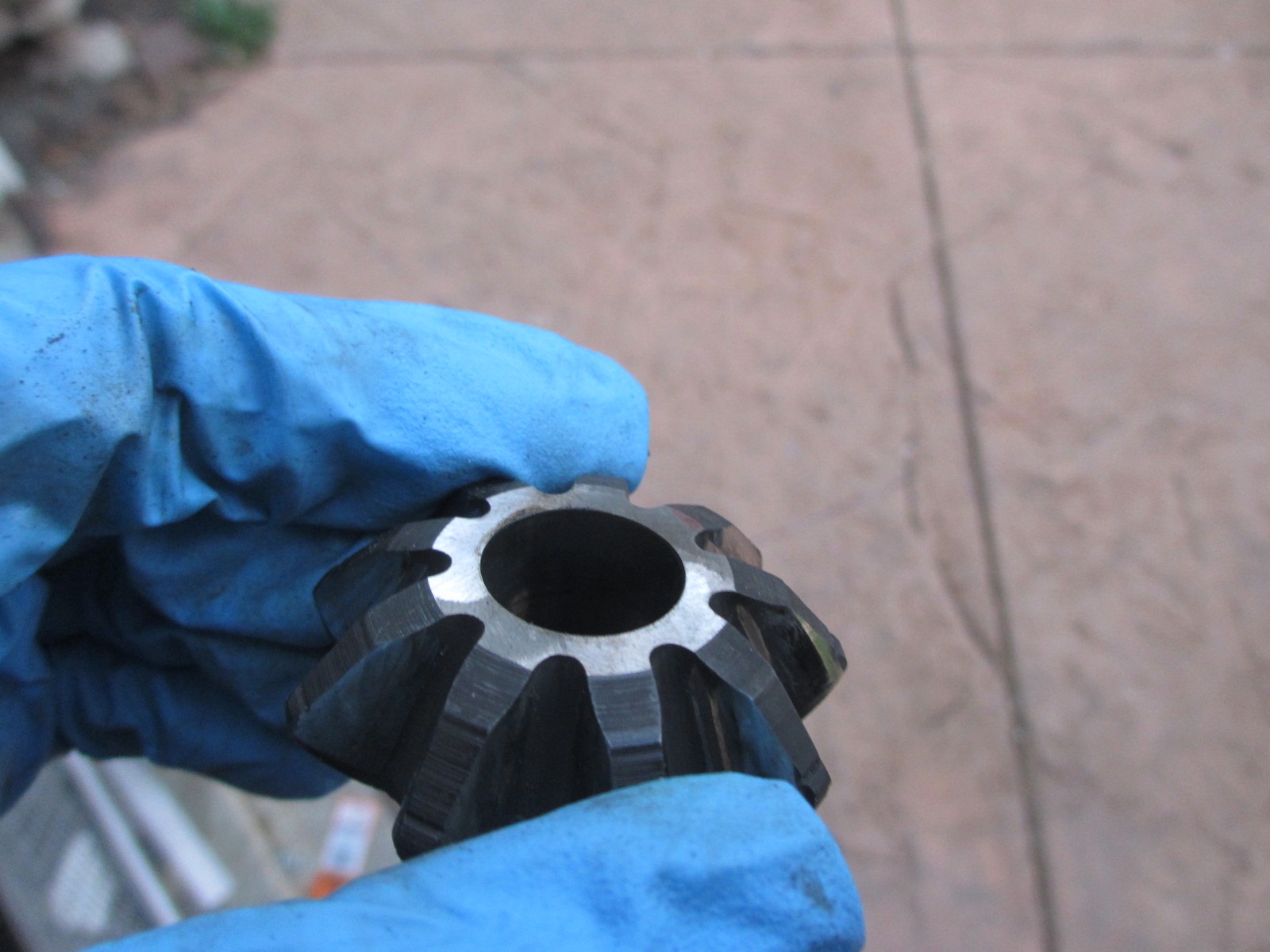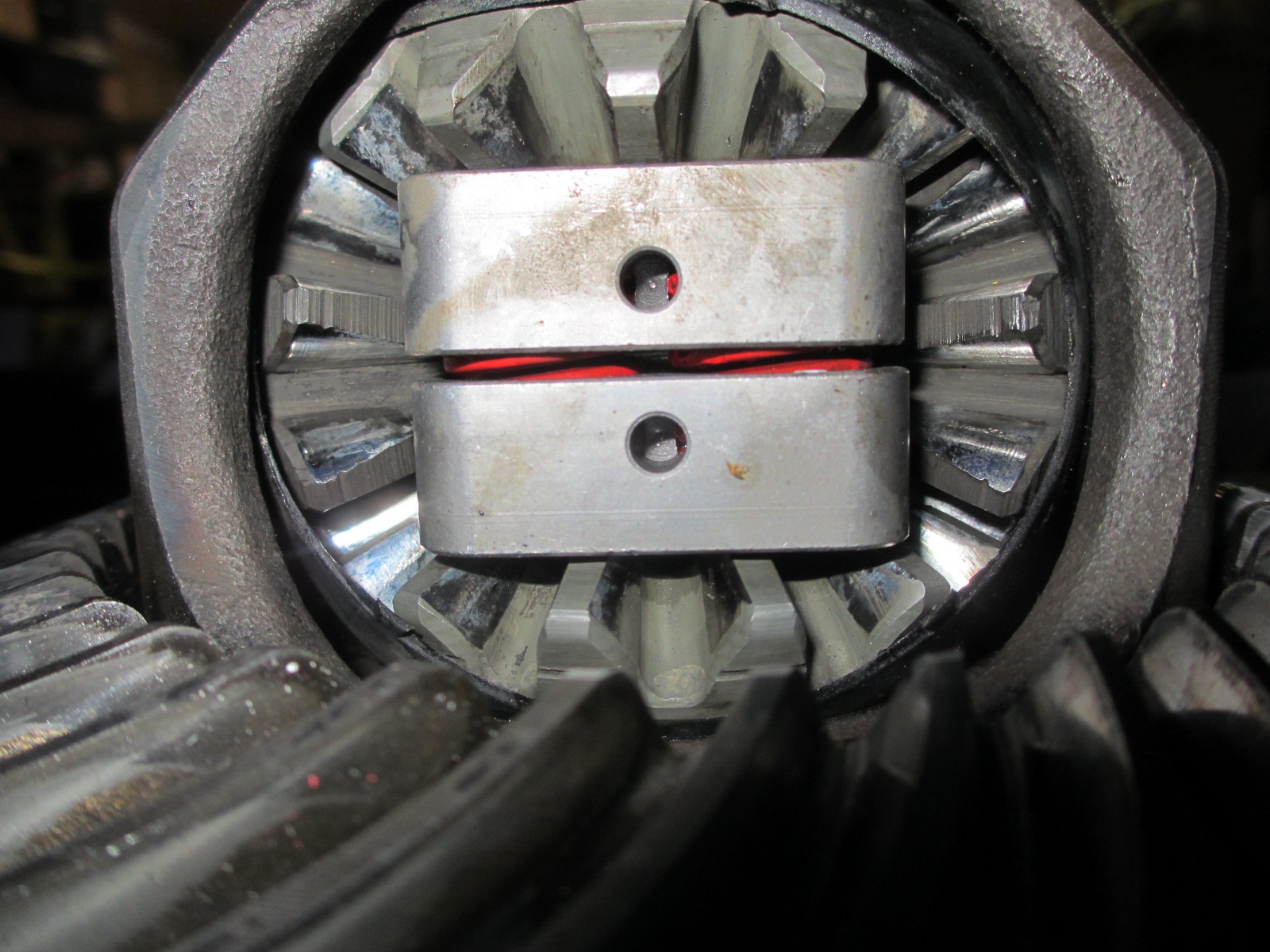 I got the Phantom Grip(PG) installed today. I did have to machine the drive gears and the spider gears for clearance. I drove to several machine and gear grinding shops today. None of them could do the job. No way to chuck them up in the machine. So I did it myself. I built a drill rig from a bolt and some washers. The drive gear has a recess on the face for the stub axle circlip. I chucked up the gear in my drill and while spinning at low speed, ground it on my bench grinder. I took my time and kept eye with a caliper and straight edge. It turned out better than I expected. Looks like a flat machine finish. I also had to clearance the PG axle hole a little. Since I machined the drive gear, the stub axle sticks through a little further. I opened the hole in the PG to allow the stub to slide in without binding. Normally the end of the stub would be in the empty center void.