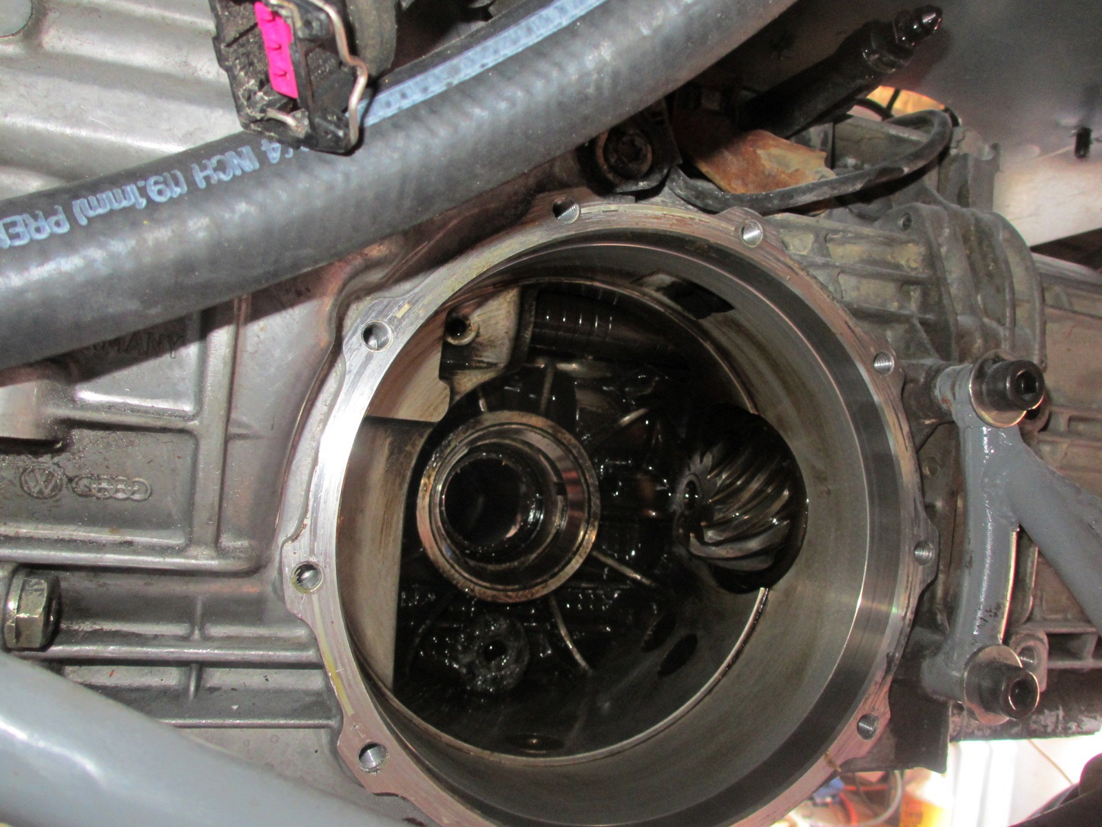 I added a momentary toggle switch to allow cranking the engine from the trunk... If anyone ever wondered about the Renegade Hybrids "500hp axle" kit is... It's a VW Type 2 axle with 33 spline CV's. Not sure if the CV's are T2 or 944... You can see the "VW 2" logo stamped into the end. New axles are on the way from SoCal. Final measurements are 20.25" and 21.375". I popped out the diff today to get ready for the Phantom Grip LSD. I was surprised how easy it was to get out. I took some measurements of the diff parts so you guys can compare to the 901 diff. I will as-built the LSD part when it arrives. This transaxle is an Audi 012, 5 speed. The spider gears are already machined flat, so I do not have to take it to a machine shop. The LSD pushes against both spiders equally to act like a clutch type LSD. If the spiders are not flat and true, the LSD will not work correctly. The other nice thing about this system; you don't have to reset any back lash since the 3 member and bearings are not really messed with. 18mm shaft 27mm between the flat surfaces of the drive gears |