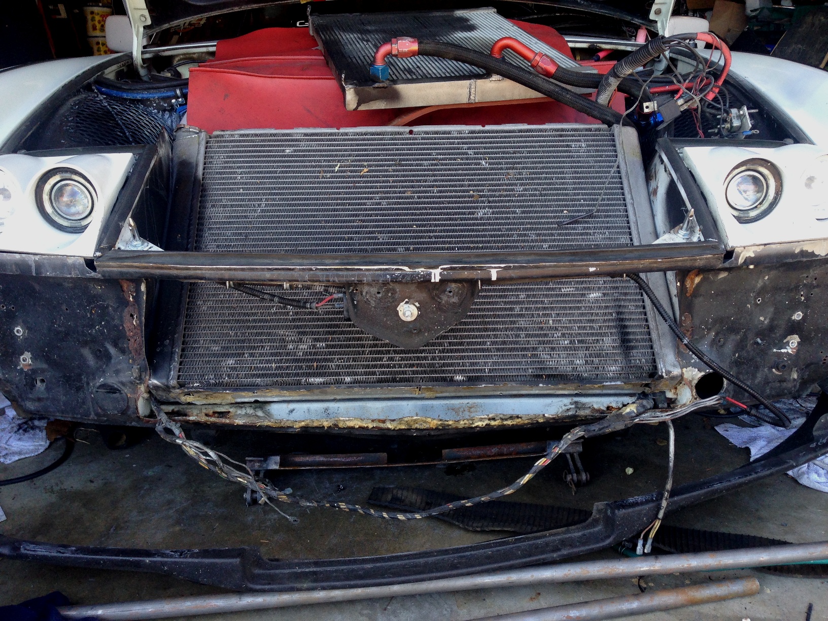 Then I turned my attention to the bracket. Clearly home made and in need of work. It mounts to the suspension points like any other but My car is too low and it will never work. BTW, for those following the adventure, my car died when I got home from the swap meet. I found a bad fuel pump relay was the cause. Measuring my tow vehicle, the hitch is 19" off the ground. With the tow bar flat, the ball cup is 6" off the ground. A difference of 13" places the bracket mounts into the lower section of my bumper. This should make the tow bar level while towing. So I pulled the bumper and valence and was reminded of how ugly the front end is. The PO really cut a huge hole in the front for air flow. Too big really. I think it might be time to overhaul the cooling system. I always hated how much space is lost up front. Al at Parts Heaven is hooking me up with all the Boxster pieces I need to make a big change. I also need to down size my oil cooler to suit as well. You can see how big my setup is. The oil cooler is sitting on top of the gas tank in this pic. Black paint was too cut down on reflection through the grill. 13" ends up just above the access holes. (plug missing on right) I need to get the radiator out and build reinforcements. I need to get all the parts before I decide on a final design and fabrication. The hacked hole looks terrible. I may have to section a piece from the parts car in my side yard. |