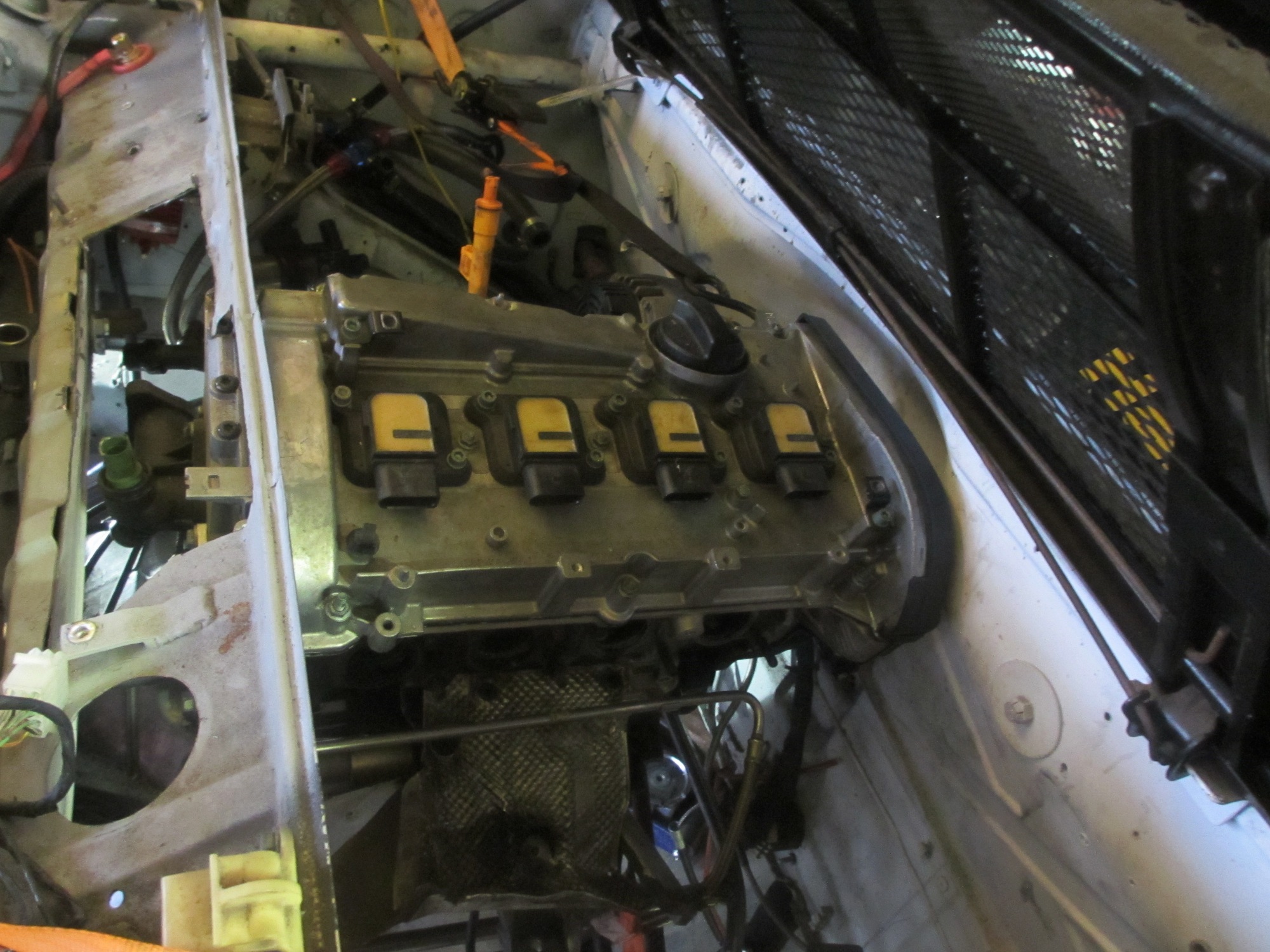 Engine in the bay. I will have to make room in the rear trunk for the valve cover, exhaust and intake. I picked up a new aluminum intake manifold since the stocker won't work (angle problem) this one allows the TB to be installed in front of in back. I am mounting it in the back and it will also crowd the trunk a little... |