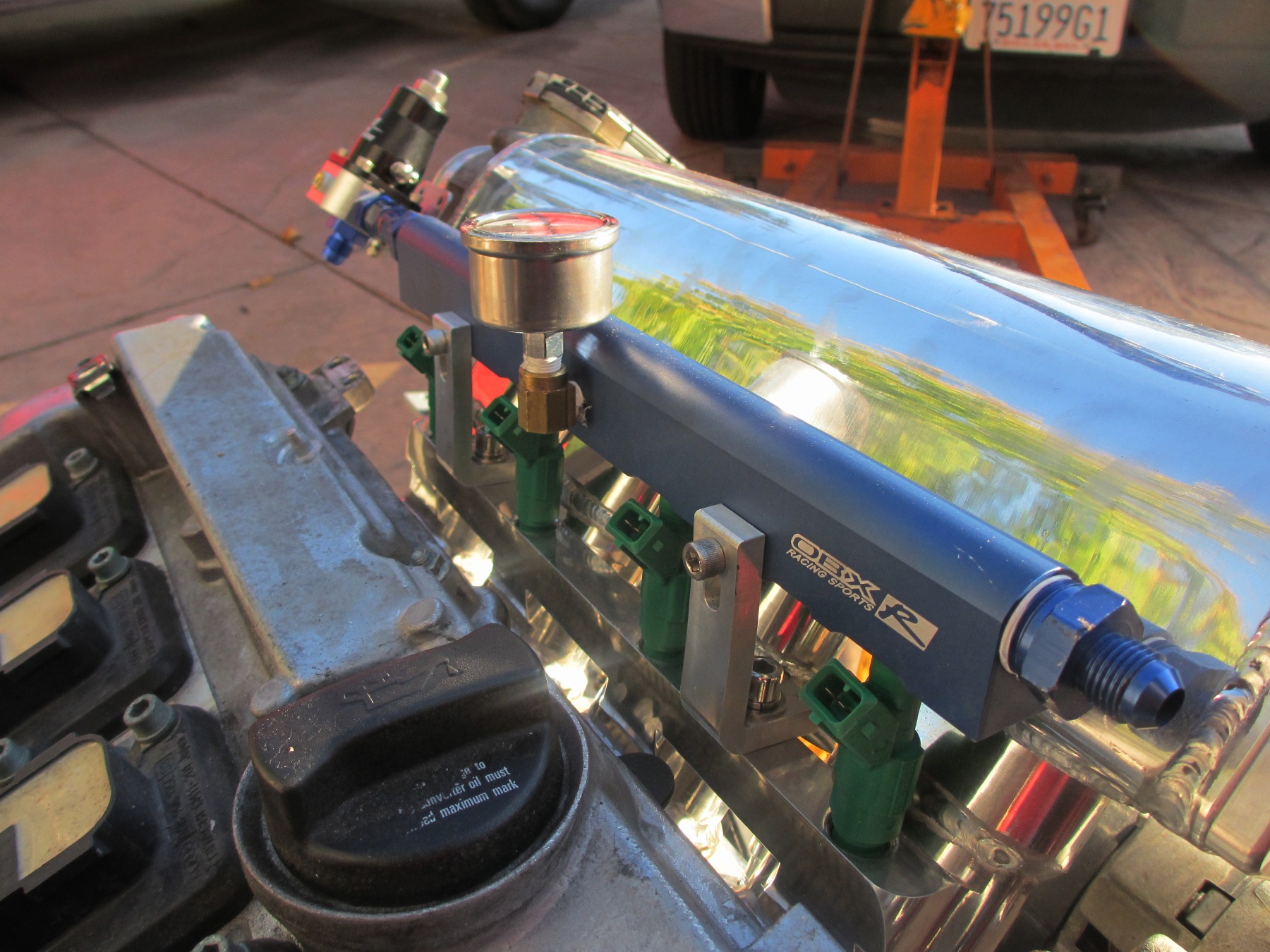 The cool thing about the OBX (don't laugh) intake manifold is the ability to swap the throttle body to the front or rear. Right now it's setup on the rear. My AEM methanol injector is on the front. The shitty thing about the OBX manifold was the fuel rail. The one that came with the manifold is polished and the -6AN fittings arn't right. They do not fit a -6AN fitting. Shitty Chinese manufacturing. I just happened to have another OBX rail and it worked with a little modification. Aeromotive 75psi regulator is hanging on the end. Not sure I will leave it there but we'll see...