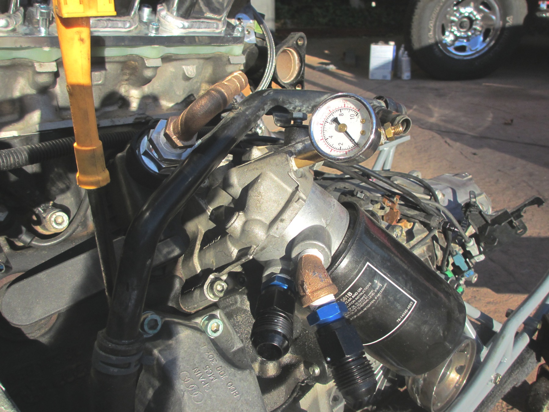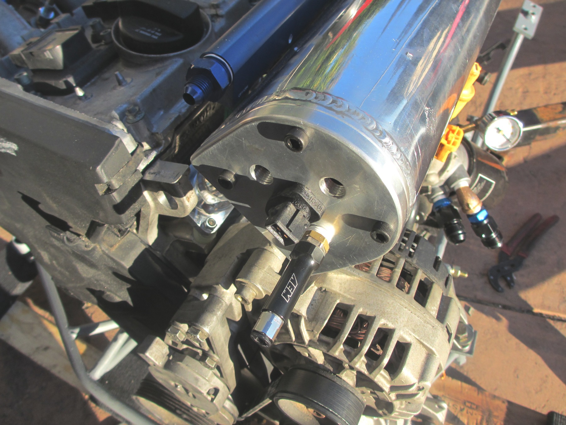 Here is the oil cooler attachment and Crankcase evacuation fitting visible. I removed the factory water cooled oil cooler and will run my -12AN oil cooler lines to it. (IMG:style_emoticons/default/smile.gif) I had to add a 45 elbow and -10 to -12 adapters. The elbow it for clearance between the -12 fittings only. |