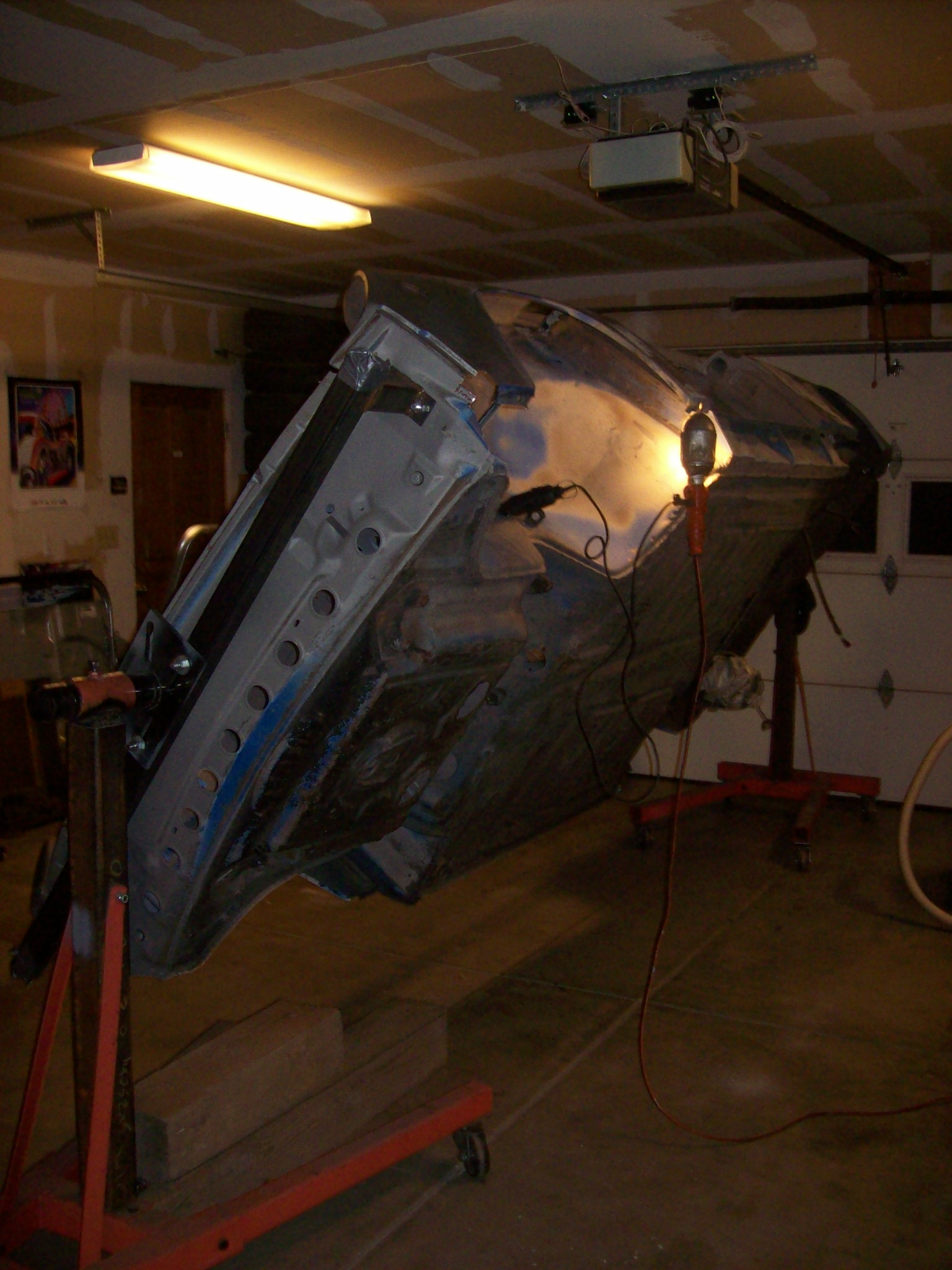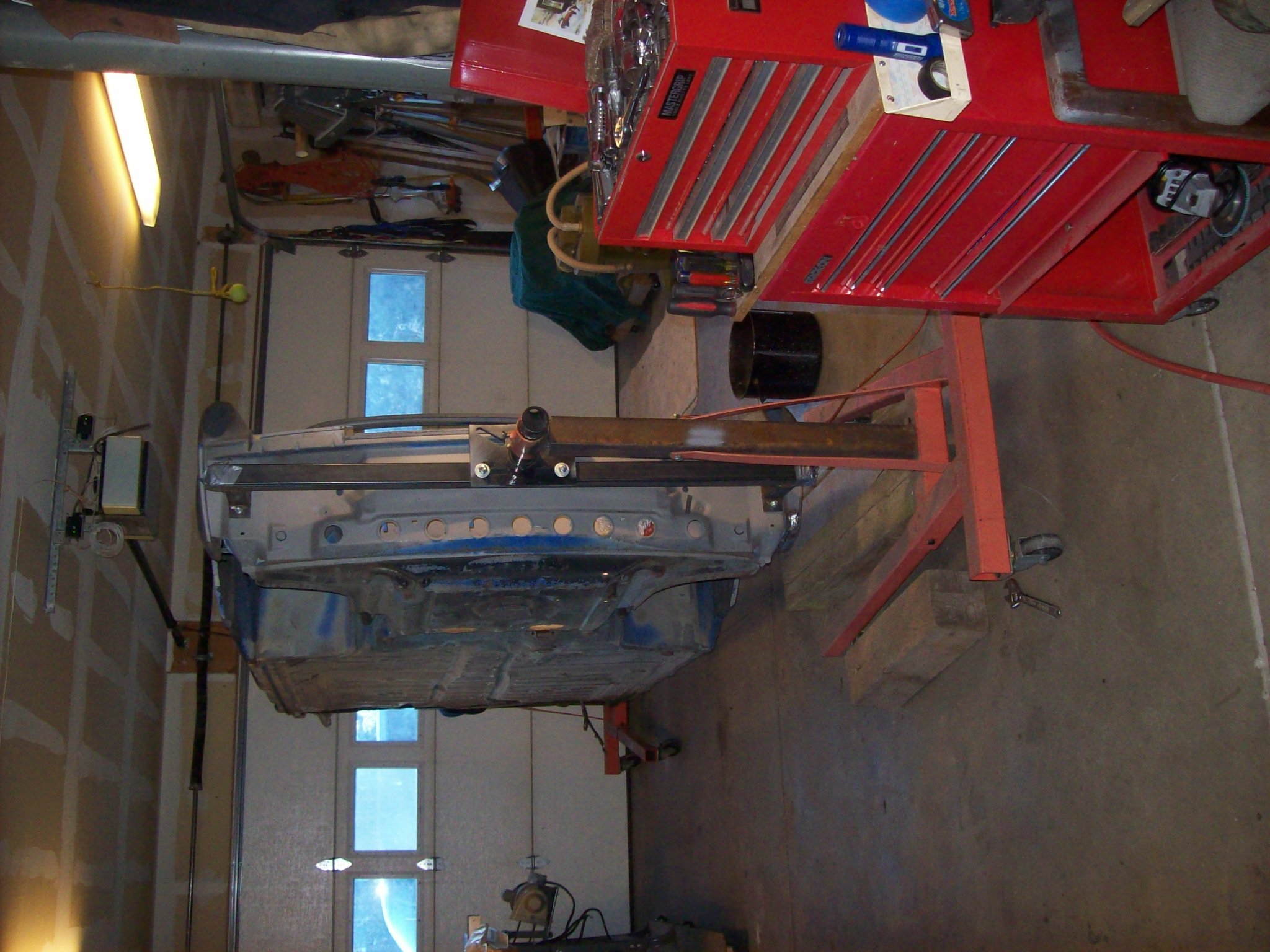 I have been procrastinating (I mean organizing). A tire shop went out of business in Boulder and he had a lot of industrial shelving...cheap. I bought two sets for the shop to get things off the ground. An engine on a dolly takes up the same space on the floor as three engines stacked on shelves. Great way to be economical with space, that's the good news. Bad news is that everything stashed against the walls of the garage on the floor needed to be pulled out for the shelves to be installed. Kind of like cleaning your room as a kid...absolutely hate the idea, but you are glad when it is done. All the cars are off to storage, and the only car in the shop is the 6 on the rotisserie. Frankly the order and space is really nice. Went to S Denver today to help a Pelican friend with the front hood latch gremlin on a car he is reassembling, and he has a huge shop/garage with 20 ft ceilings. But the floor was a disaster. Going vertical is a good thing. I have been practicing welding again...kind of a "girly thing" like ballroom dancing I guess. But I felt out of touch with my welding skills, so I spent a few days welding thin gauge steel to get my confidence level back up. I have a lot more welding to do on this car, and some of it is complicated. I circled the car a couple times to see what I could start with that was relatively easy. I didn't want to fabricate...so I needed to find something that I cut out of the donor car that I could use to repair a section. Left front lower corner behind the bumper is where I will start.