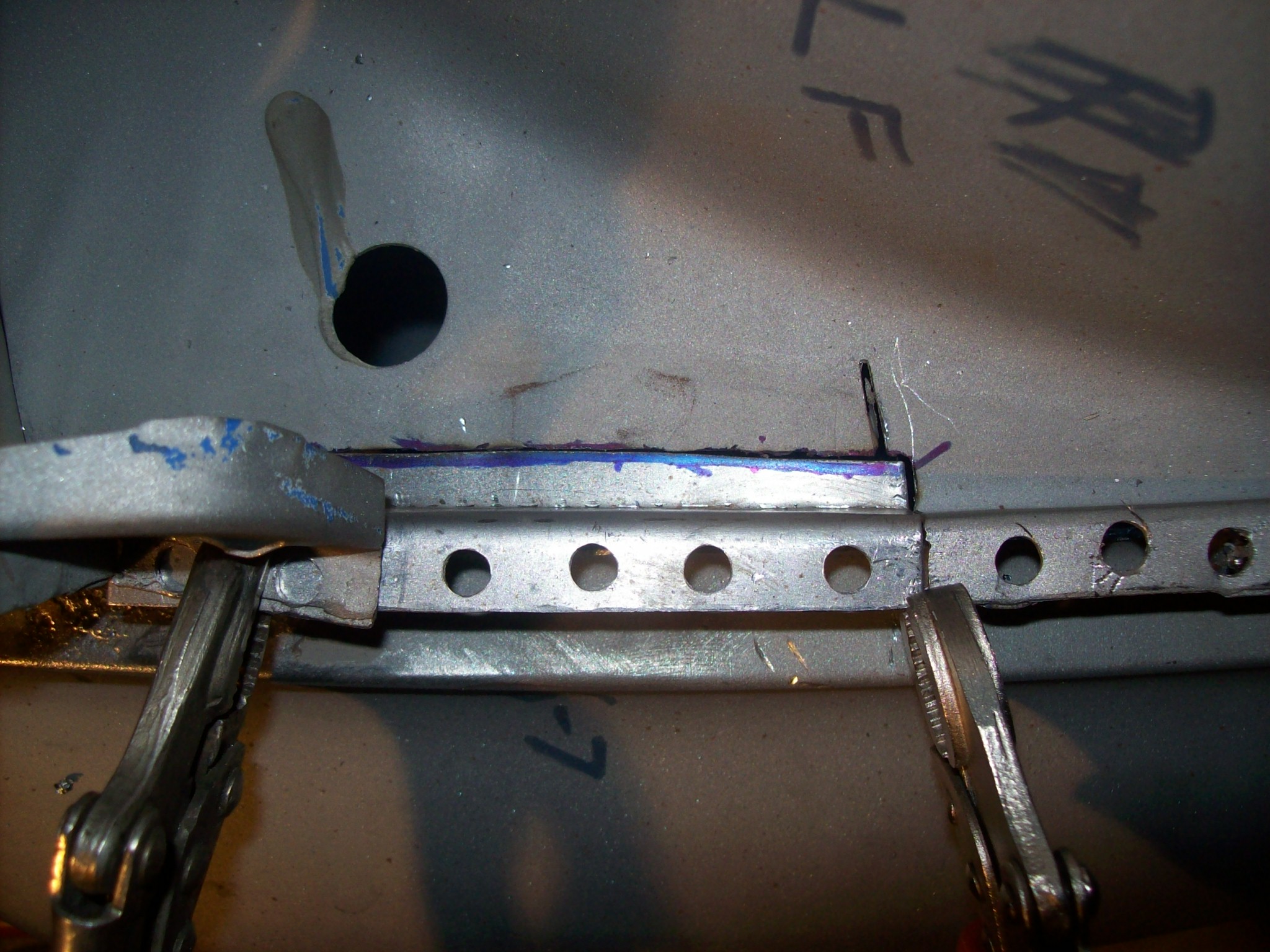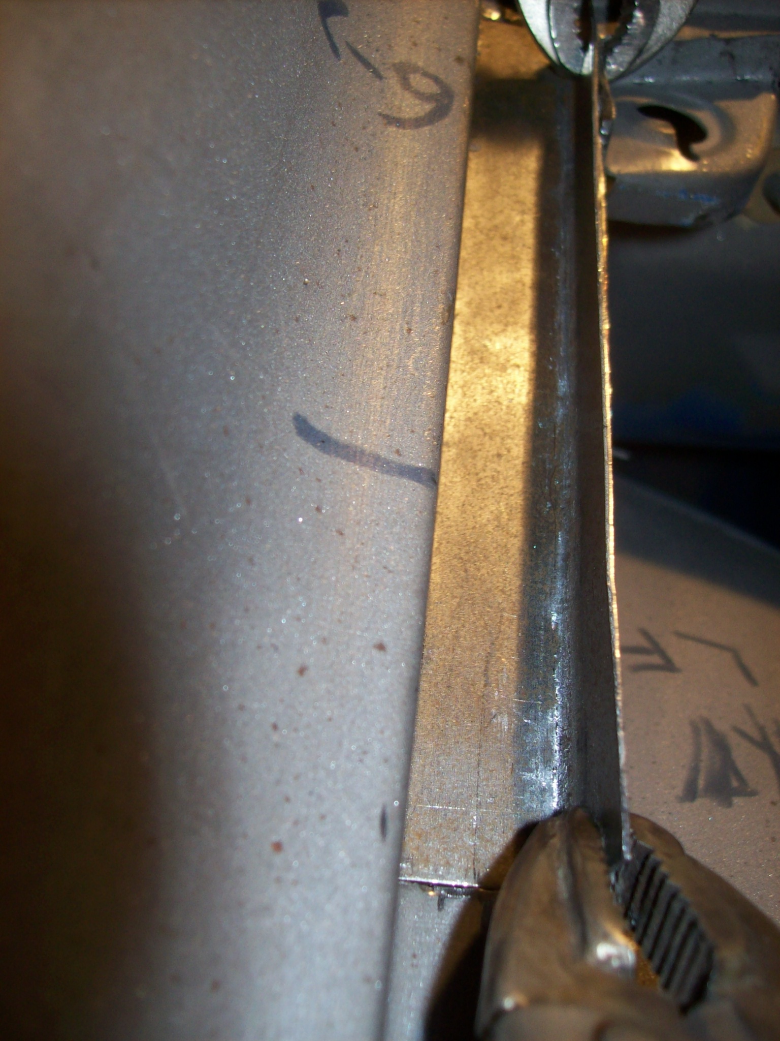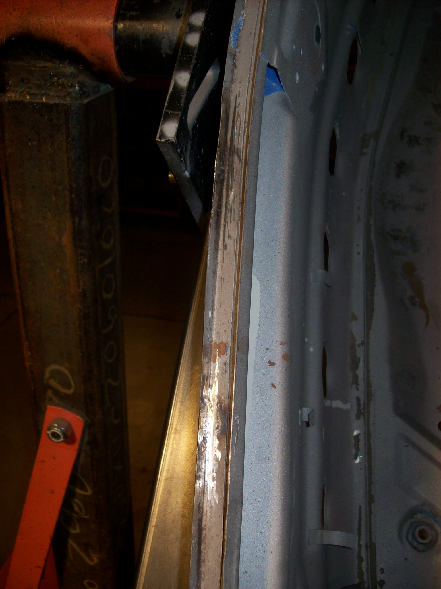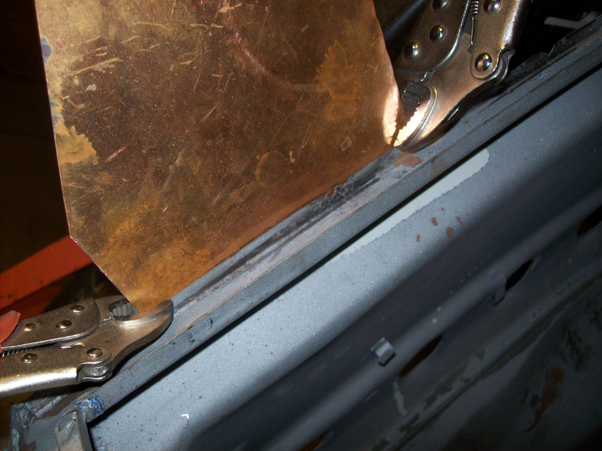 Done. Now I have some weak areas on the channel that need to be replaced or repaired. I normally would replace the weak sections, but I have been experimenting with building up the steel by welding in material. Kind of like welding toilet paper. I am using a MIG not a TIG so I have to be careful not to breathe or burp. This is how I set it up... There were 6 areas in the front trunk area that had weak channels. I used the same copper back shield to build up material and a series of flapper wheels to take down the excess. Worked great. A lot easier than splicing in short pieces of angle. |