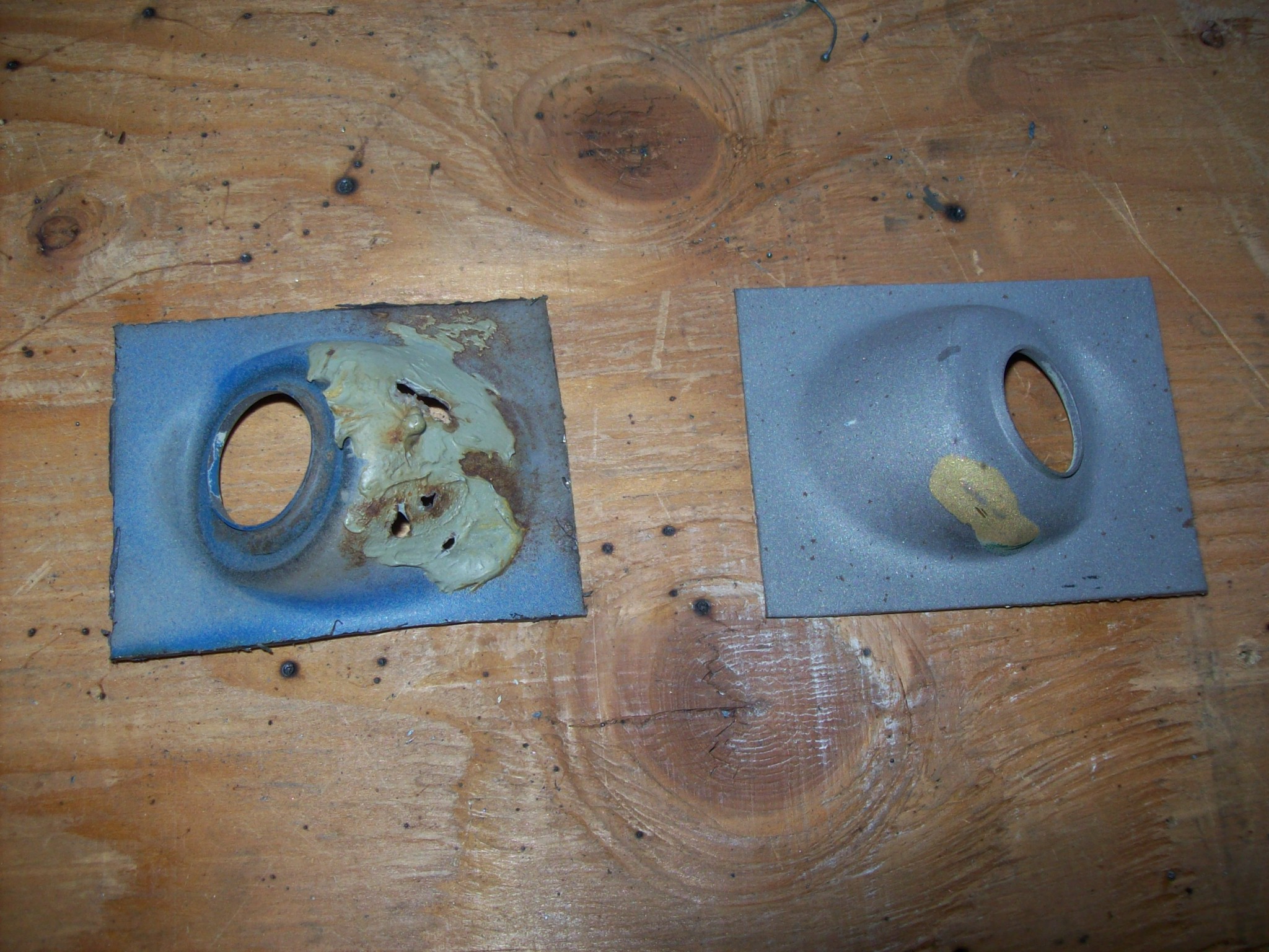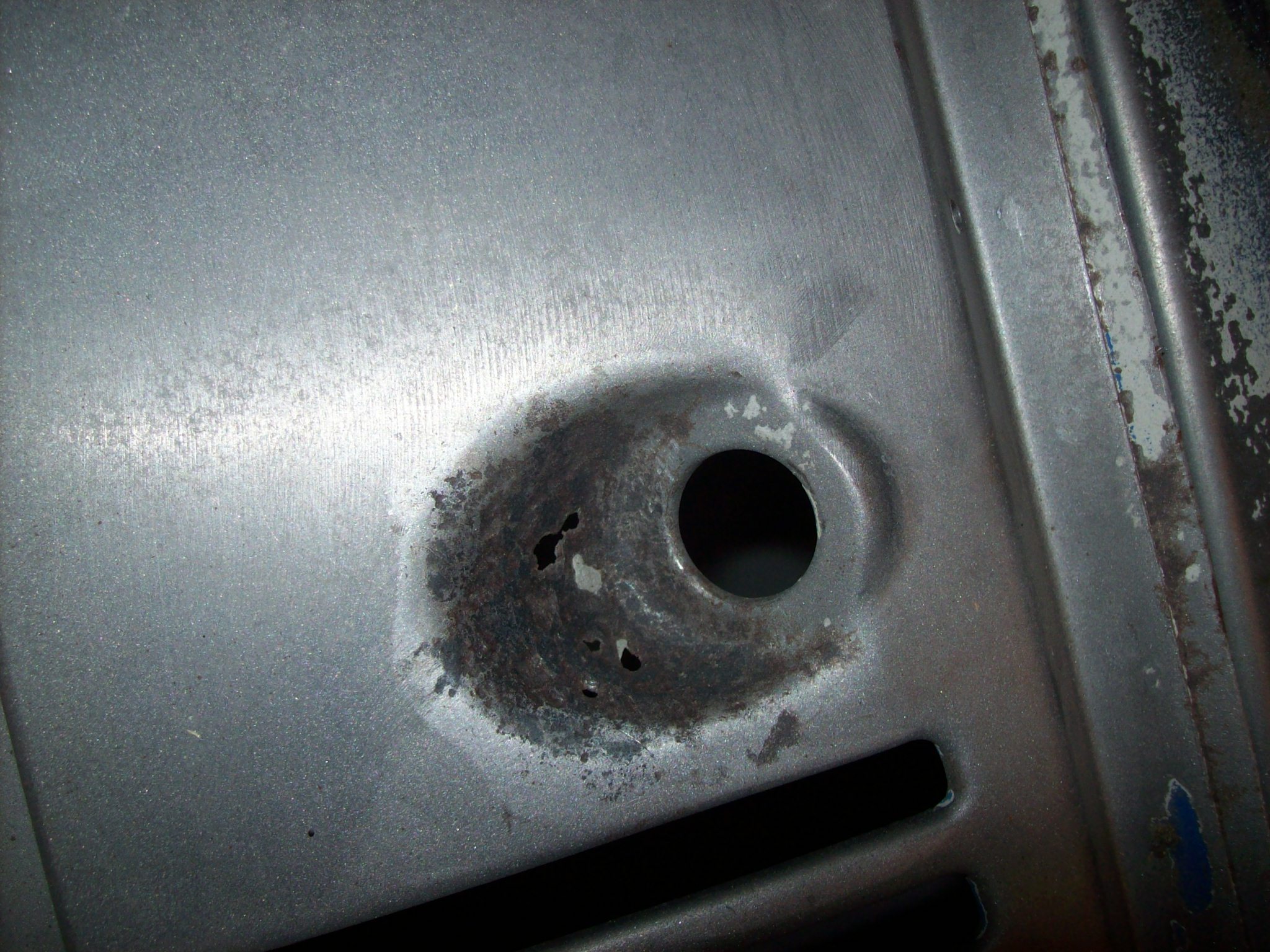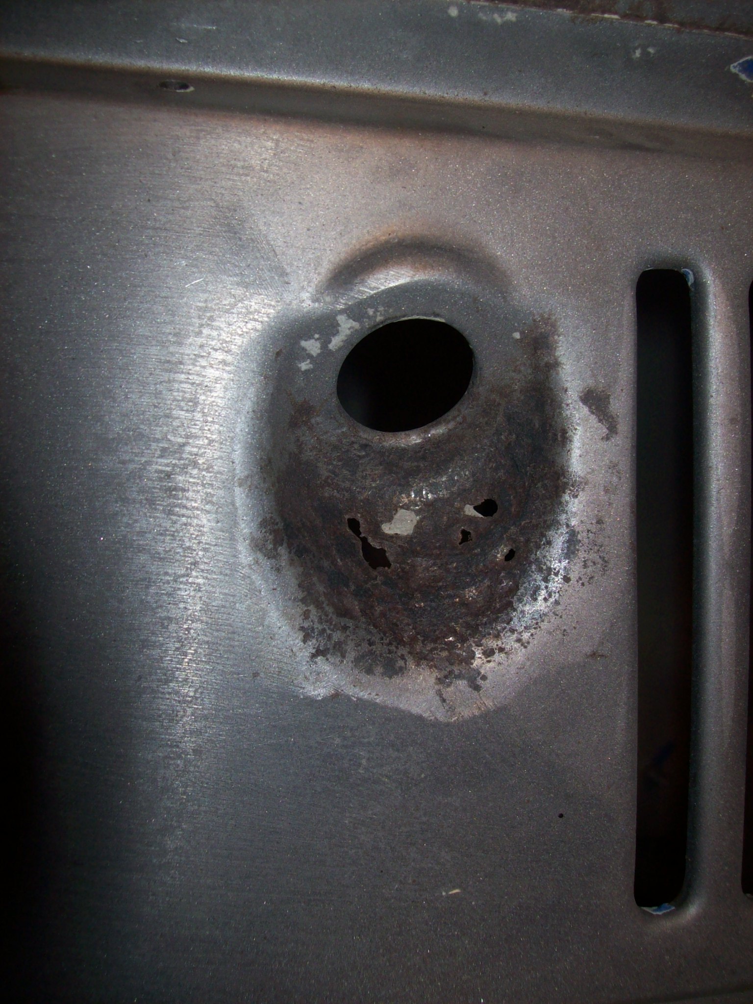 Passenger hood corner is thin and I will use some copper backing to build it up. Rust is all gone, and it is non structural...plust it will be hidden by the hood gasket Backside shows that it is not serious With a copper heat sink behind this was welded, cleaned up and we moved on As we continue clockwise, I have an issue with the catch-all are behind the passenger door latch (I have the same issue on the drivers side). This too will be tricky as it is very visible and mistakes not easily hidden. I will peel back the layers of the onion tomorrow. Looking up from the forward side of the rear wheel well...there is a ton of factory under-coating and or seam sealer in this area. I am thinking I am going to be heating with a torch and scraping to get this area cleaned up so I can see exactly how far the rust has intruded. Speedo |