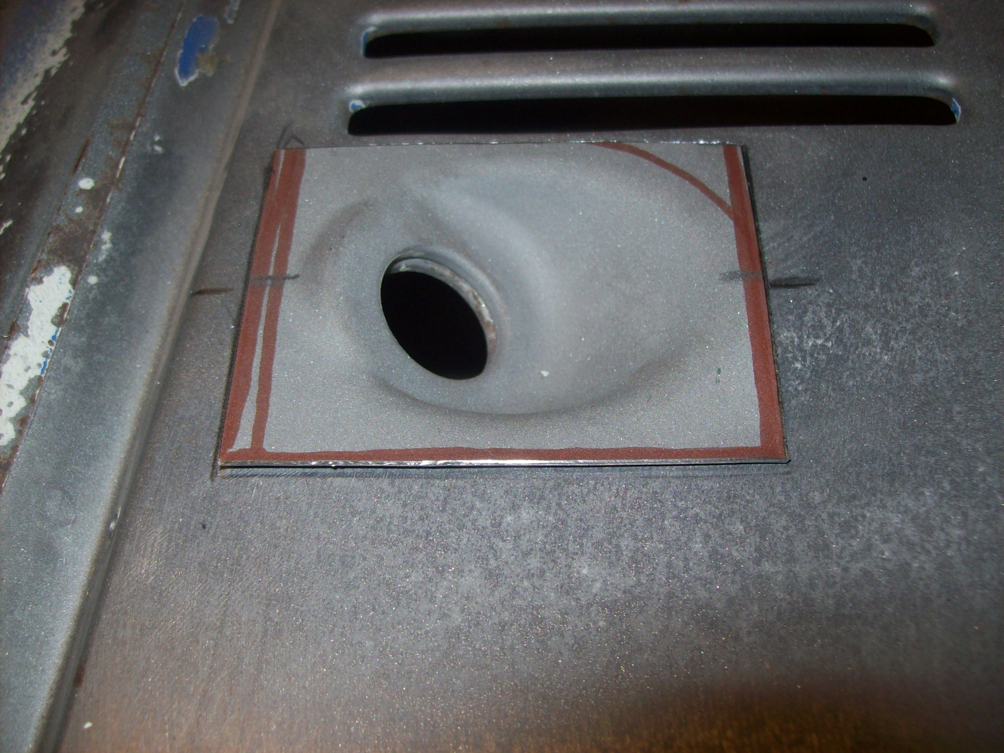 I was going to cut an oval to avoid the 90 degree corners but decided against it. Scribing using the donor to determine how much steel to remove...too little will be trying to weld rusted thin steel, too much will encroach on the vents in between the wipers.