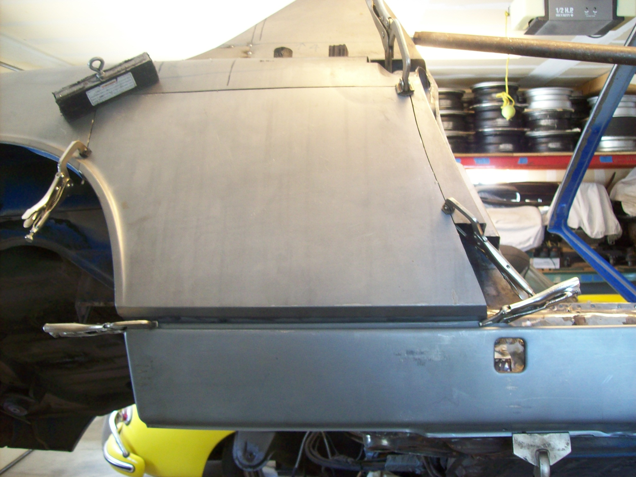 No issue with the resourceful information. No hijack interpreted. Lots of different ways to skin this cat. An old mentor of mine, Grady Clay was always pushing me to reinforce the weak points on this chassis....and not for purposes of racing, but strength and longevity. The inner rocker is fluted for stiffness, and to allow for the stamping to retain shape. The jackpoint however staunchly reinforced, will transfer impact through the rear cockpit wall separating the two sides of the longitudinals. My reinforcements in this area provided strength but also allowed for easier welding of my splices. I jigged my sectioned q-panel in place... And clamped up the "centered" outer rocker This allowed me to figure out exactly where the receiver and reinforcement needed to be. The captured nut under the inner rocker was not exactly centered under the outer rocker receiver hole. Glad I didn't assume that...and thanks to Luke and Brant for sending me pictures to try to help position the outer rocker. This was the correct way to do it. My original placement marks for the receiver against the inner rocker would have been "off" by 1/4 inch...not a deal breaker, but that would have required making up the difference by modifying the opening in the outer rocker Squared up in the correct position and ready to be prepped for welding. I will probably use rosettes around the perimeter then spaced beads along the outside. Luke, why is your entire longitudinal sectioned and removed from the chassis? Do I want to know? |