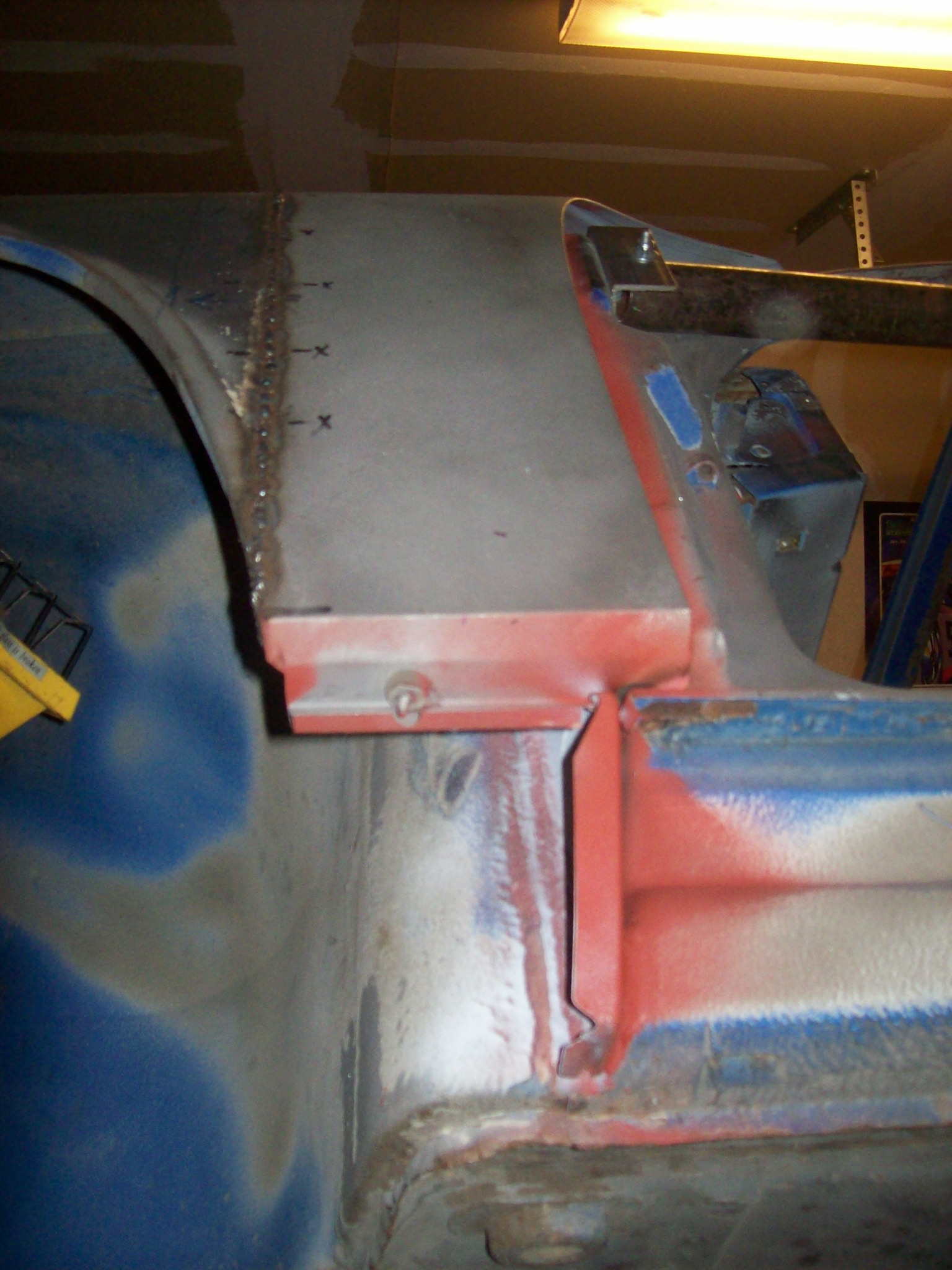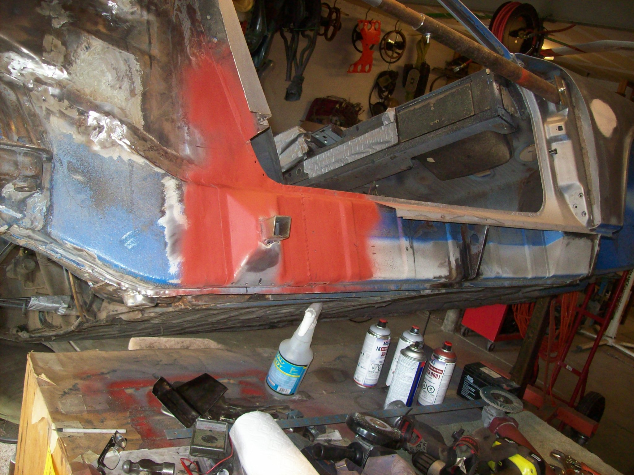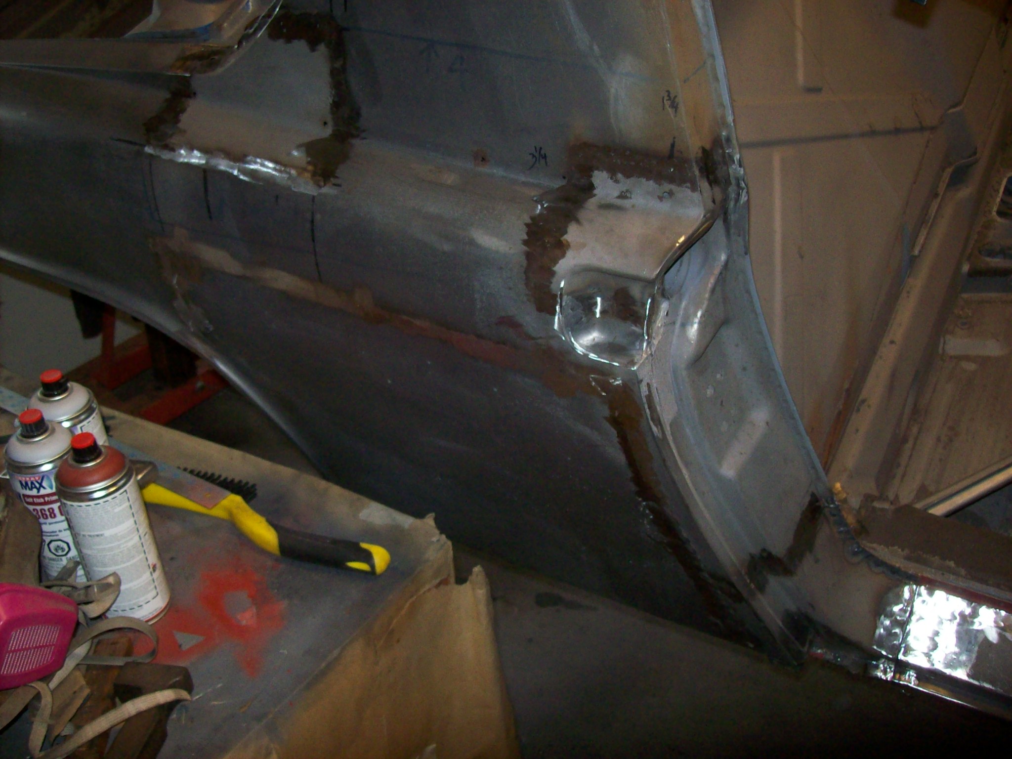 Met with my potential painter yesterday. He doesn't do lead, but he loves All-Metal. Not sure how much more I am going to do before "handing off". I will dolly some of the welds, and level the floor dings...and probably some last minute welding. Initially I proposed getting the car upside-down and scrubbing the floor and wheel-wells to get down to undercoating or where the undercoating is scraped off... to steel. Then I was going to prime the bare metal and Schutz the floors. He suggested not doing that and instead allowing him to mount the chassis on his rotisserie and take it back to his sandblaster in Denver. With the chassis on its side they will be able to remove all the undercoating, grime and oil so that the underside of the car is bare like the top of the car. Then he will prime the entire car, and I will come back and seam seal and undercoat the bottom of the chassis. He will then prep and paint top and bottom. Let me know what you guys think...