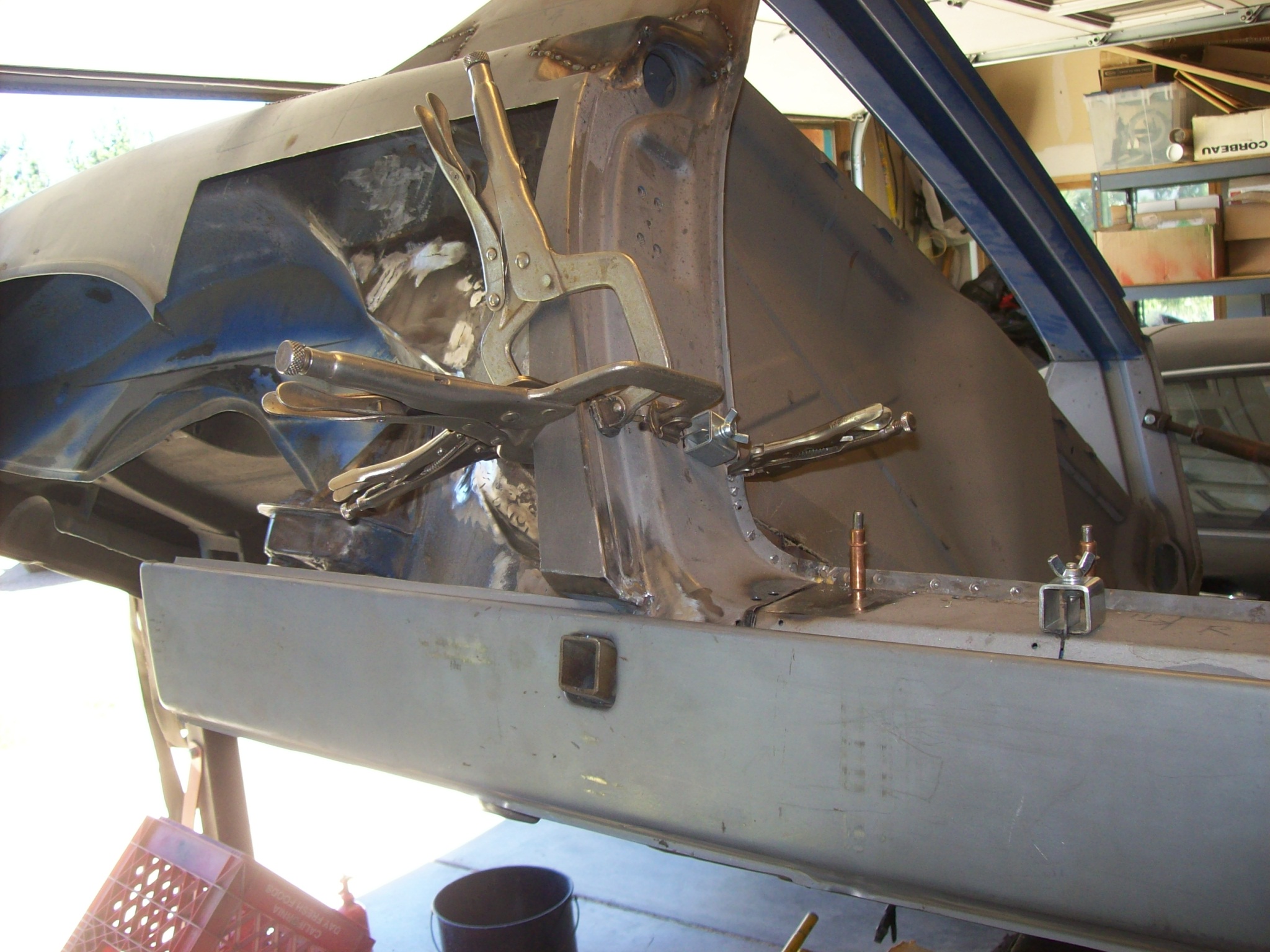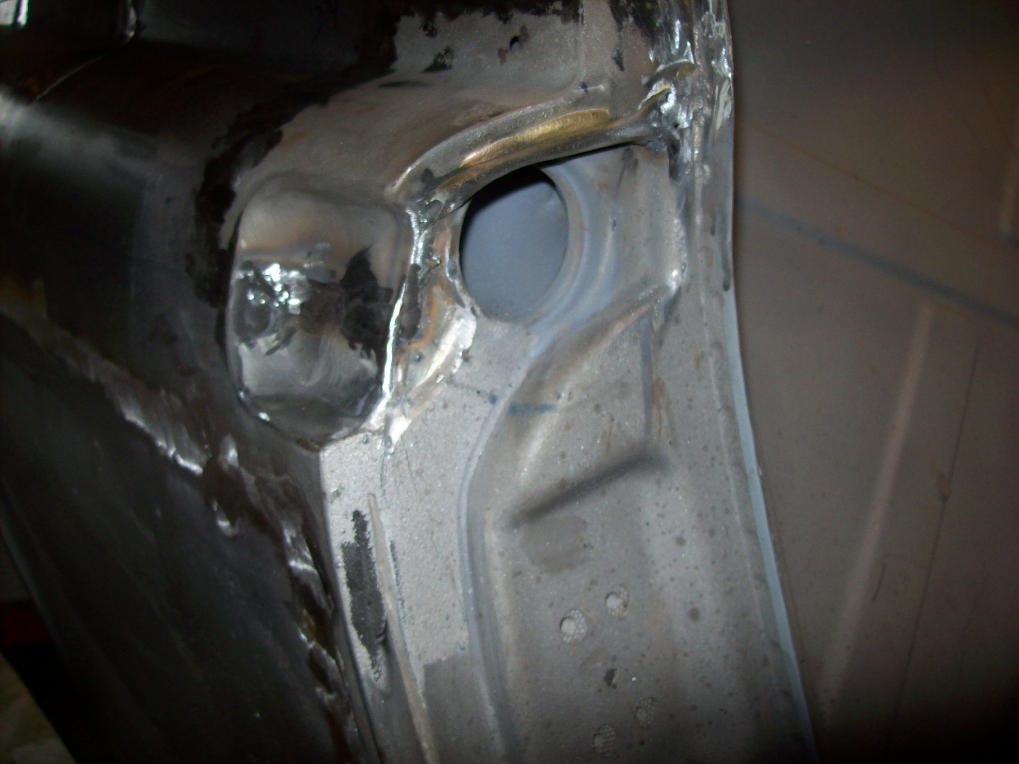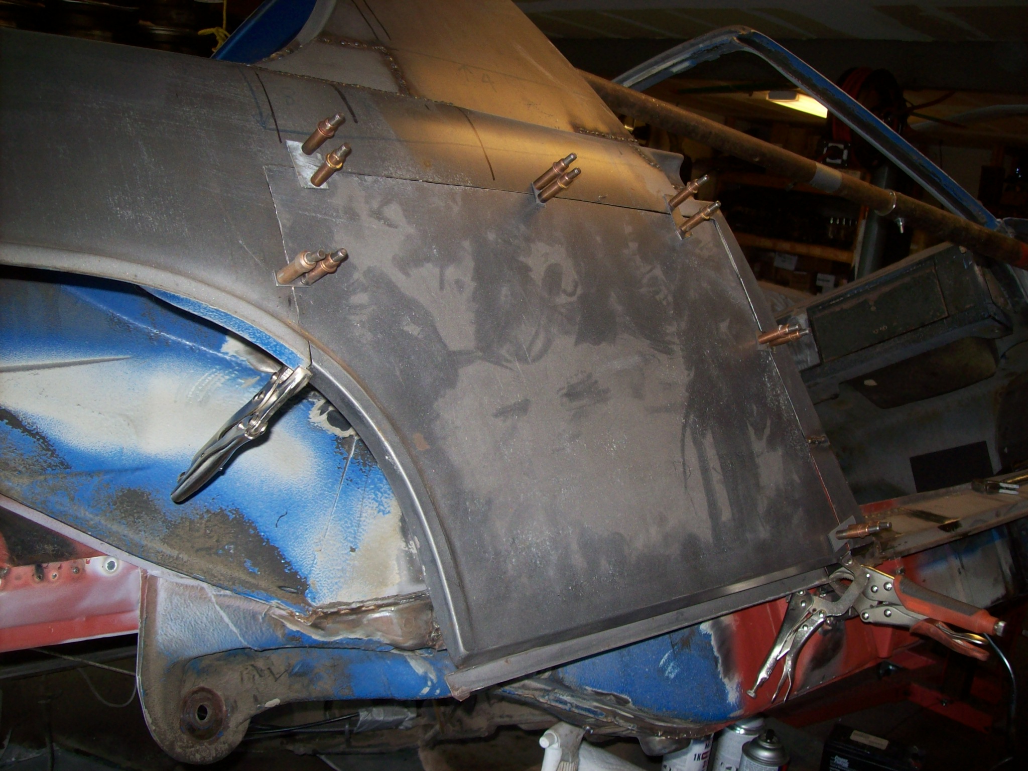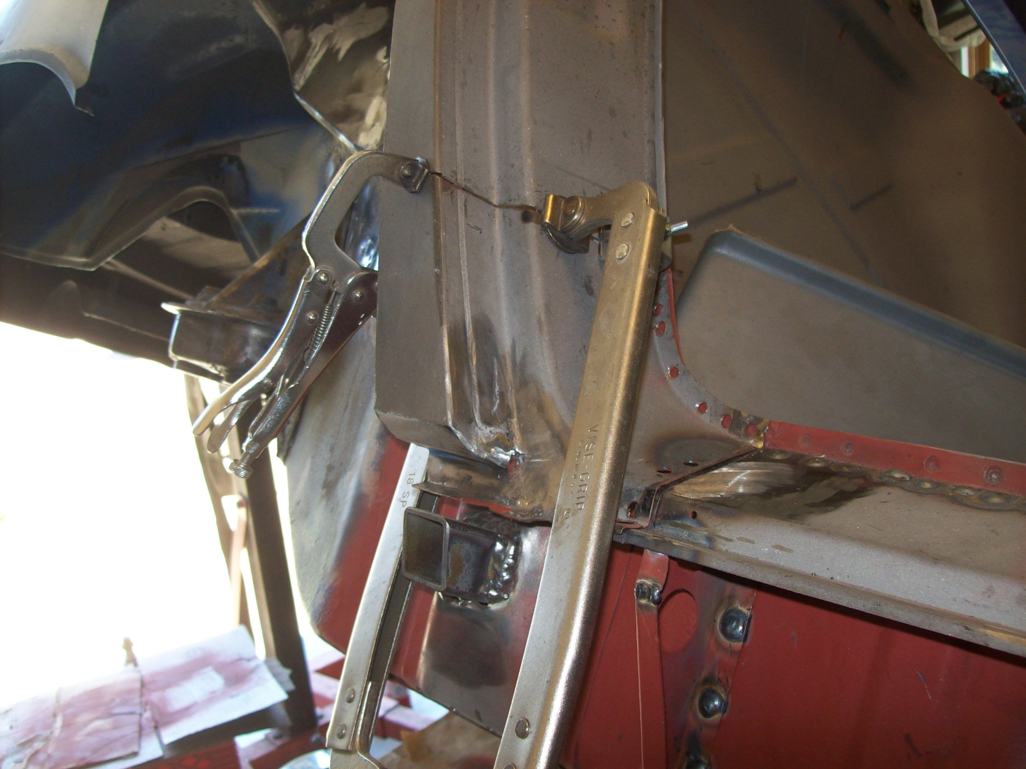 Moving on...welding back in the repaired bottom of the lockpost worried me. Quarter panel was removed which allowed the lockpost to "float". The bottom of the lockpost had welded so the shape might have changed slightly. I measured and triangulated and compared the dimensions with the drivers side 1000 times. I had to "muscle the steel in place to weld using clamps and voodoo.