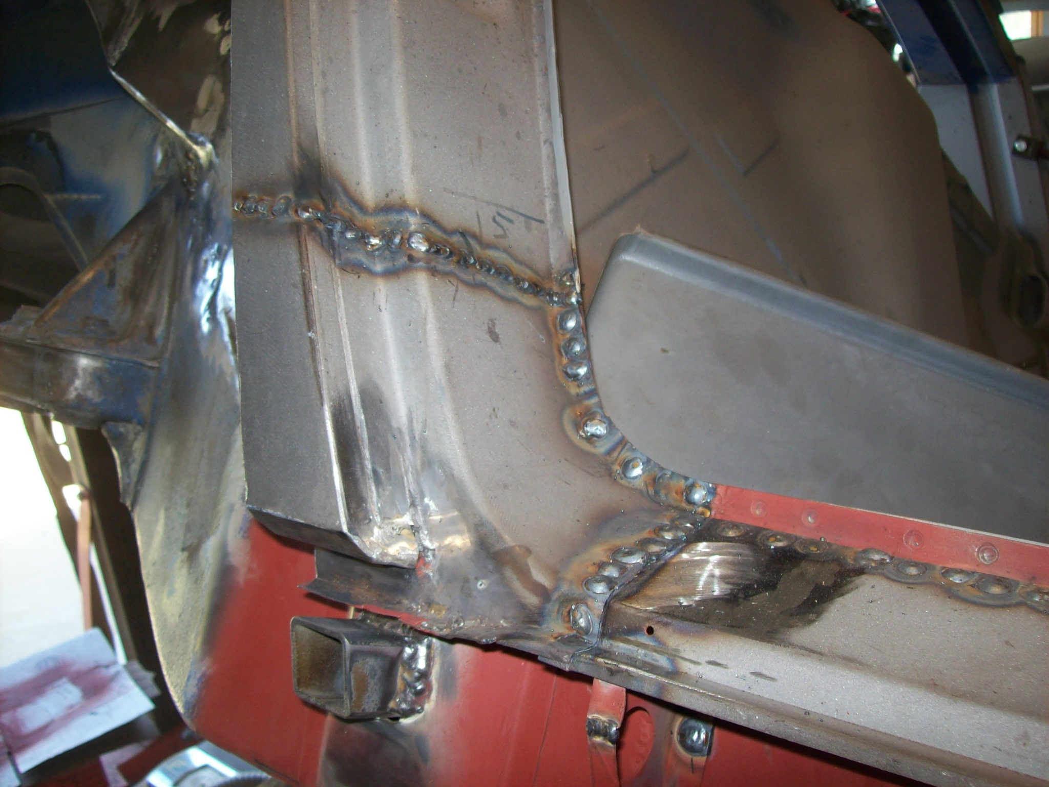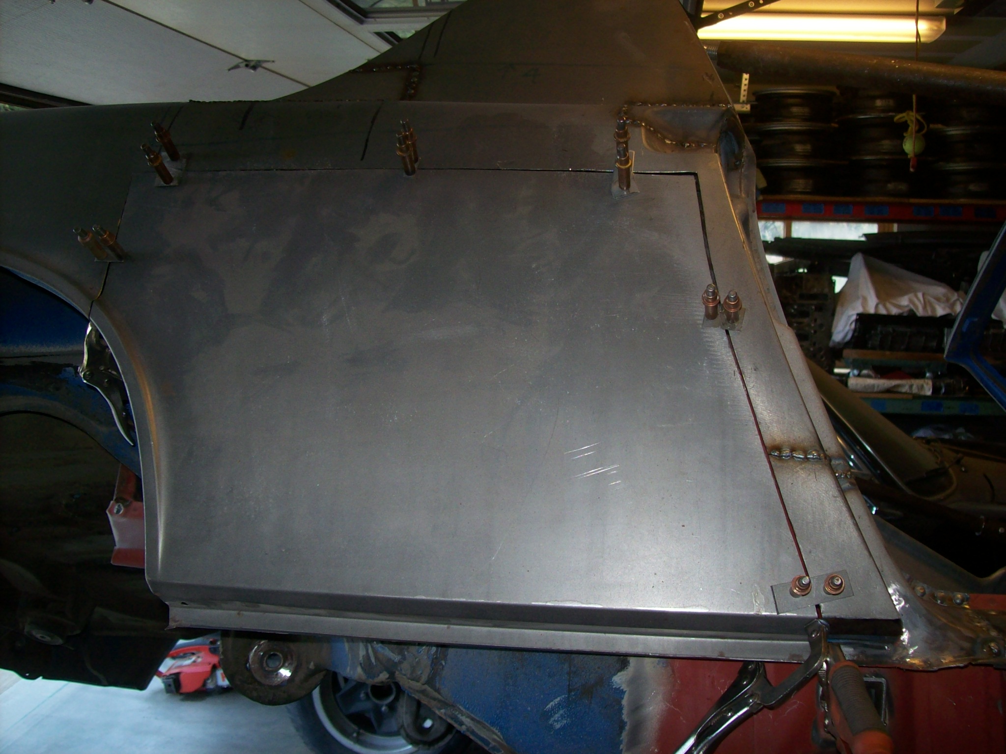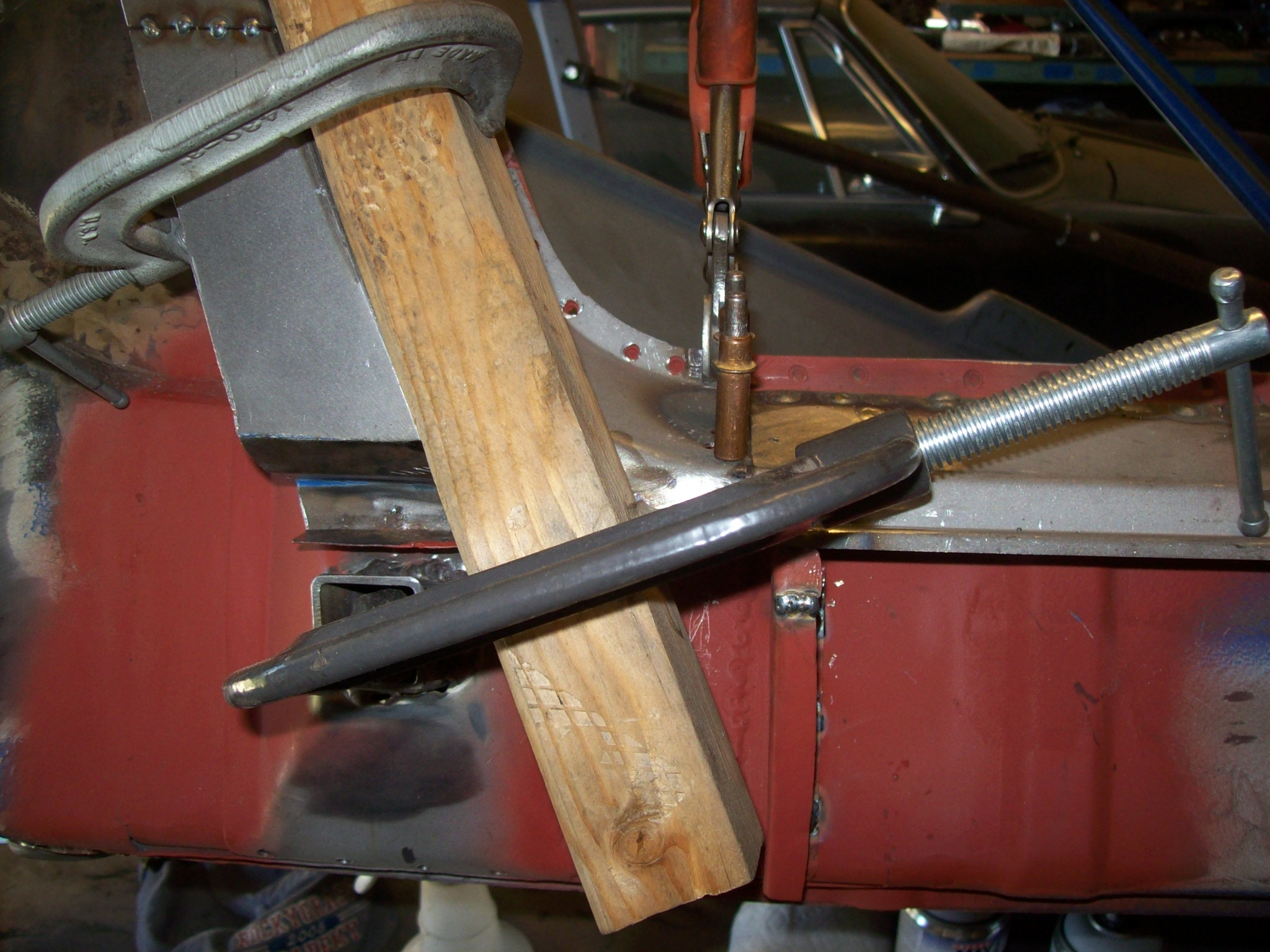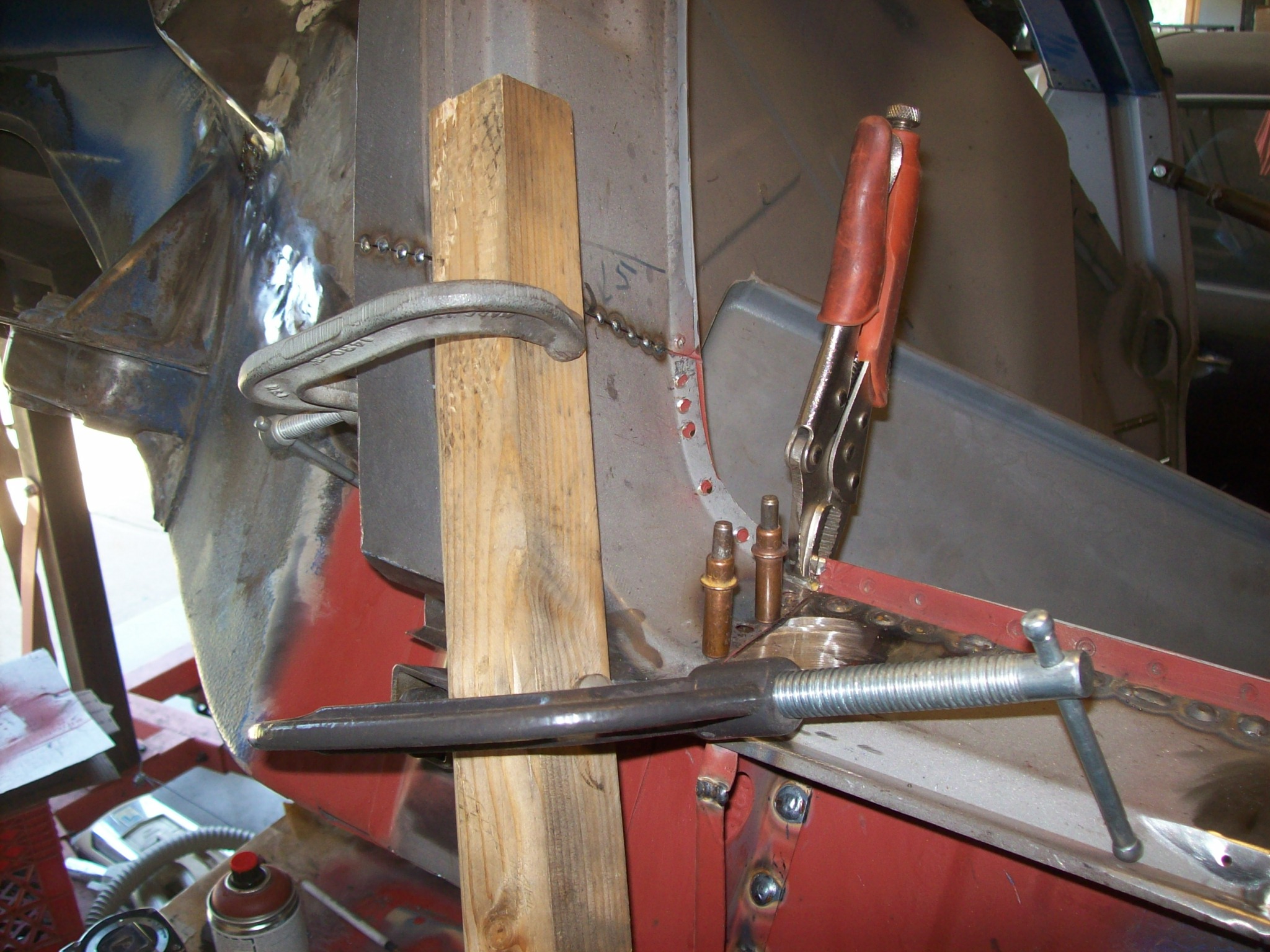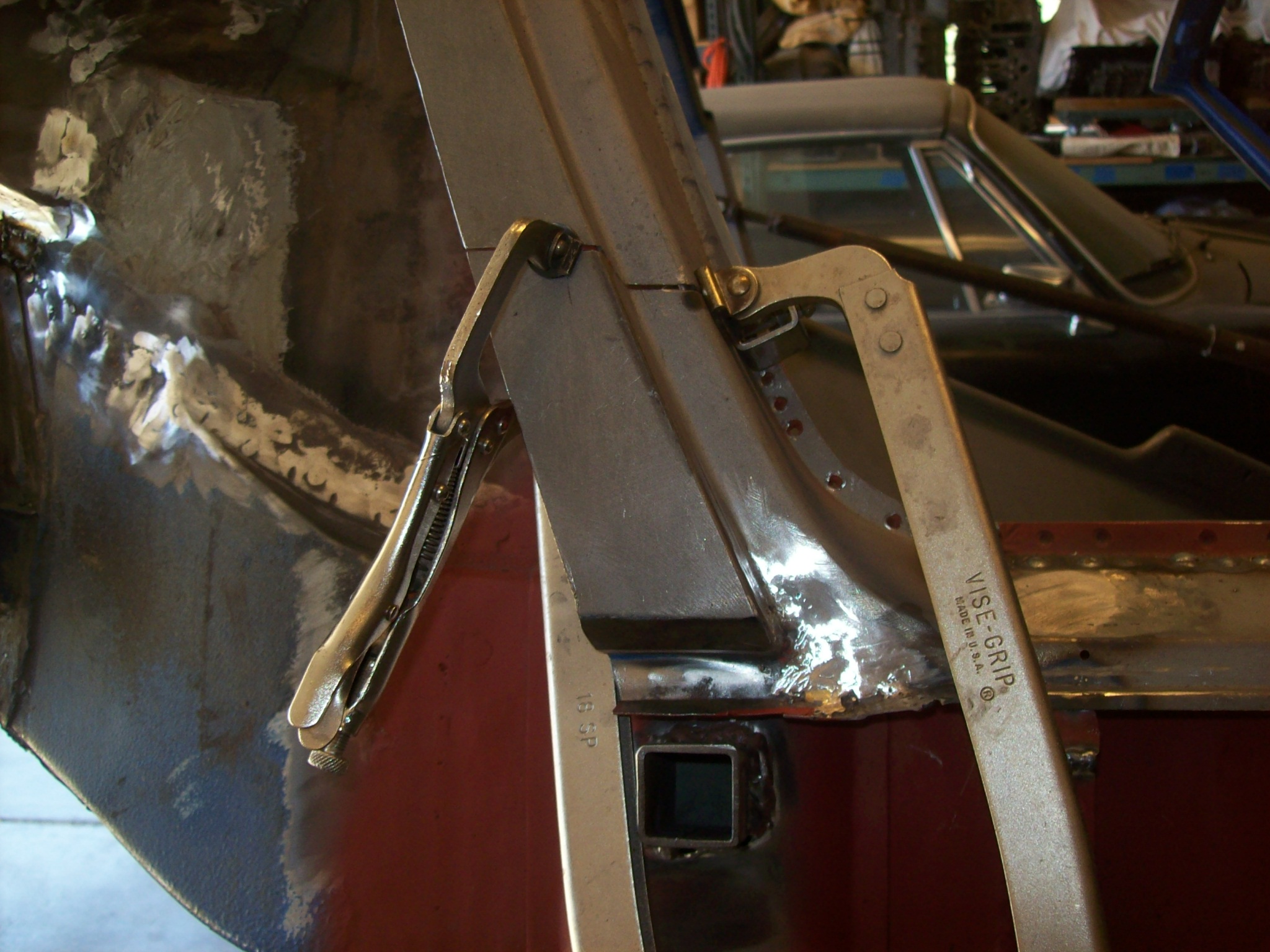 Moving on...welding back in the repaired bottom of the lockpost worried me. Quarter panel was removed which allowed the lockpost to "float". The bottom of the lockpost had welded so the shape might have changed slightly. I measured and triangulated and compared the dimensions with the drivers side 1000 times. I had to "muscle the steel in place to weld using clamps and voodoo.