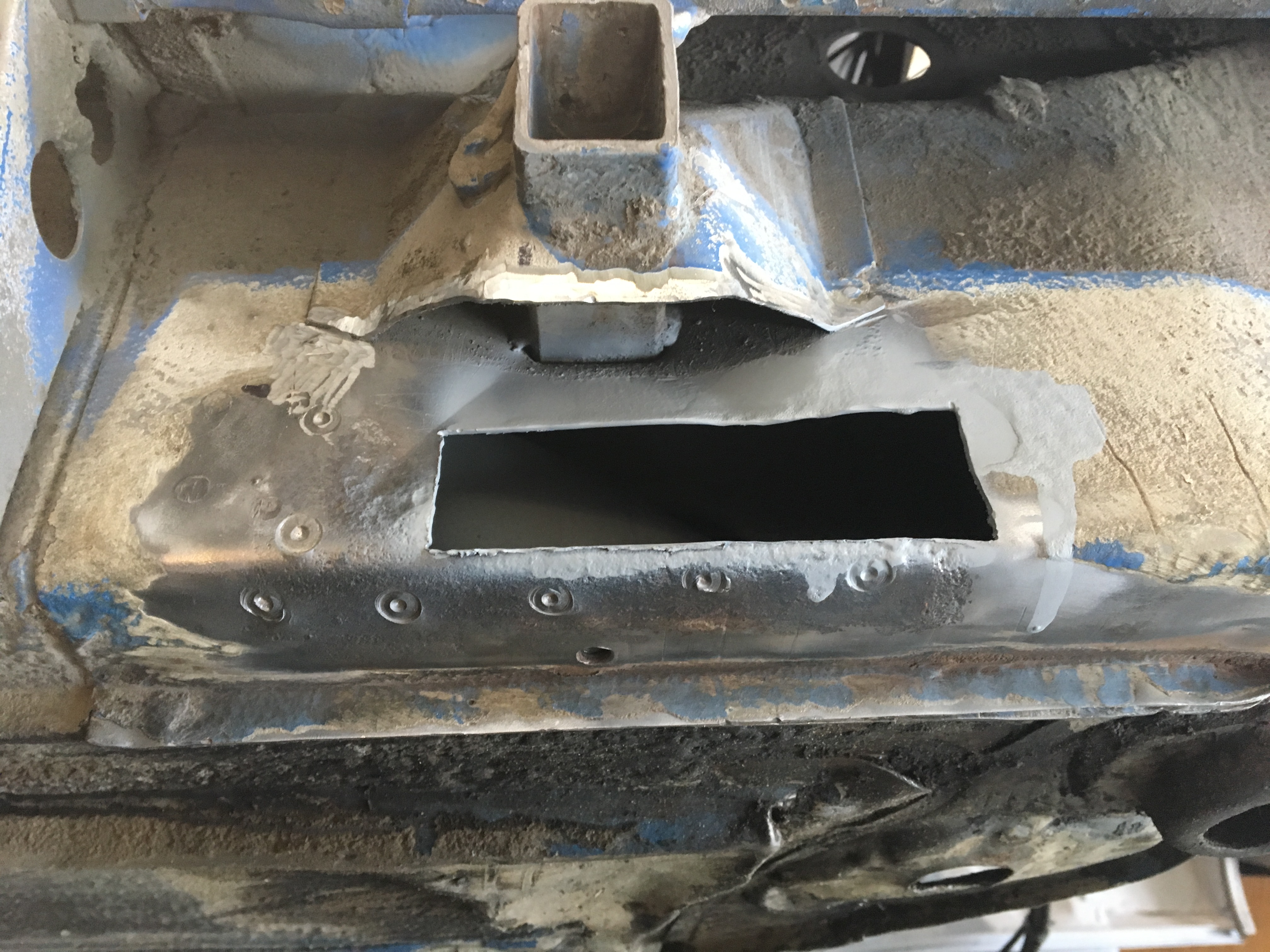There was this nagging pinhole in the drivers jackpoint. I was sure it was just a flaw in the steel. No rust anywhere to be seen, so probably just a fluke. It was bugging me...and no sense working on massaging the body and ignoring this little bugger. I drilled a larger hole through the pinhole, and unfortunately the drill bit went right through with little resistance. Now looking inside, I see a lot of debris. Some of it is blast media (of course) but some of it is flaky and rust colored. I drill a couple more hole as I am in denial, and it looks worse. Dammit! I cut the lower half of the outer reinforcement off exposing the inside of the jackpoint. More pinholes, so I need to head into the rocker. Fortunately the weak steel is limited to an area 1.5 x 4.5 inches which I remove. I needed to get in here to vacuum media anyway. Once cleaned out, I was able to etch prime. |