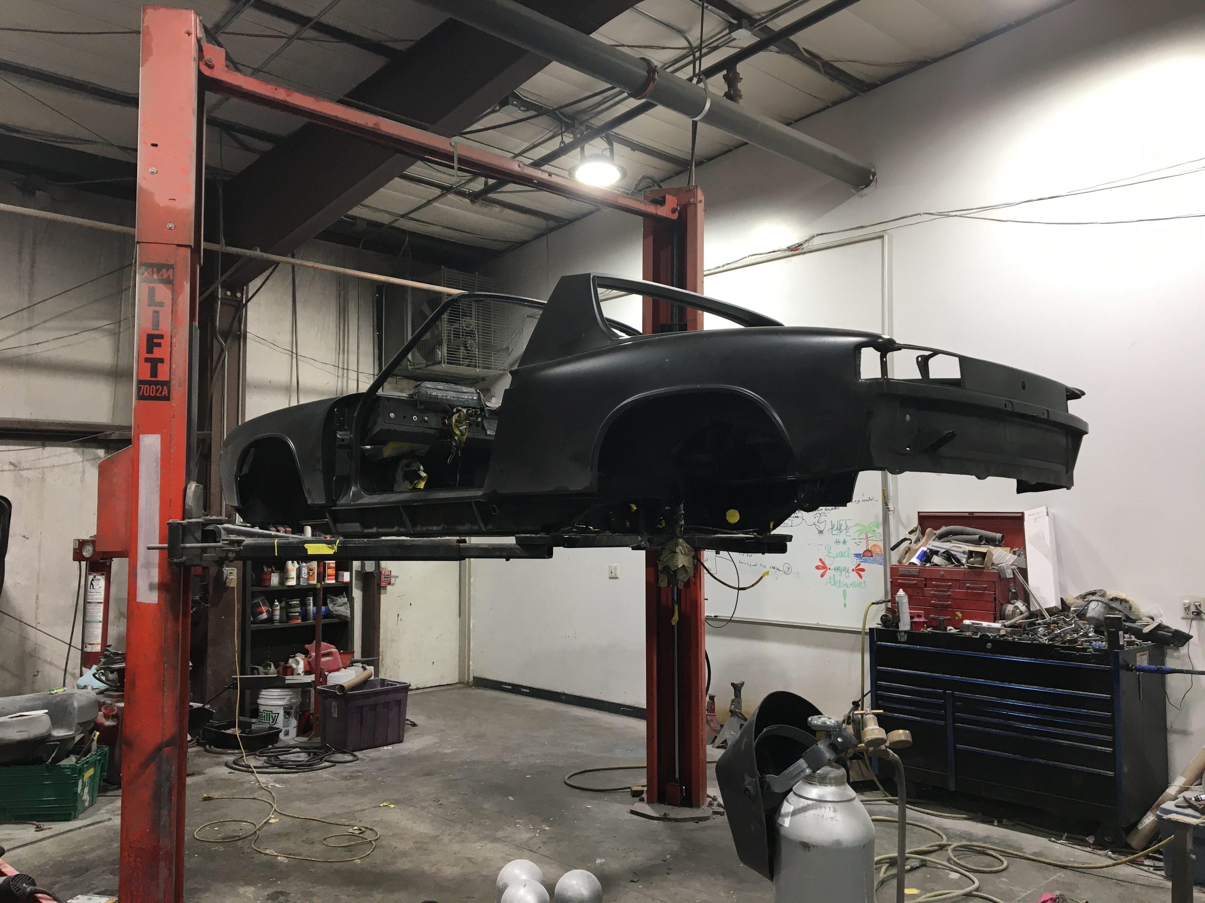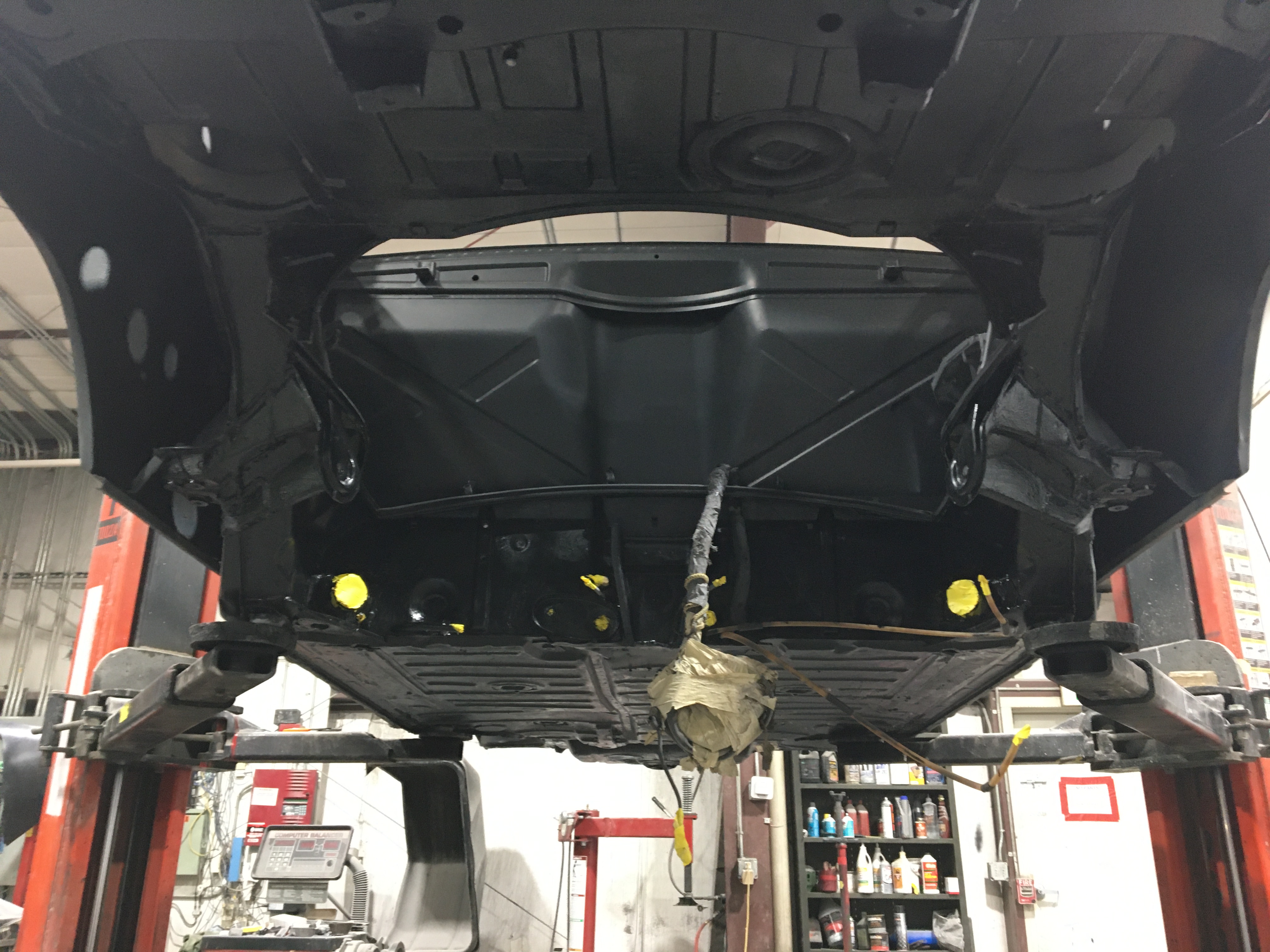 Mig welded the hangar. Spent the afternoon with chassis black. Friday is undercoating. Then color. I'm getting burnt on the underside of this car.