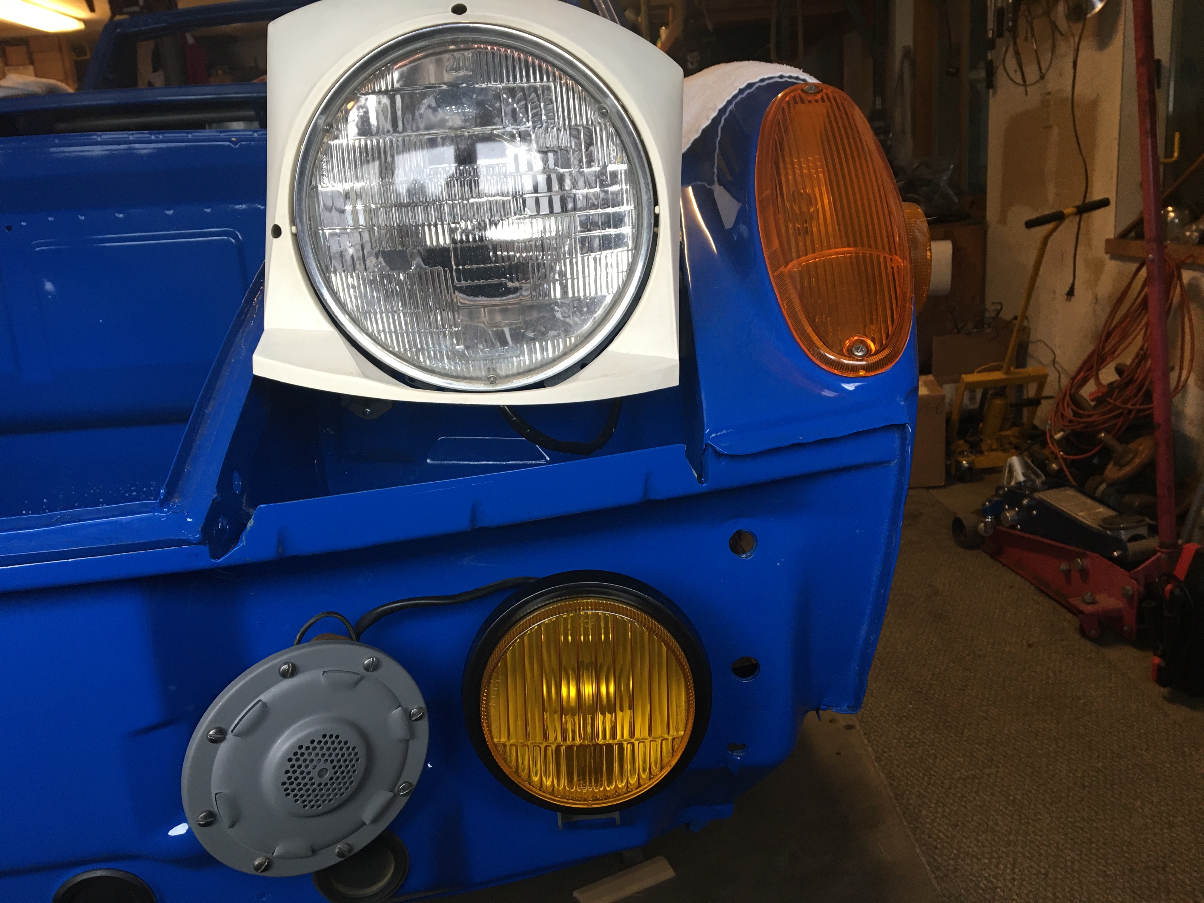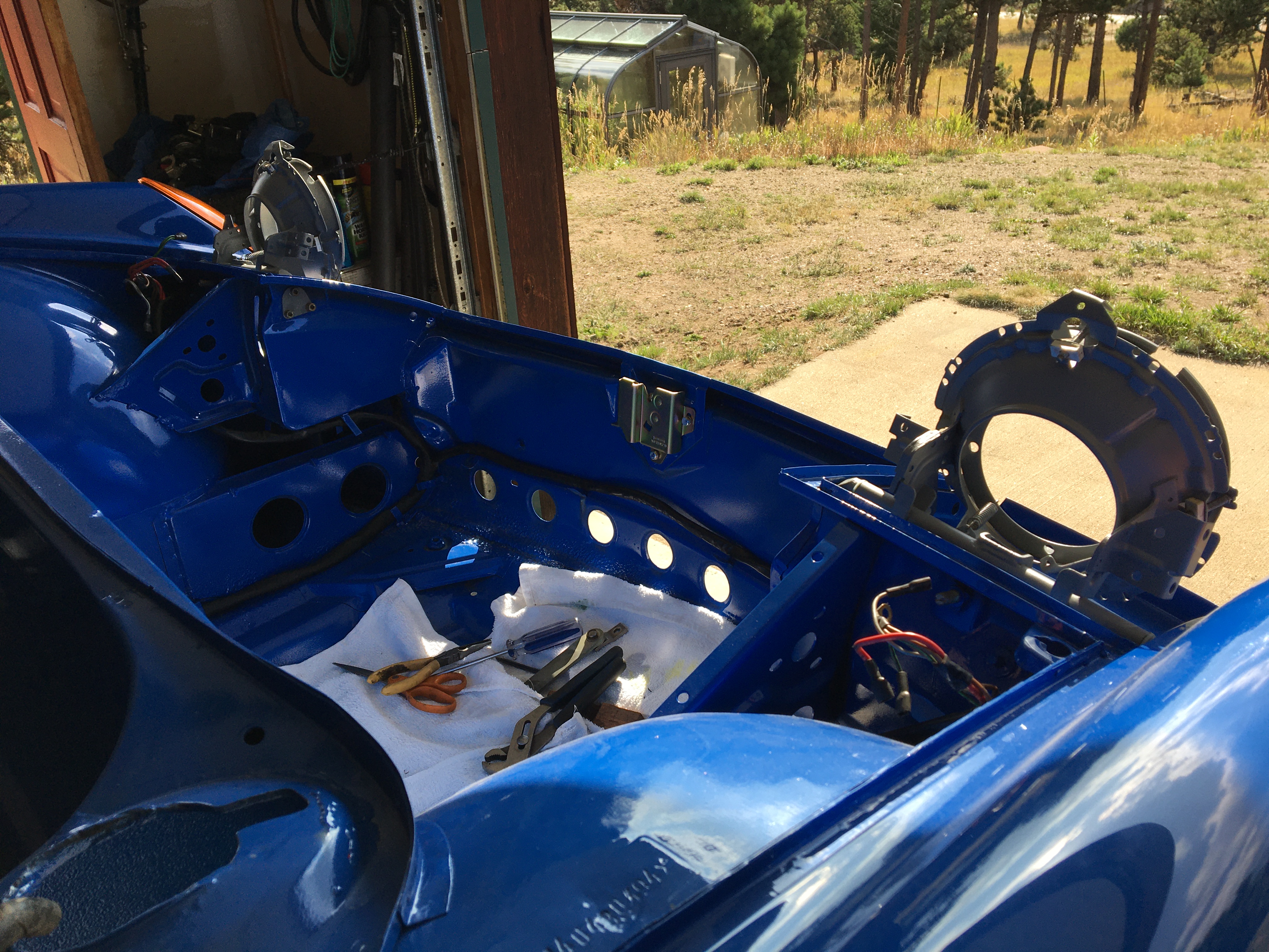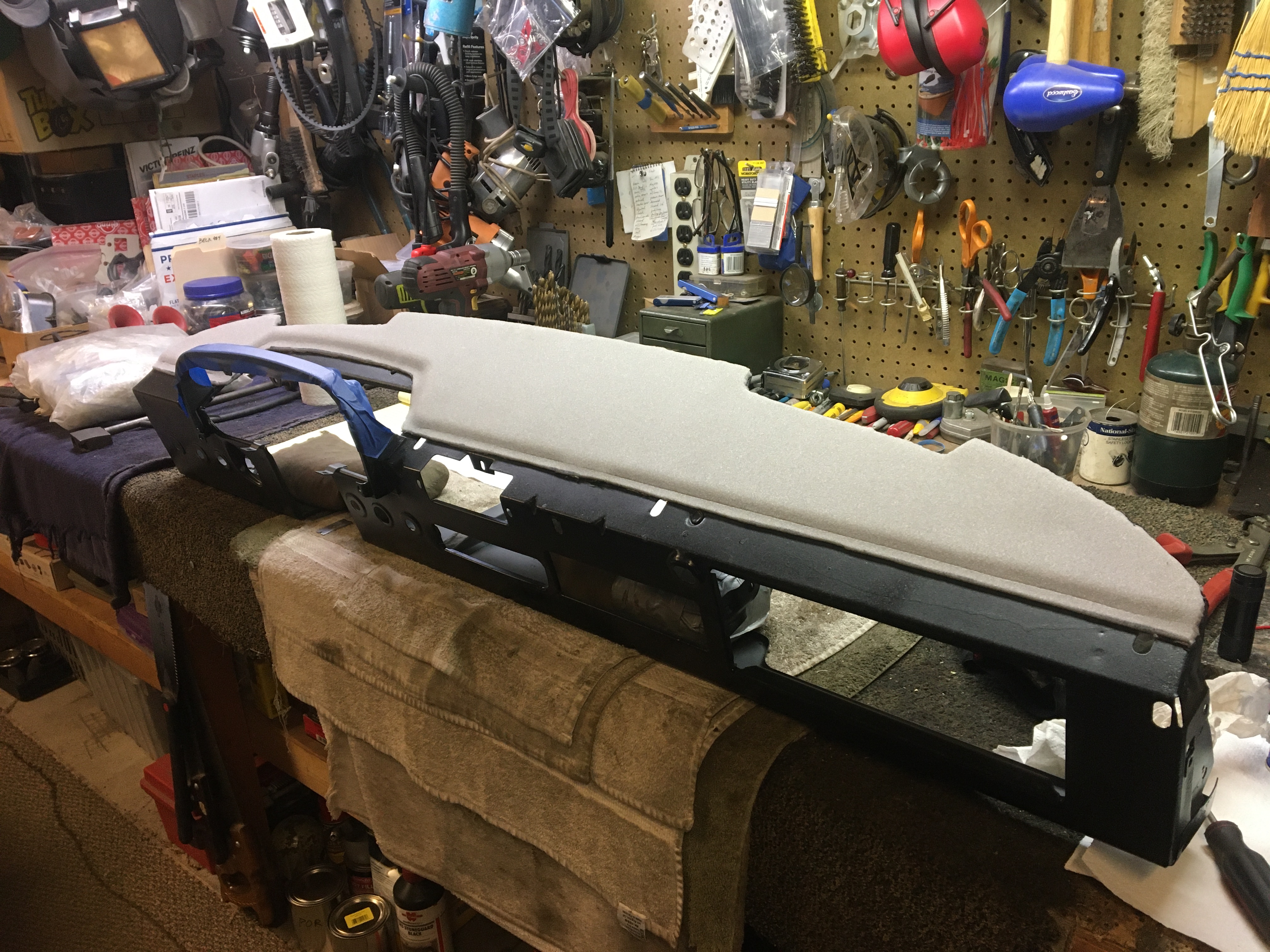 Still working behind the dash on my car. Hardest grommet I have ever installed is the through the panel grommet for the 3 wire heater controls to the blower. Cannot install the blower till I run the wires. Can't run the wires till I have the dash in place. Can't put the dash in place till the top is re-upholstered and new dash installed. Gotta re-basket-weave the face at the same time. Worked on the front of the dash today, finished the caliper re-builds and installed the new fog lenses (thanks Brant!). |