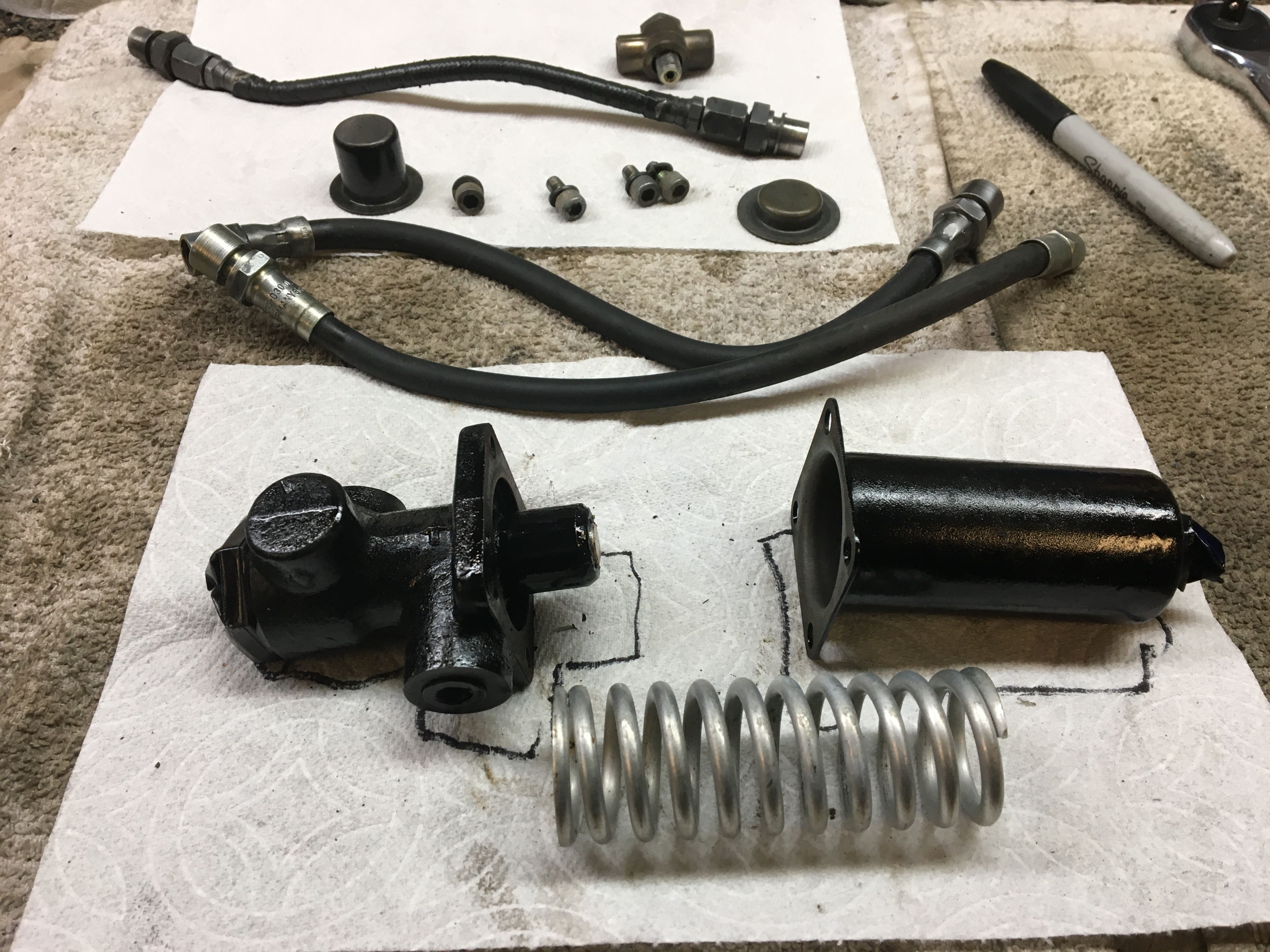 Brake lines, axles and suspension. Cleaned up (scotchbrite/paint-thinner/clearcoat) my brake lines and refurbed my pressure regulator. I'm pretty pissed off at the guy (me) that bent the crap outta the brake lines when he dis-assembled the car. Re-fitting the lines has been a challenge as none of them wanted to fit. Felt like I was trying to install Toyota brake lines on a 914. Pressure regulator rehab...