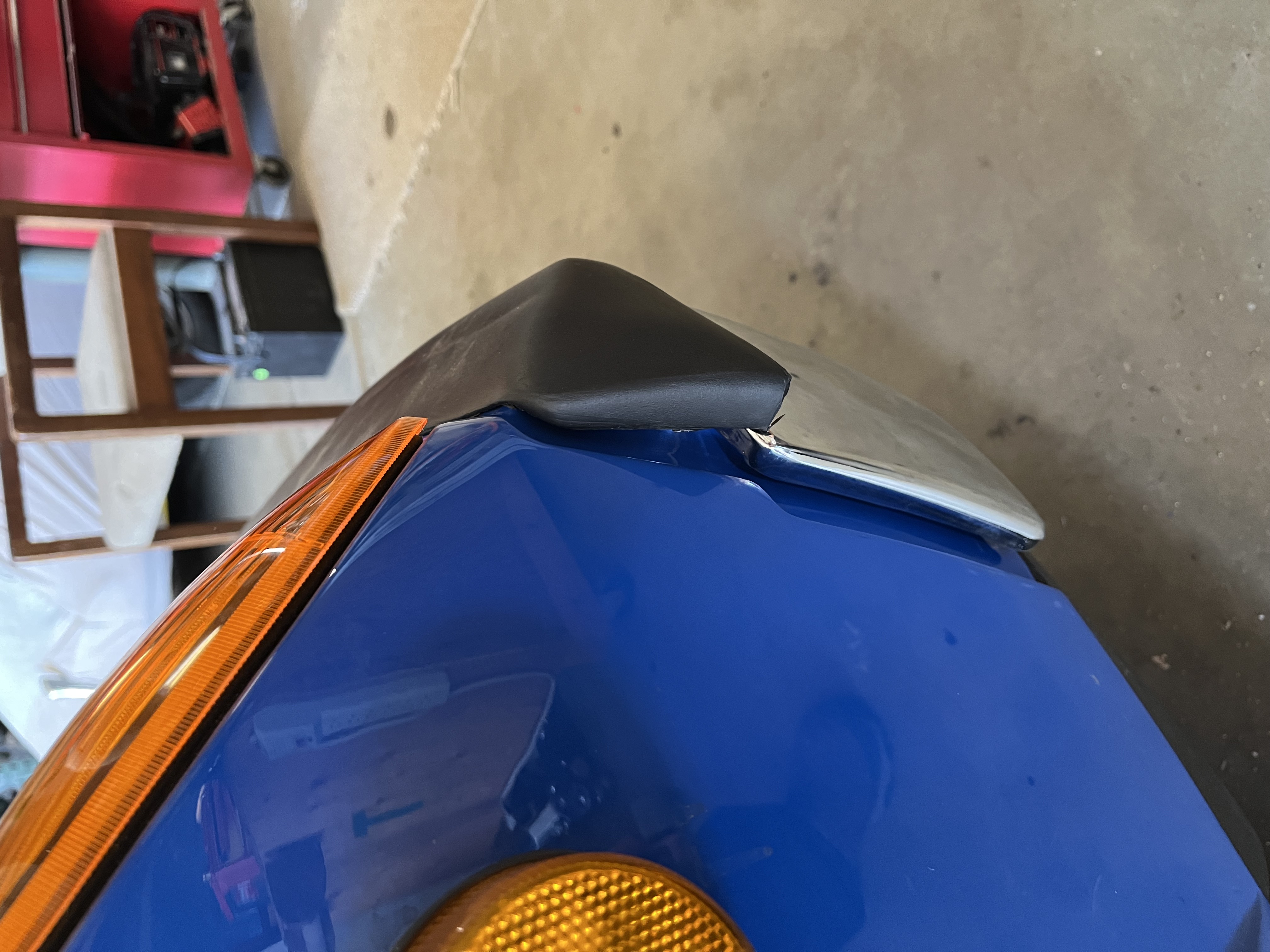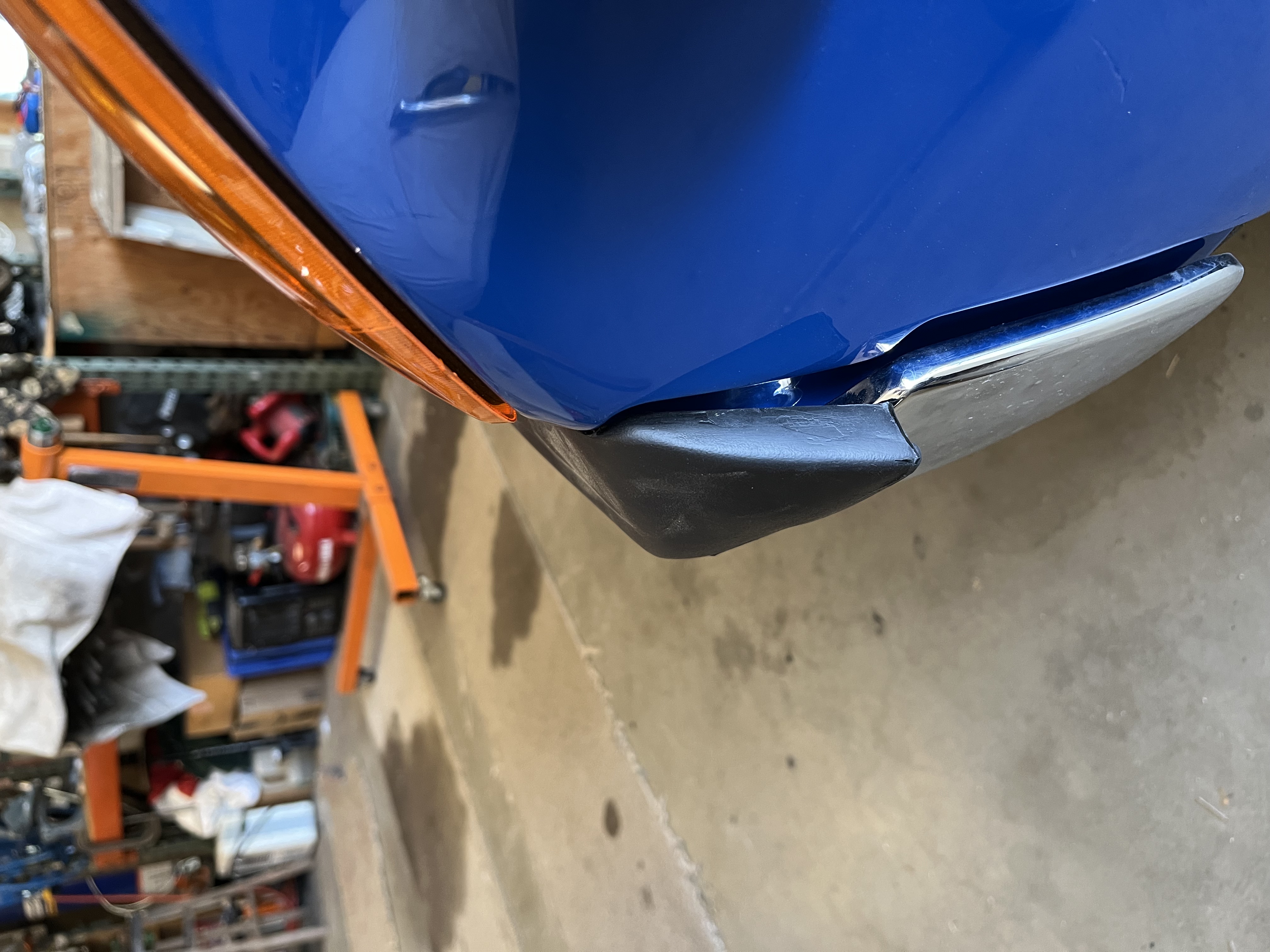 But the flange sticks up as it butts against the car, it means the attach holes in the bumper are lower. The rear of the car hasn't been messed with, and the bumper looks OEM...but re-chromed. Do I want to massage that flange, or is it better to elongate the holes in the body to match the holes in the bumper? I need about 3/8ths movement some where. Sorry for the sideways pics.
