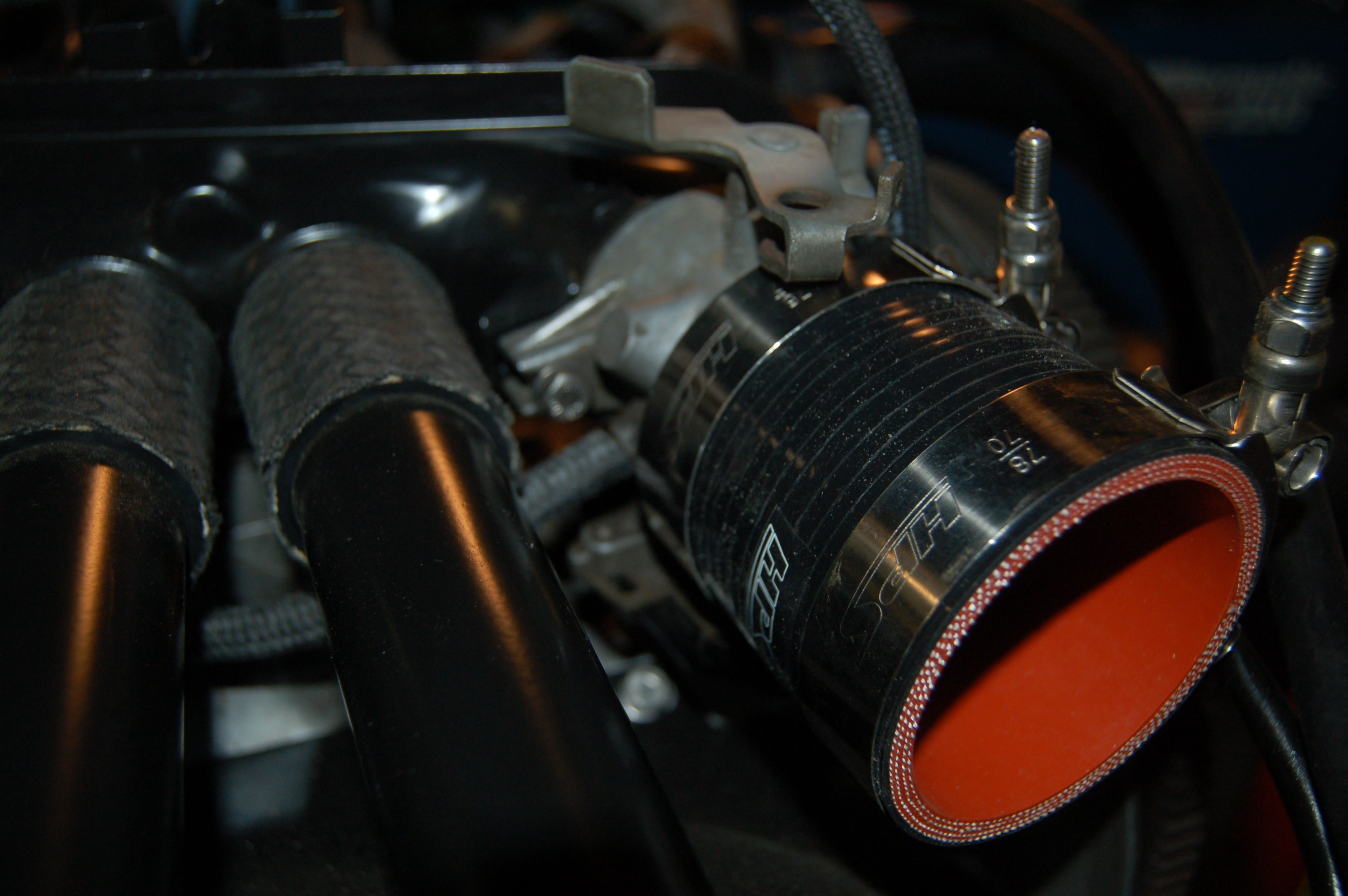 I don't want to reinstall the org air cleaner housing and hide the nice clean engine. So heres what I'm doing, silicone coupler, stainless clamps, stainless pipe, and cone air filter. The first pic is the coupler and the second is tring to decide where I want the air filter to end up.