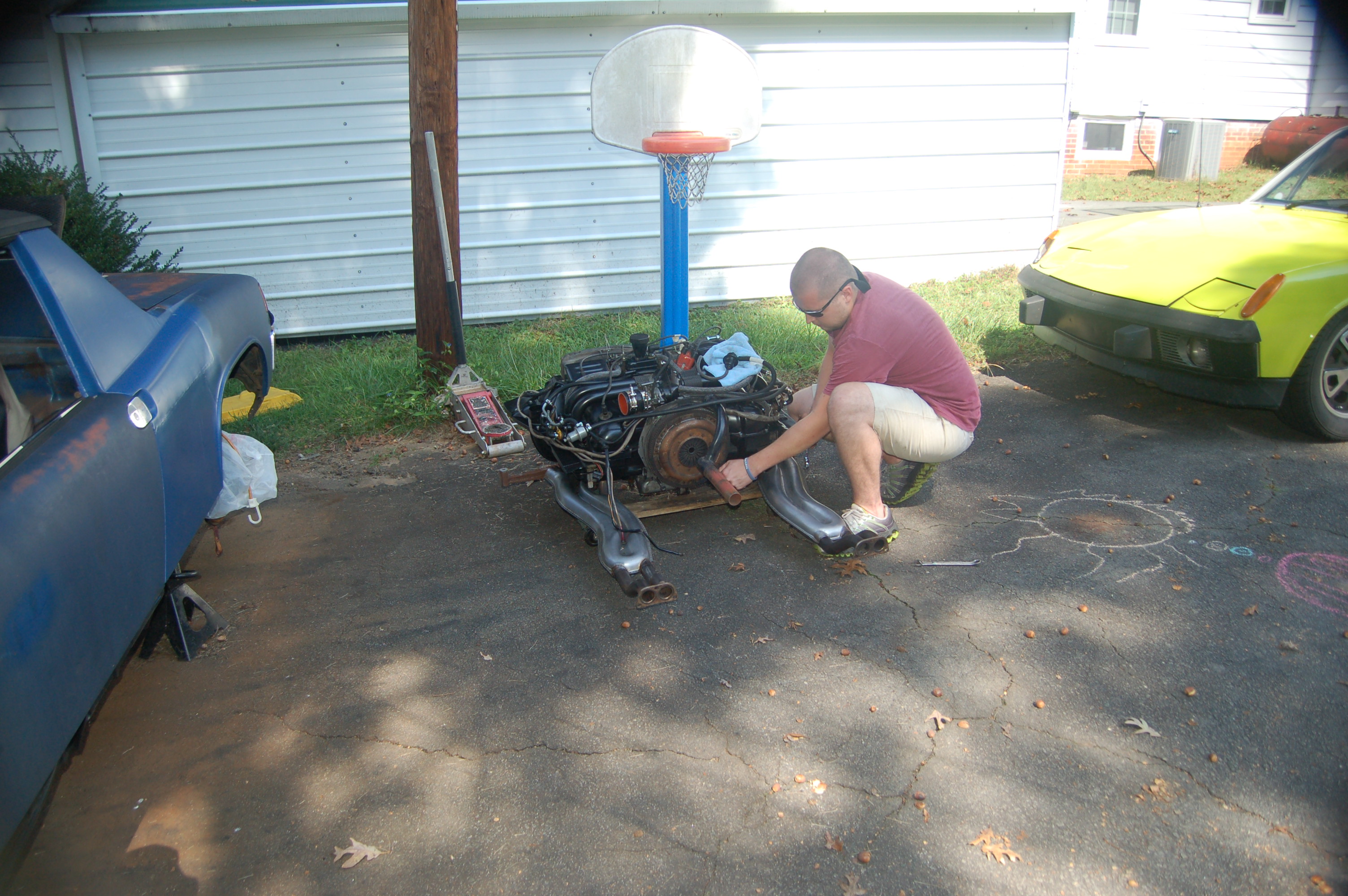 So today was the day for the motor to go back in my car!!!!!!!!!!!!! After 2 long yrs of rust repair I'm almost done w this phase of my 914 project. Doug was kind enough to come over and help me w the installation, thanks again Doug! Now all I have left to do is get the gas tank boiled out and reinstalled, the rear window and shift linkage, and a few wires and cables. Of course there are tons more to be done to this car like the interior and bodywork and paint, but those things will be later. So enough with the talkin here comes the pics.