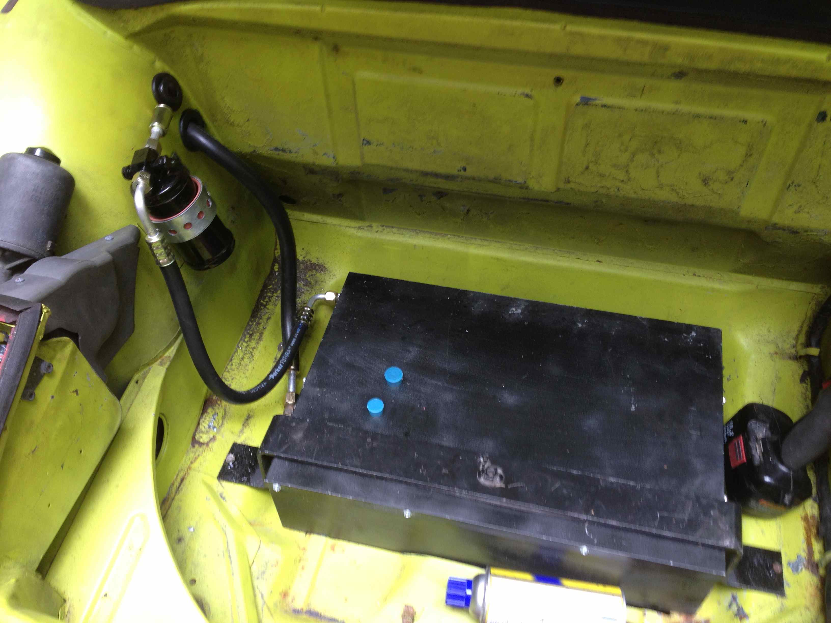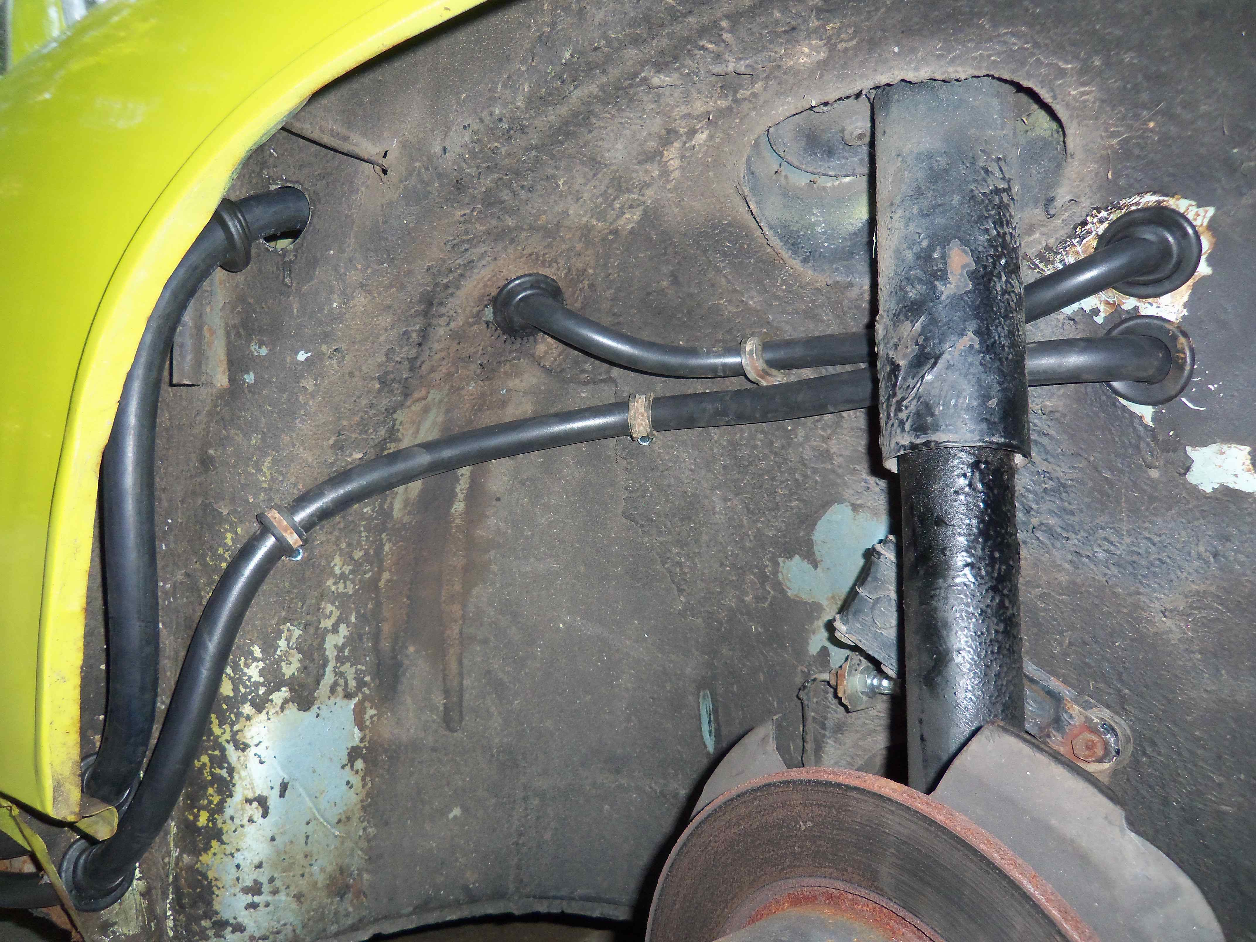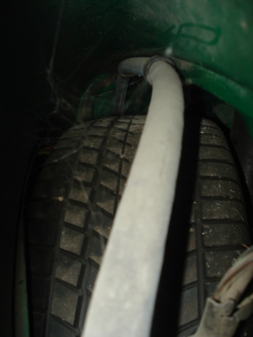 My hoses were originally run that way. In your picture you can see the inner fender well has rub marks where the tire has rubbed in the past at full lock. My car does too and I am running 17 inch turbo twists now which are very close to rubbing the fender well on full lock even with my custom spacers. I routed my hose up and over the tire and added two hose mounts to keep it in place. In my pics you can see the hose enters the trunk under the headlight up front. don't mind the spider webs. here is the hose running up over the tire. the two hose mounts are riveted in the seal channel and will be hidden by the seal. The hose enters under the headlight into the trunk. Here is my completed trunk area. I also am running the drier in the trunk. |