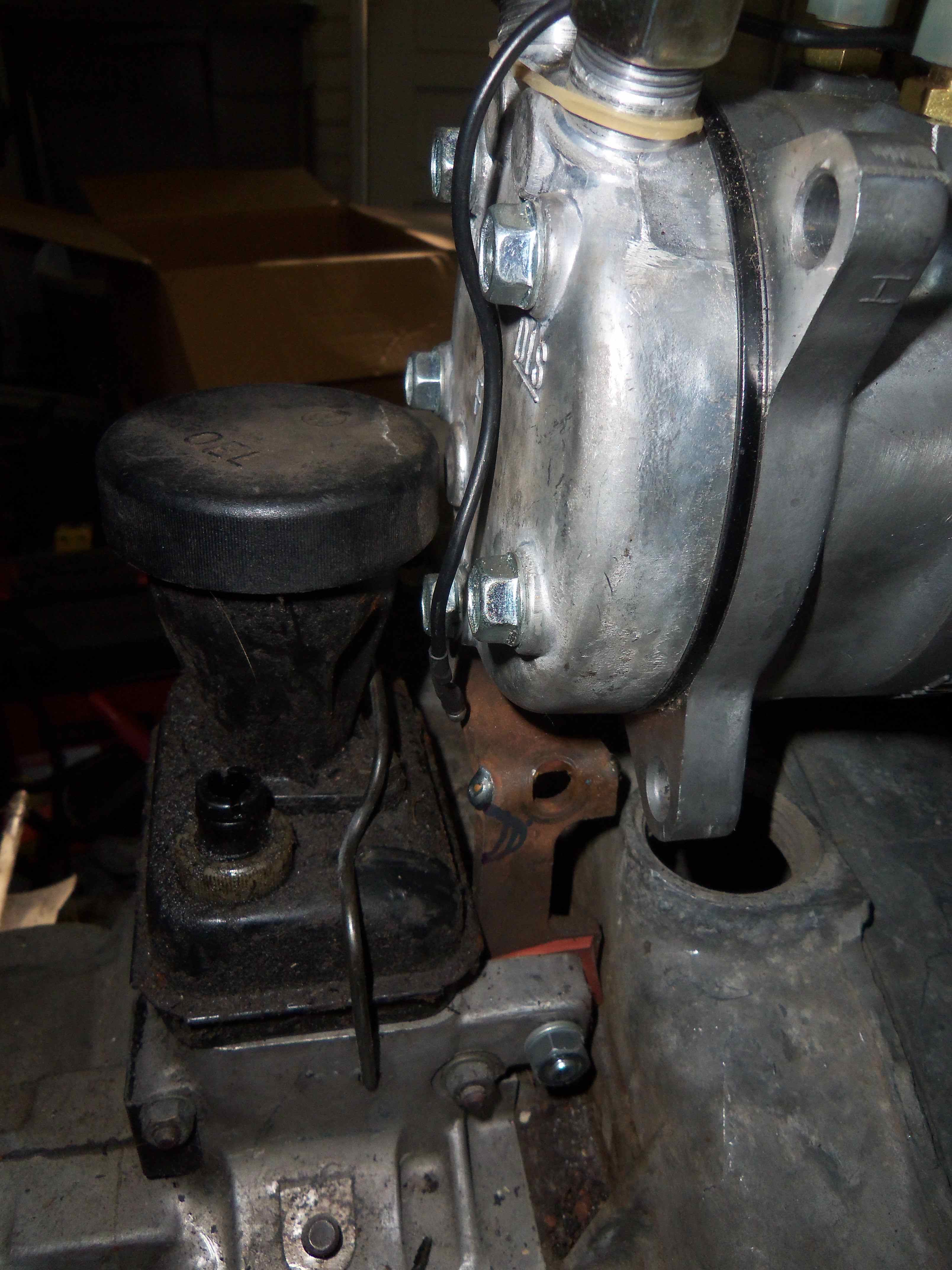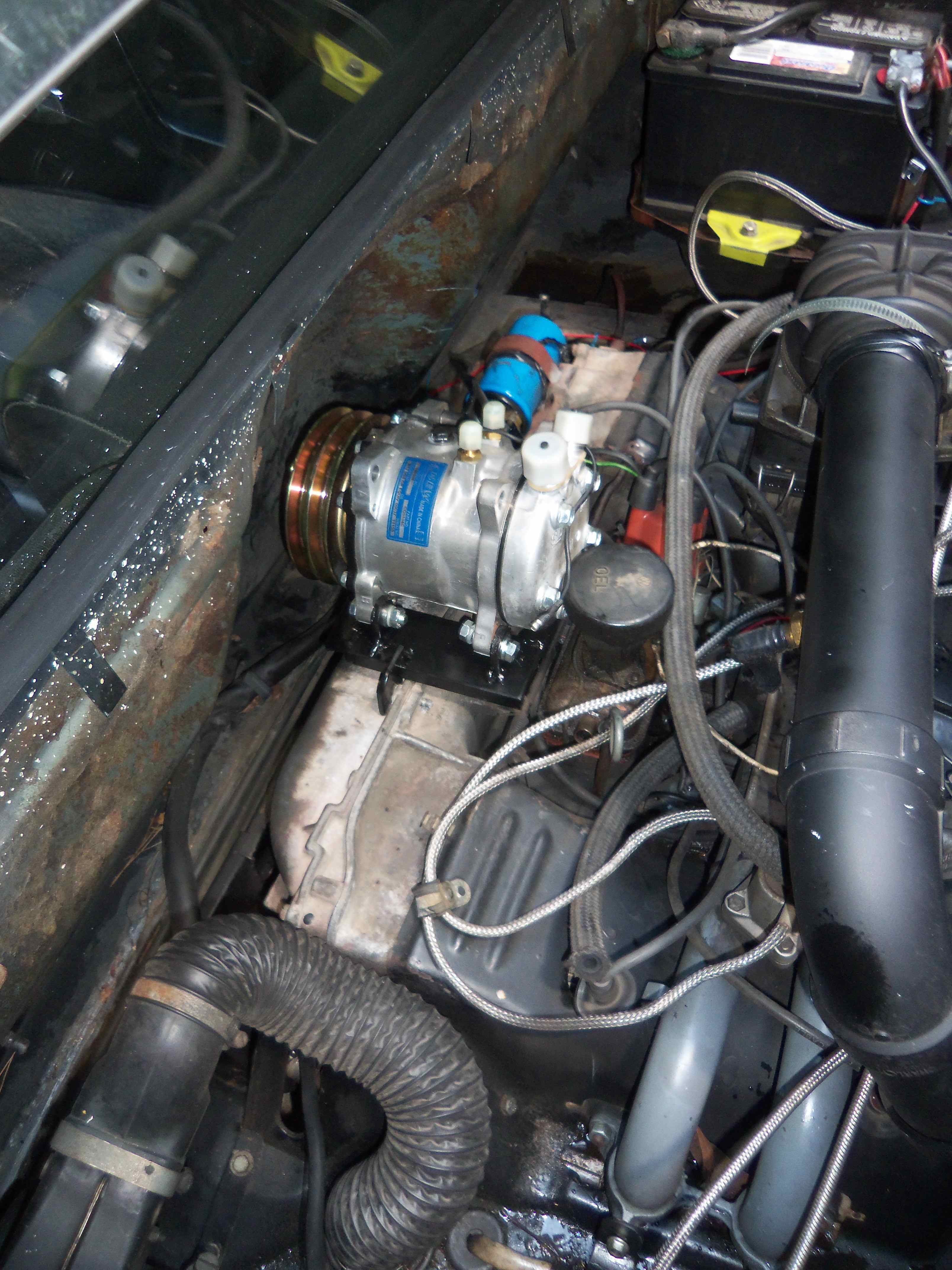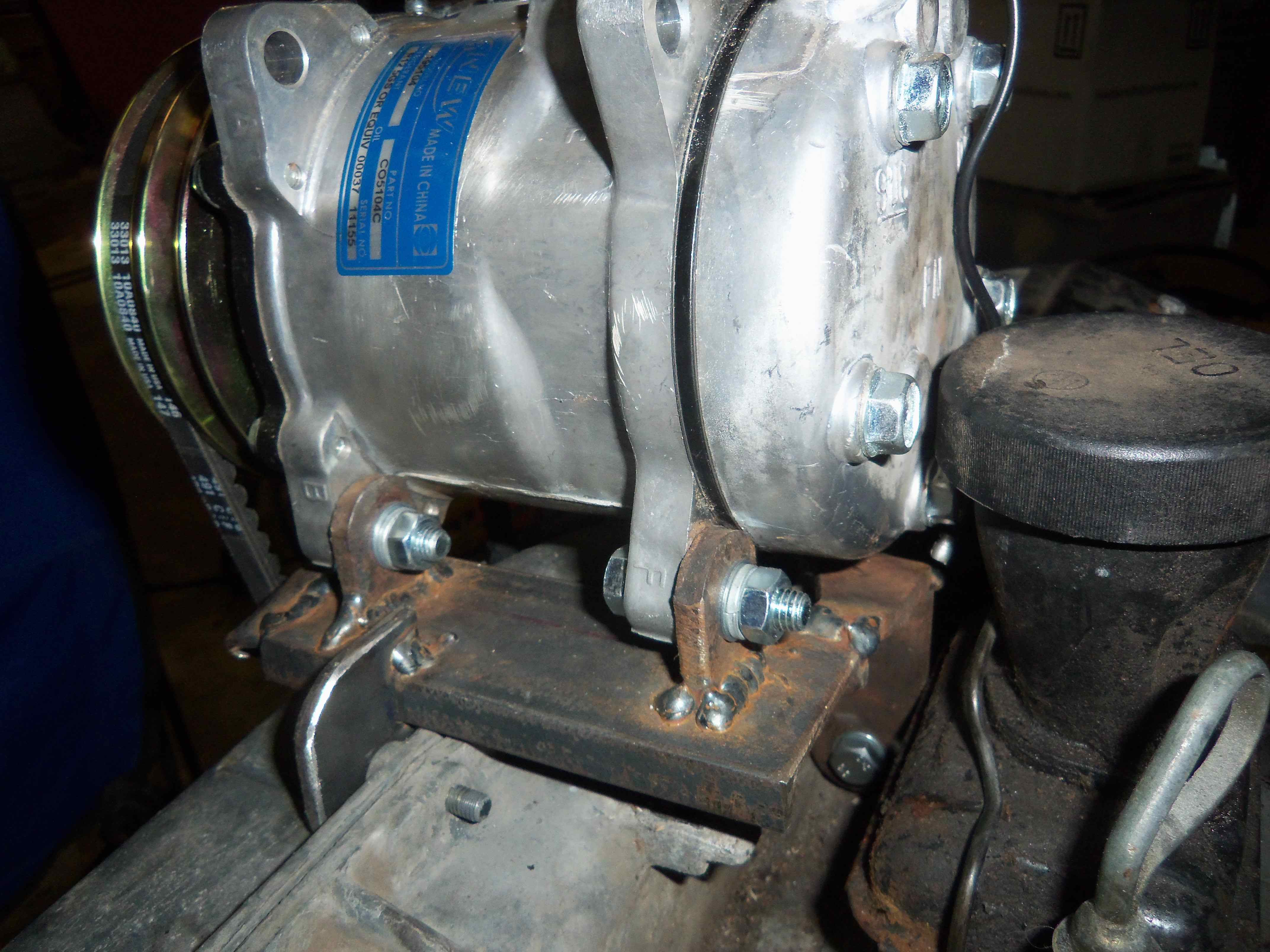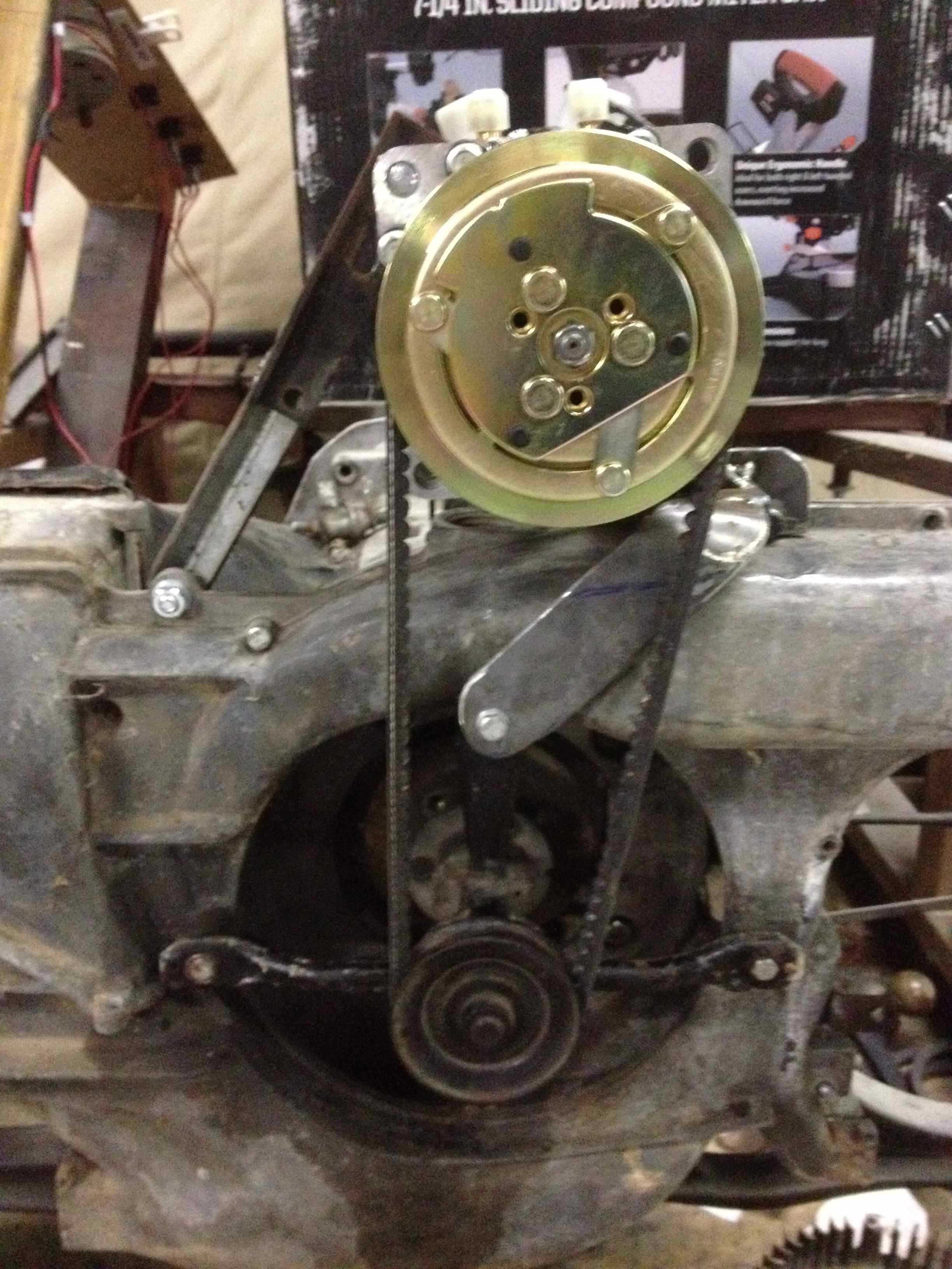 Onto the compressor... I decided to go with a top-mounted unit utilizing a smog pulley assembly to drive it. I had big plans to have this nice professional looking mount that I would be proud of... and the parts I needed ended up being backordered. I got tired of waiting so I made my own from scratch. Later down the road I might update the mount.