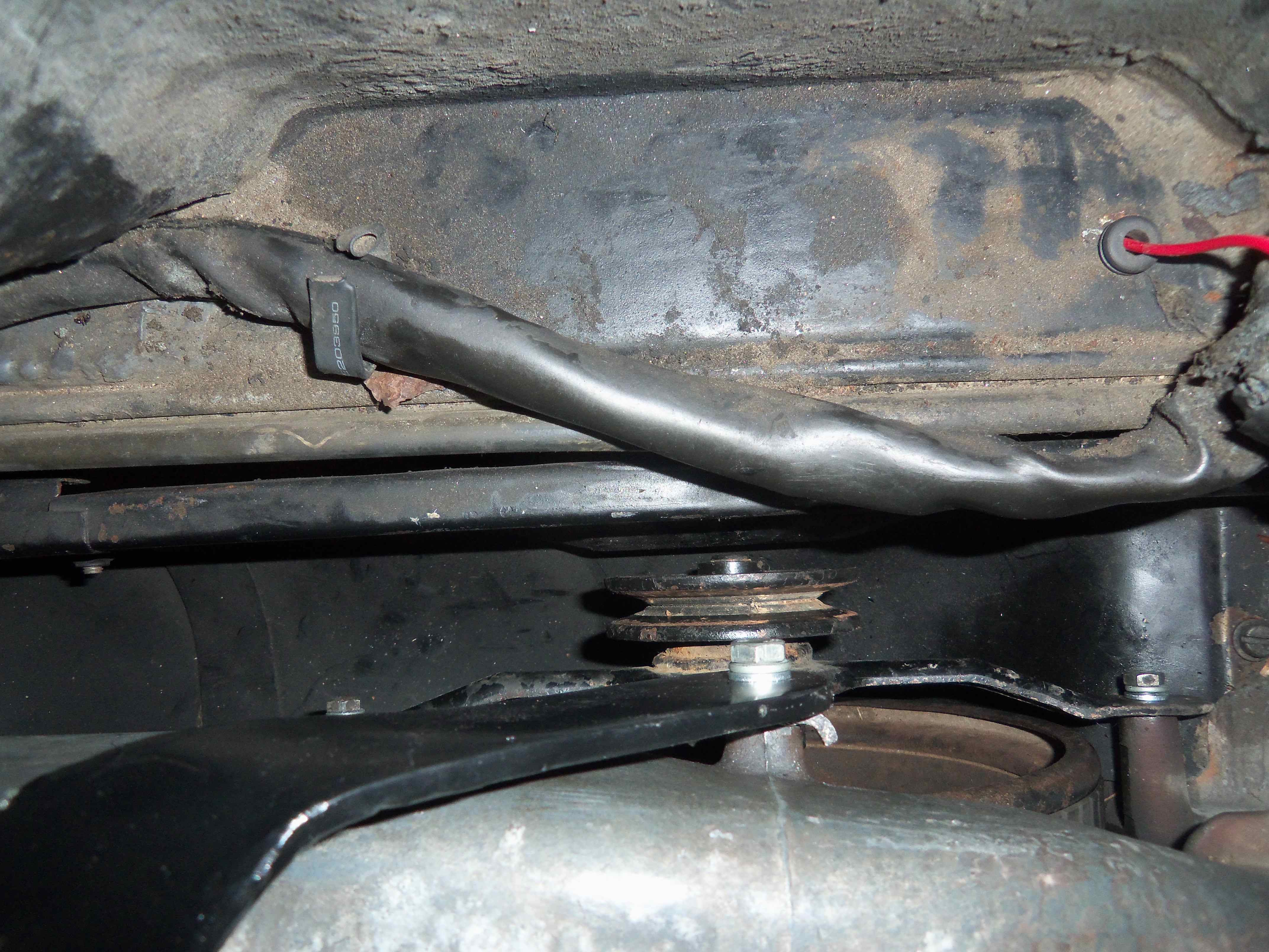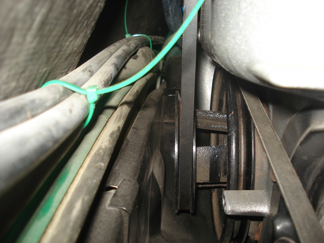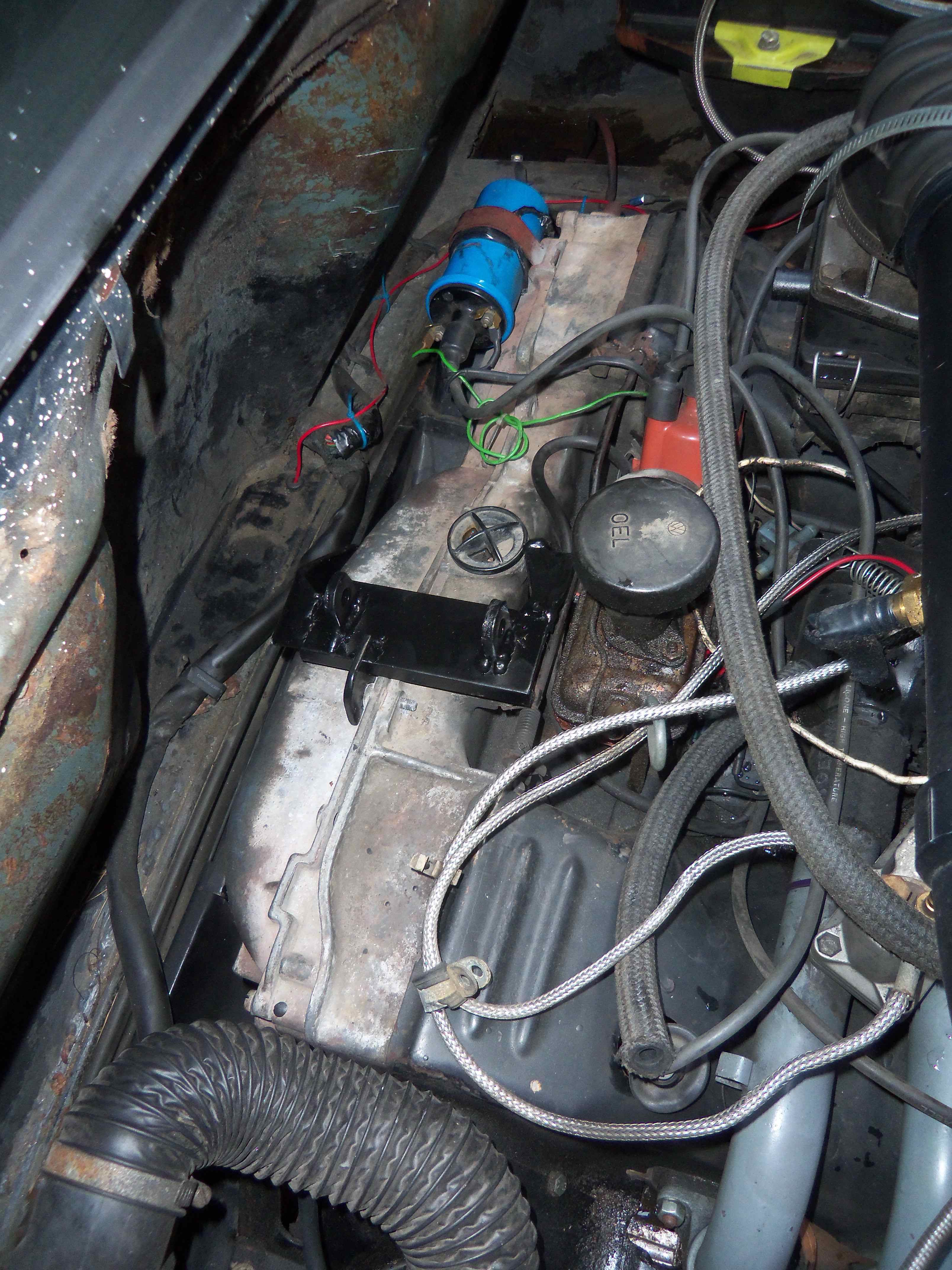 In this picture you can see the timing plug is removed and there is access to view the timing marks (even on a stock setup you need to be a contortionist to see directly down there). You can also see I relocated my oil filler higher and angled back for easier access. Here is the front pulley. Lots of room for the engine tin for belt changes. The belt JUST hugs the front fan housing. Here you can see how close the compressor pulley is to the factory sound pad. In your setup I noticed you have no sound pad yet. If you put one back I am sure you will be close like mine. It is close but still just clears and I want that heat and sound barrier for the cabin so it is worth it. |