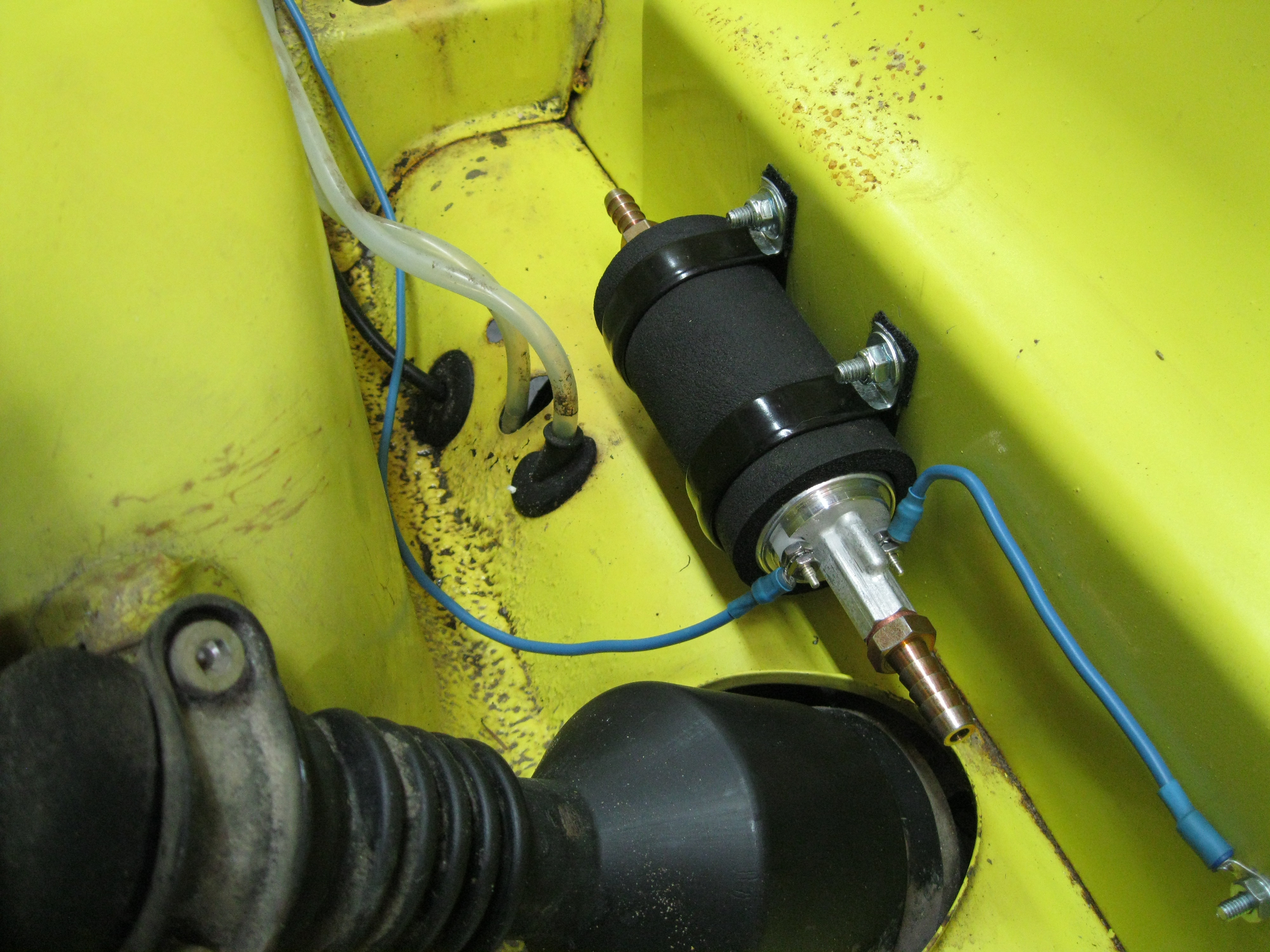 Another option is to mount the pump beneath the tank, just forward of the reservoir brake lines. Plenty of space, just make sure it's mounted low enough to clear the anti-roll bar, if your car has one.
