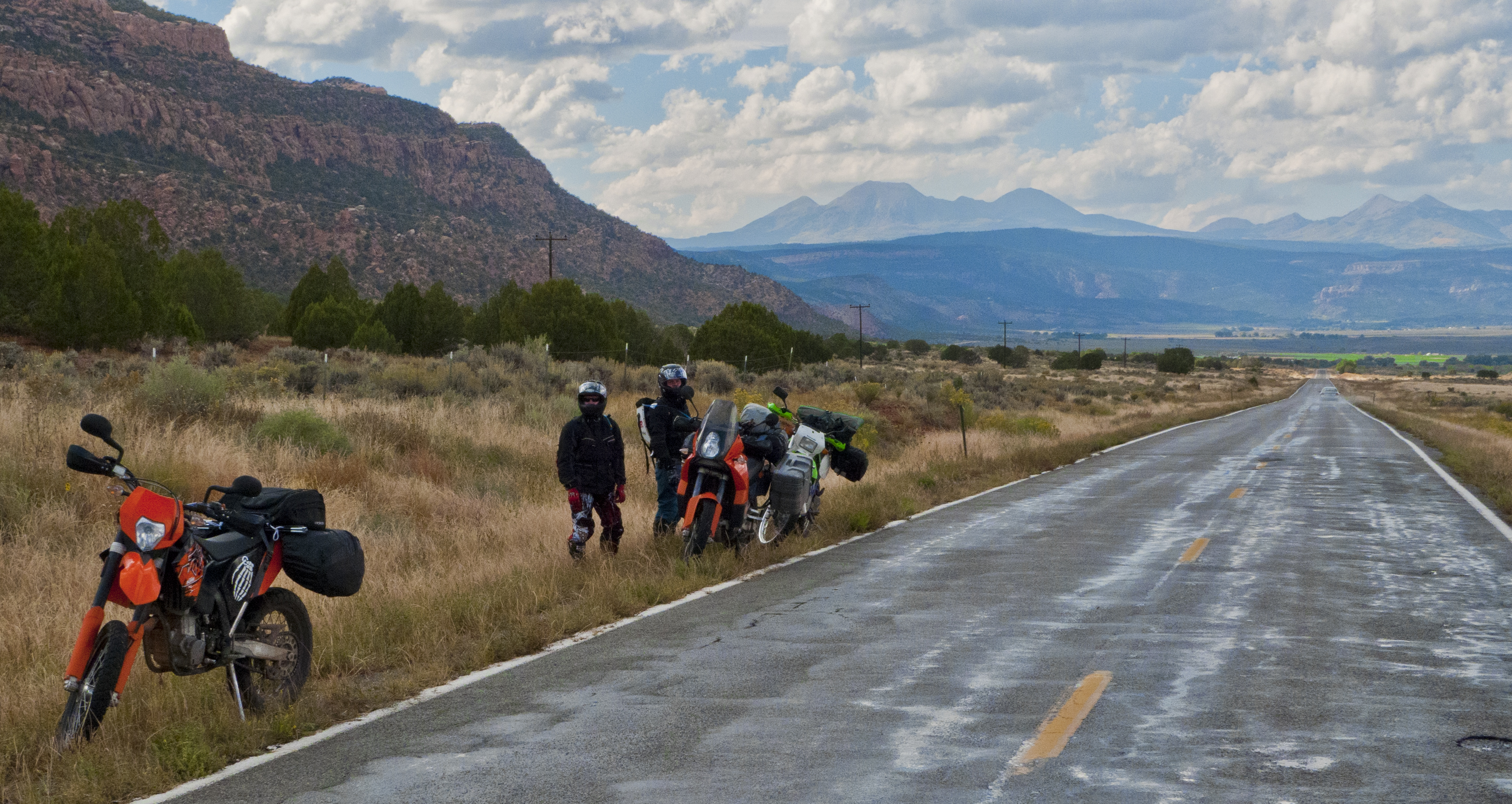This is from a motorcycle trip we did a couple of years ago. We left LA and headed east, staying off the freeway as we made our way to Denver. This is just inside Colorado on Colorado 141. About 5 miles west of this was a beautiful drop through the hills seen in the background. We ended up coming out near Montrose and then took Colorado 50 East. The guys I took with me had never travelled the state roads and had a great time! Very cool - there is so much driving to be done here - you can't go wrong. US 50 then to 285 is a great way to get to Denver. I-70 is for 18 wheelers. Dammit - I mean the roads are flat, straight and present no challenge at all other than the aforementioned ladies that seem to congregate around college campuses in Colorado. |