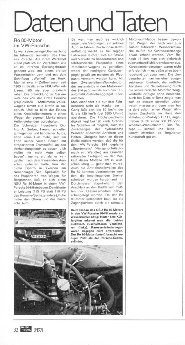 in #6 from 1972 (released at March 15) there's a 4 side story about the Wankel 914 unfortunately I didn't own this magazin, but as far as I know a friend in germany has got one maybe I can get a scan, then I'll post it here So long, Gustl |