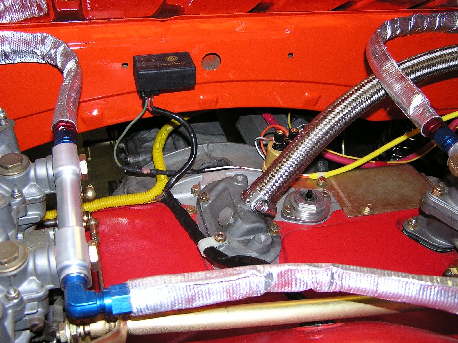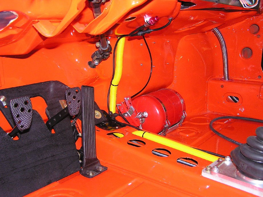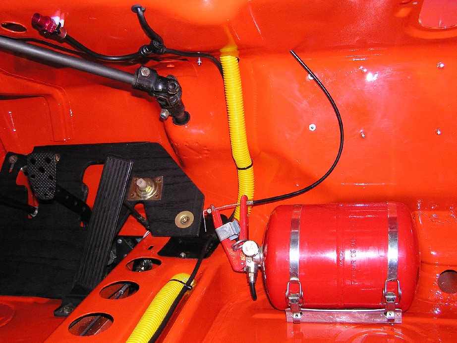 My liscensing school is in 4 days... doesn't look like I'll be driving the orange car in it. Heck last year I did the school in my ford focus, so I think I'll be repeating that. Anyways the car is coming along and starting to "feel" like the end is at least in sight. Here is the fire supression system plumbed and mounted. Front nozzle over pumps and cell: Attached thumbnail(s)