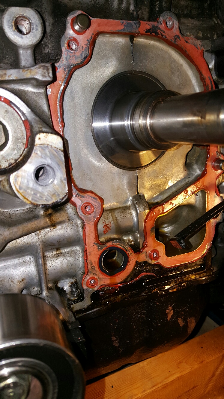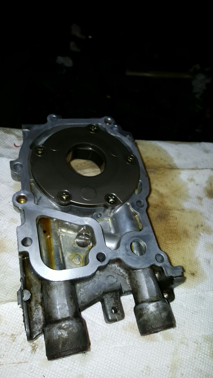 Slight progress while we wait... Oil pump is off. Never resealed in 21 years. Seems like it might have been leaking slightly from both the seal around the pump housing and the front seal around the crank ( I think referred to as the front main seal). I got the seals I need in the Subaru reseal kit, just never used them. Look at the crap behind that thing. O-Ring is not very pliable. It broke later. Got the RTV removed from both surfaces. RTV is the OEM way to seal the oil pump. Same with the oil pan. Tomorrow we clean the gunk off from on and behind the oil pump, re-seal it, get the timing belt back on. I'll detail the procedure for doing the timing belt when I reinstall it. Easiest one I've ever done (3 times now (IMG:style_emoticons/default/biggrin.gif) ). Non-interference too. It's gonna be flying down the road in no time (IMG:style_emoticons/default/beerchug.gif) . |