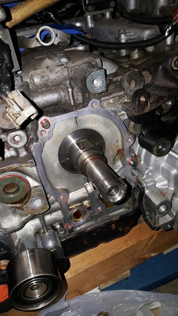 Got the timing belt cover off, pulley, etc: The leak is right here...VERY small one but I hate oil leaks. At first I was a little panicked because that black stuff looked like JB Weld....which would mean something bad. But it's not. It's black RTV. Scraped right off and is pliable. Someone tried to stop the leak temporarily with it. Any idea how much work that was in an SVX? Brings lazy to a new level. |