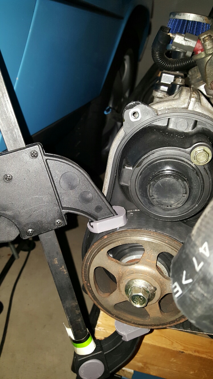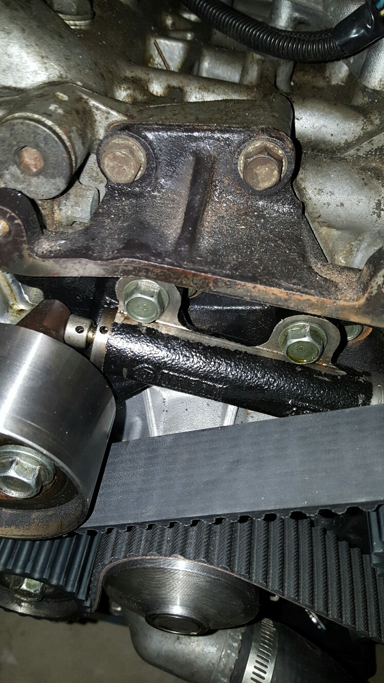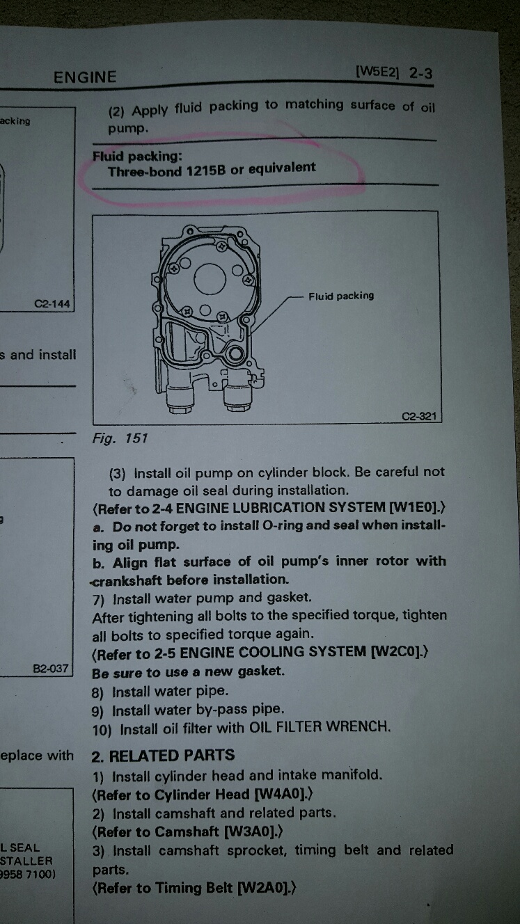No pics of that since it's a messy job that requires both hands, but here is the diagram from the manual. Just follow that line with the RTV and you're good. And then the timing belt reinstall. This is one of the easiest TB to reinstall...The most important thing to remember is to line up the marks before you remove it. There is an arrow on each cam sprocket. They both must be pointing UP. There is a notch on the outside edge that lines up with one on the black plastic piece behind it. At the same time the lines on the crank sprocket and the notch above it must line up. If you take it off that way it most likely won't move. For reinstalling, first take the belt tensioner off, compress the tensioner and stick a small allen key in the holes keeping the pin in the middle from moving forward. Unfortunately I had to redo mine several times last time and the back side snapped off, so I added some JB Weld to the end. It worked just long enough to reinstall the belt then crumbled off. I could drill new holes but it seemed to hold OK with just one and the JB Weld subsitute. Go ahead and bolt the tensioner back on but don't tighten it down. Putting the belt on can be fiddly, so get a Harbor Freight $5 wood clamp and clamp the left side JUST ENOUGH to hold it in place, lining the white line up with the marks on the cam and plastic piece. That keeps it from repeatedly flopping off, skipping notches, and keeps you from swearing a lot. You most likely won't be able to get the belt stretched over both cam sprockets, so remove one of the non-geared idlers and line up the belt. The dotted line goes on the crank sprocket marks, and there is another solid white line for the right bank. Reinstall the idler pulley, double check your work, un-clamp the left side, triple check your work, make sure the belt is on all the teeth with no skips, then push the tensioner to the left and tighten it to spec (I think 35-40 lbs). Check the belt again...do a drum roll....and pull the pin out. You are done. Put the covers back on. Say "Yeah". High five yourself. |