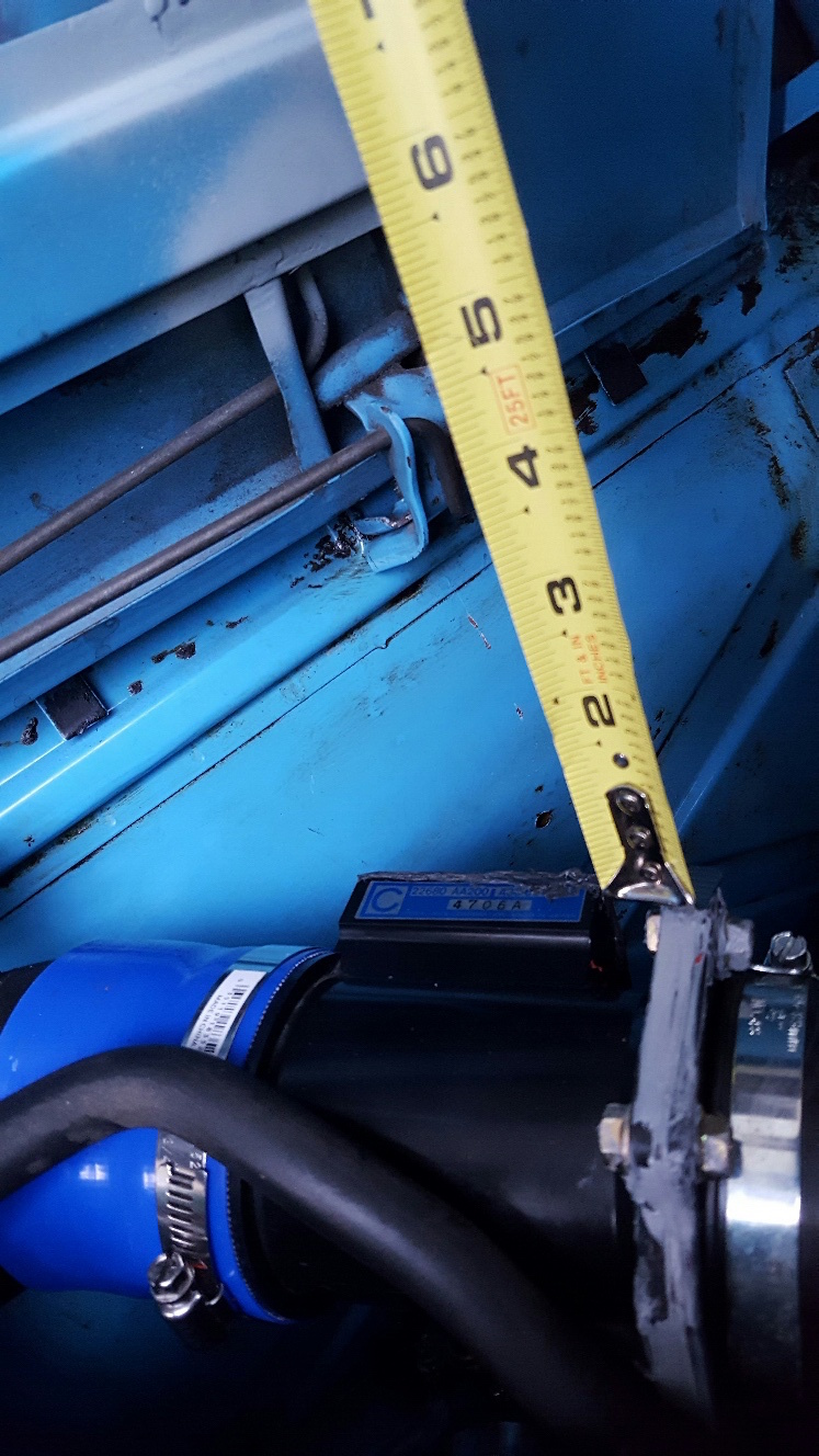 Here is a pic of where my lines come through the front trunk. I have them following the indentations in the floor underneath. Someone was asking about fuel pump relocation in another thread...well...there is the fuel pump behind that black plate. Walbro pump fits in the stock location. BTW it is running much quieter now. Here is the engine with the intake flipped. The stock plastic intake piece is actually flipped as well because it would not fit the other way (battery). You can see it is slightly tipped up and higher on the right side because it is hitting the firewall on that side. The intake is very thick so I think I can shave a little off of it and get it to fit. I had to shorten it quite a bit. Luckily I have another one. If my Optima ever dies on me I will use the battery tray as a support for the stock air cleaner and put a small battery on the other side. Here's an idea of how high the intake is in relation to the engine lid. The intake itself clears easily, with about 3.5 to 4 inches of room. Here I used the MAF because its is the same height but easier to show measurement to the lid hinge. Could put the rain tray back in I guess. The plastic snorkel piece is close to the lid but that is mainly because it is upside down so the IAC valve hose is on top. It would be behind the rain tray anyway. |