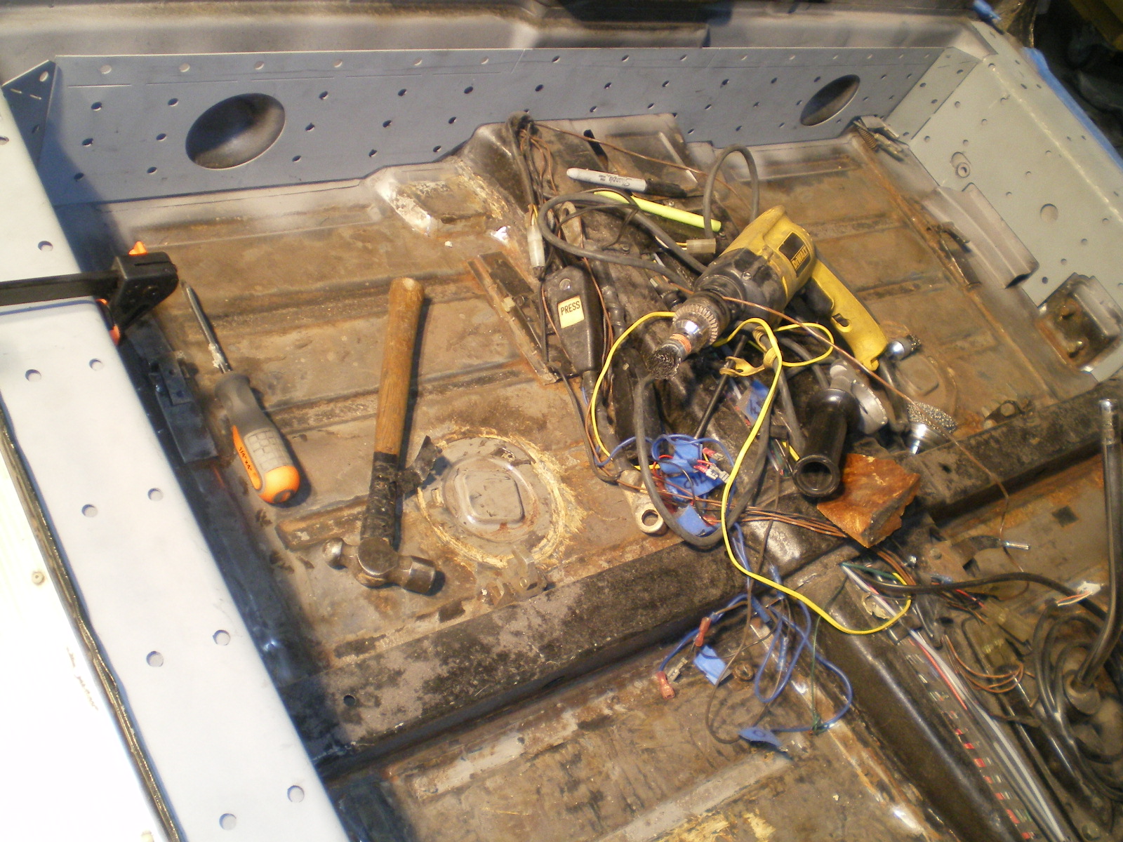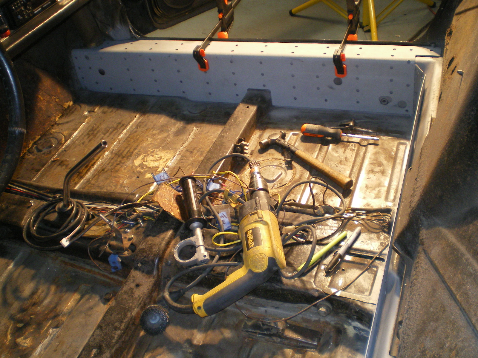 Now that this Artic cold spell has passed I was able to get a few hours in towards installing the stiffies. I think that sounds current, don't you? I mean no one says vegetables anymore. It's always veggies. So why should they be called stiffners. I suppose one would have to be careful and reference each as a "right or left' stiffie while never using the generic term "a long stiffie". I decided before I began welding I should prep the floors for paint. I pulled the pedal assm and it was junky looking but not as bad as it looks here. It will clean up nicely should it be needed.