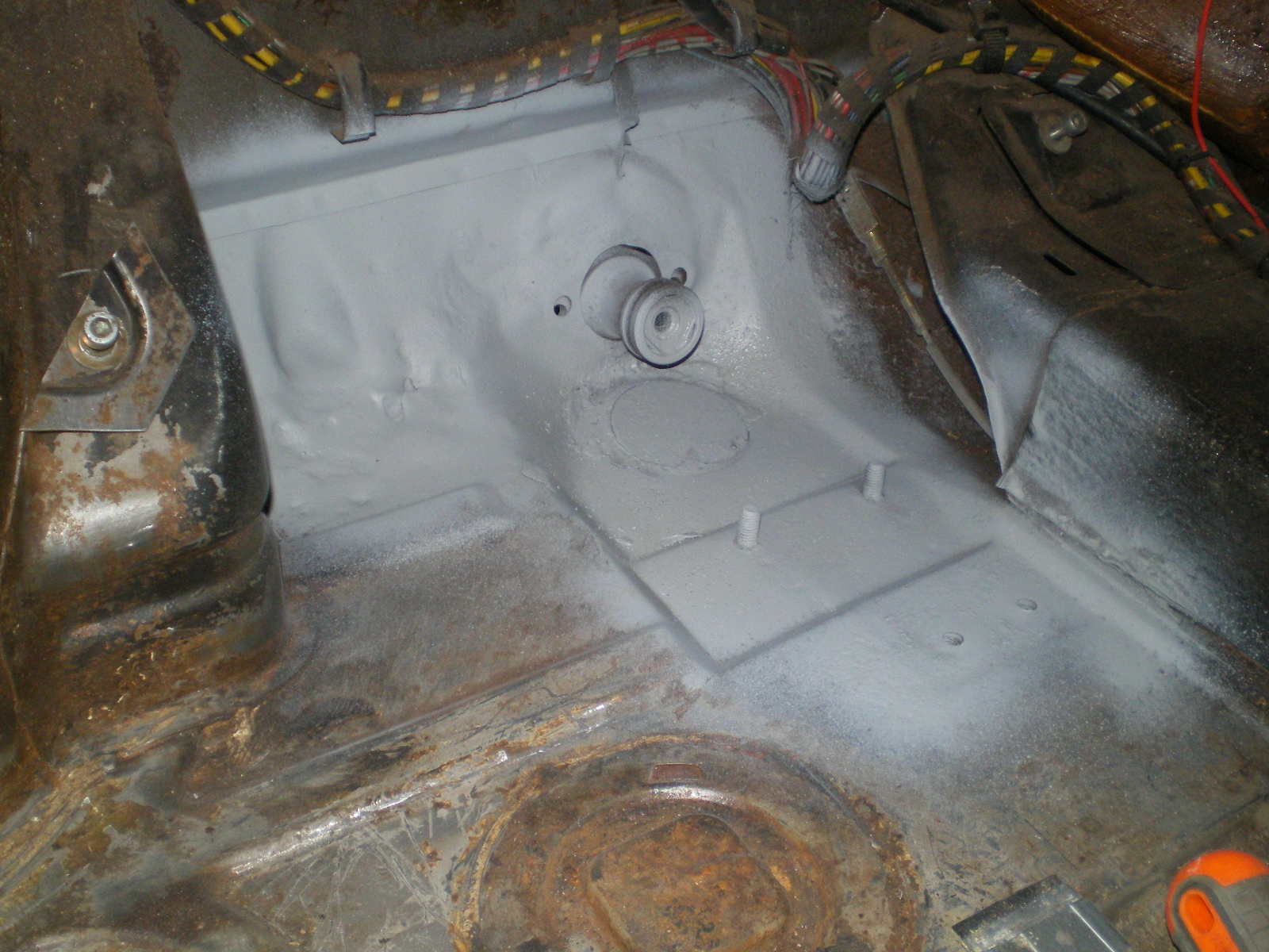 The pedal area had a little surface rust but it's a bitch to grind in that area so I phosfo'd it after a light brushing and then shot some primer/sealer on it. |