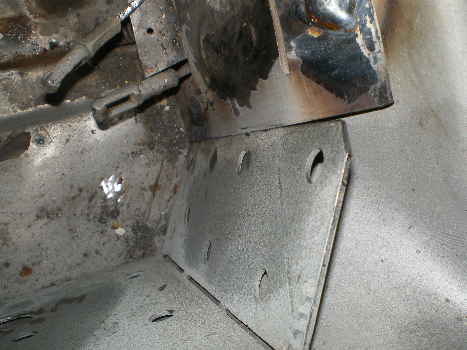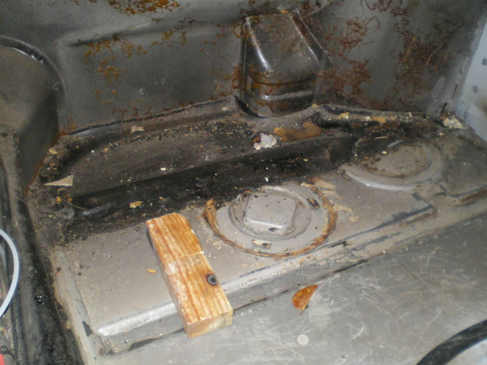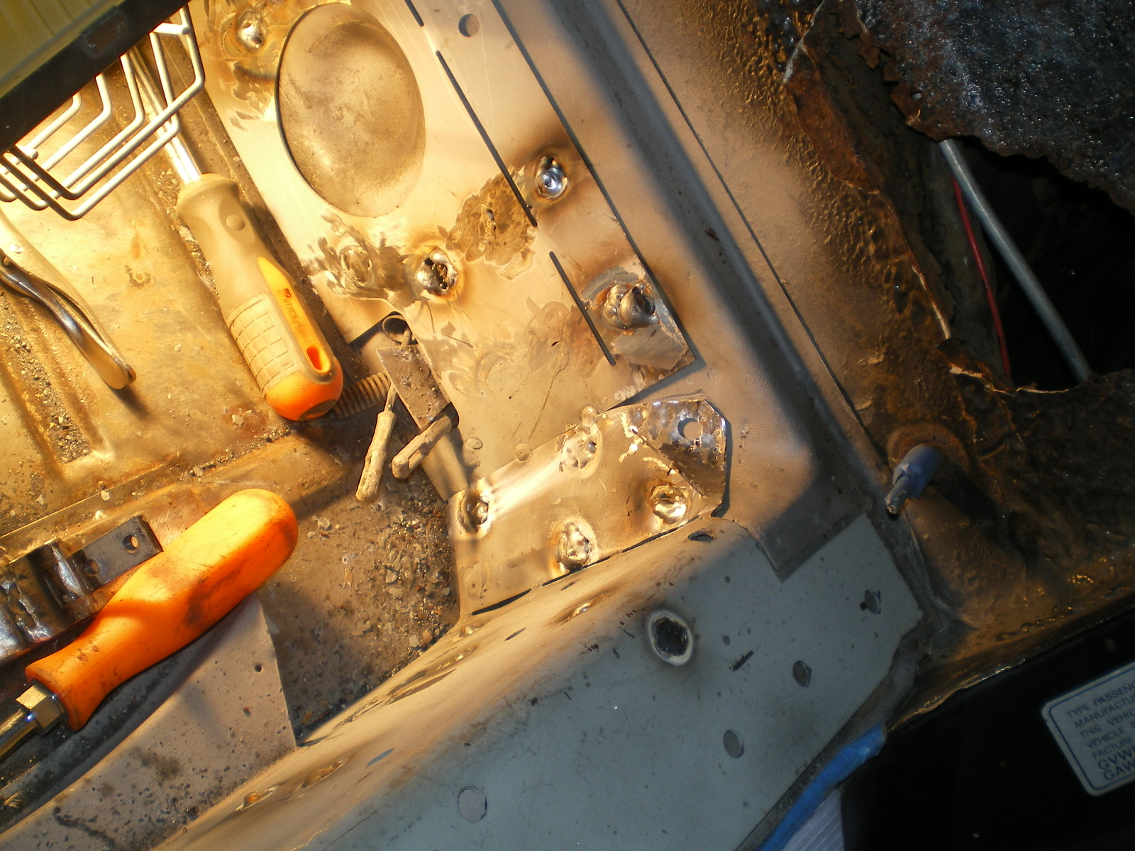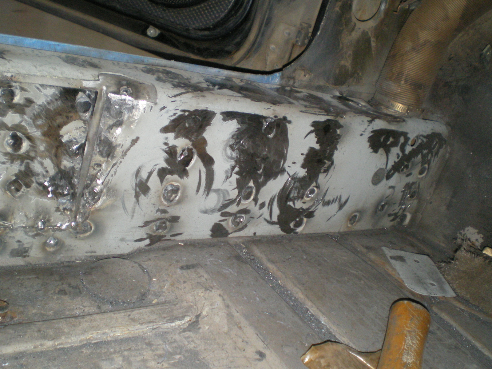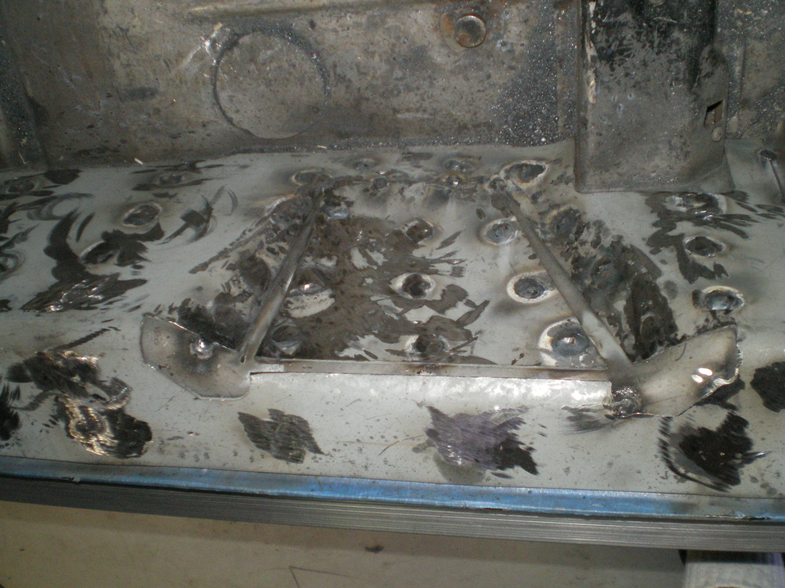 ![]() ![]() ![]() And this looks a little suspicious. Rivets and a rough finish on the panel. ![]() Then there is the matter of this booger by the PO. ![]() So I drill out the rivets and look what I find. Has anyone seen these before. Obviously stamped steel so mfg'd by someone. ![]() Once they're out this is all that was left of the tray. The pedestal was in good shape but I doubt I will relo a batt here. ![]() Couple of pic's while getting cleaned. These holes need to be welded up ![]() And a small patch here ![]() ![]() One booger mostly ground down ![]() |