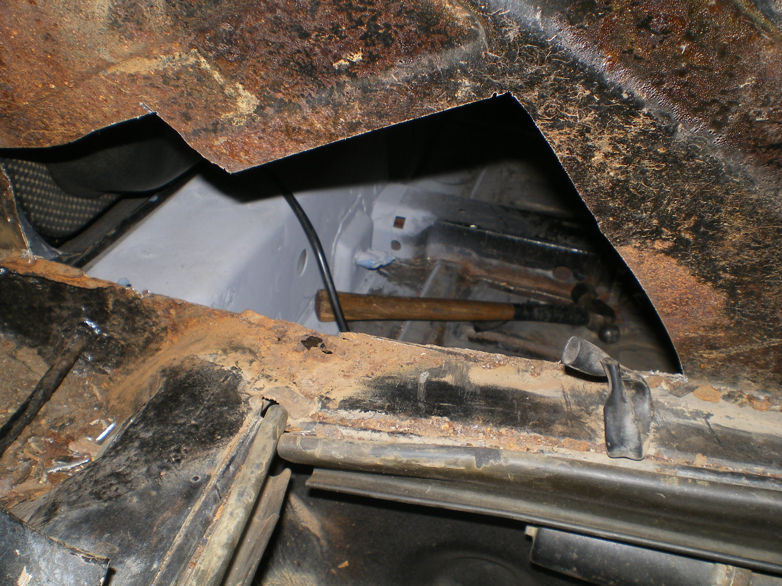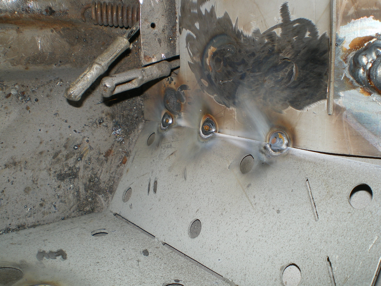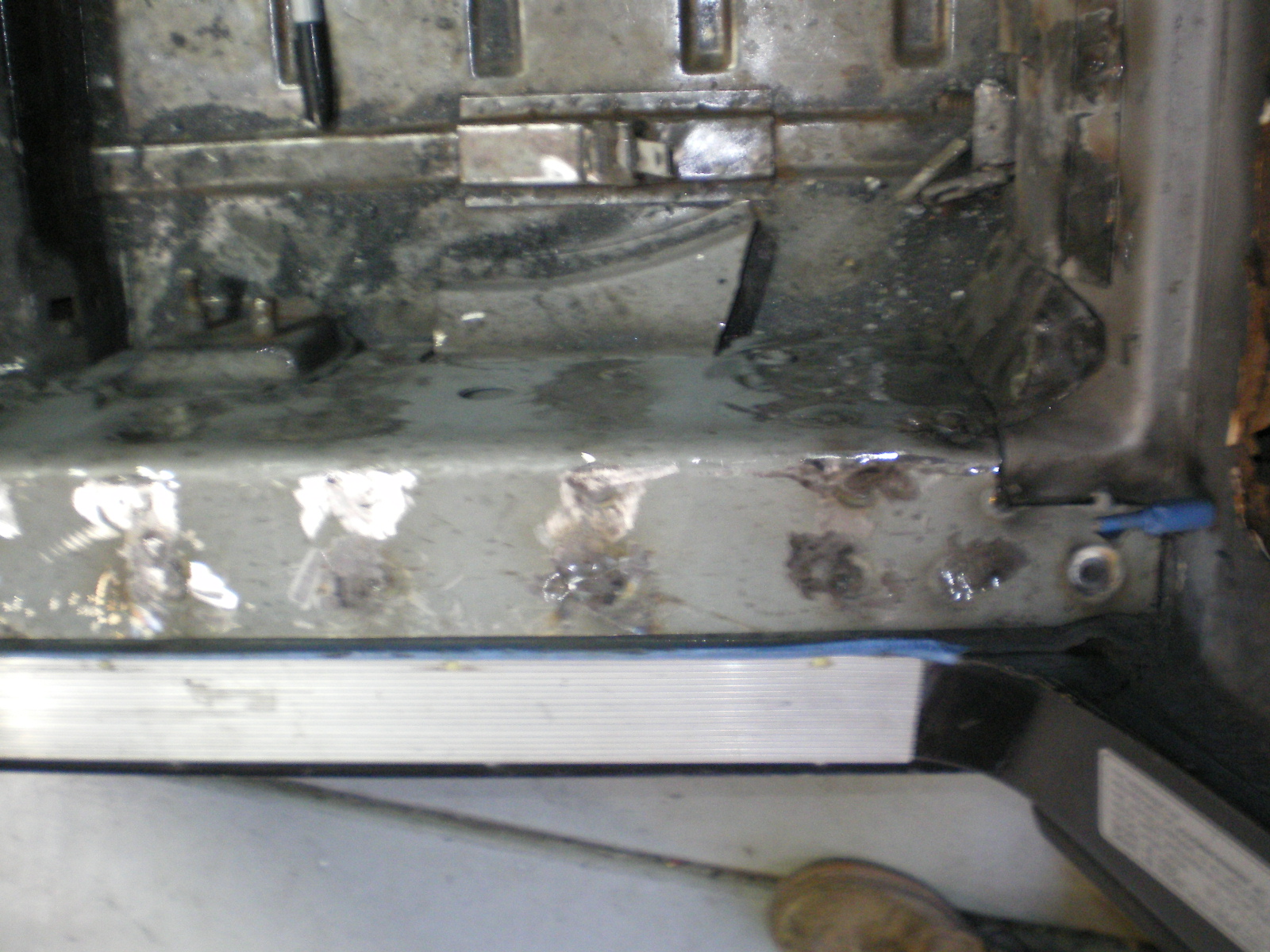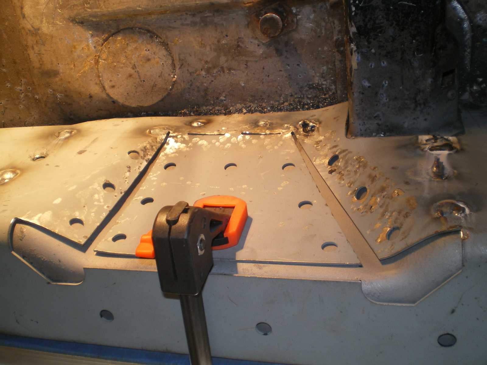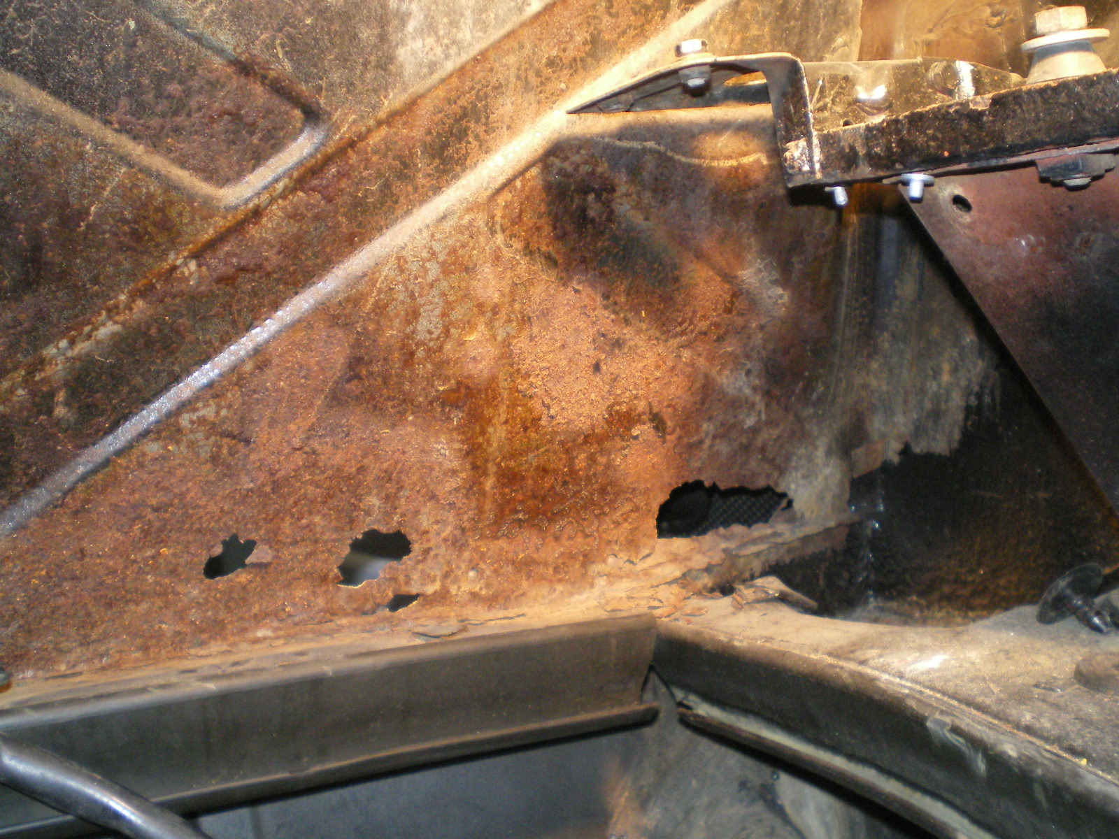 ![]() ![]() ![]() And this looks a little suspicious. Rivets and a rough finish on the panel. ![]() Then there is the matter of this booger by the PO. ![]() So I drill out the rivets and look what I find. Has anyone seen these before. Obviously stamped steel so mfg'd by someone. ![]() Once they're out this is all that was left of the tray. The pedestal was in good shape but I doubt I will relo a batt here. ![]() Couple of pic's while getting cleaned. These holes need to be welded up ![]() And a small patch here ![]() ![]() One booger mostly ground down ![]() |