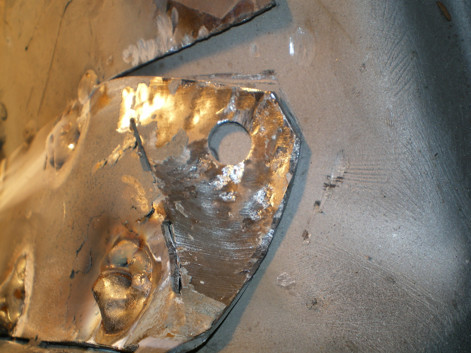 A close up of that "formed" piece. Me thinks beat to death is more appropriate. And this is where I'm at until I get by the welding shop and restock my .023. That bottom right hole that is blown wasn't cleaned (IMG:style_emoticons/default/headbang.gif) so I'll move left 3mm and tack it in the seam where it is clean. |