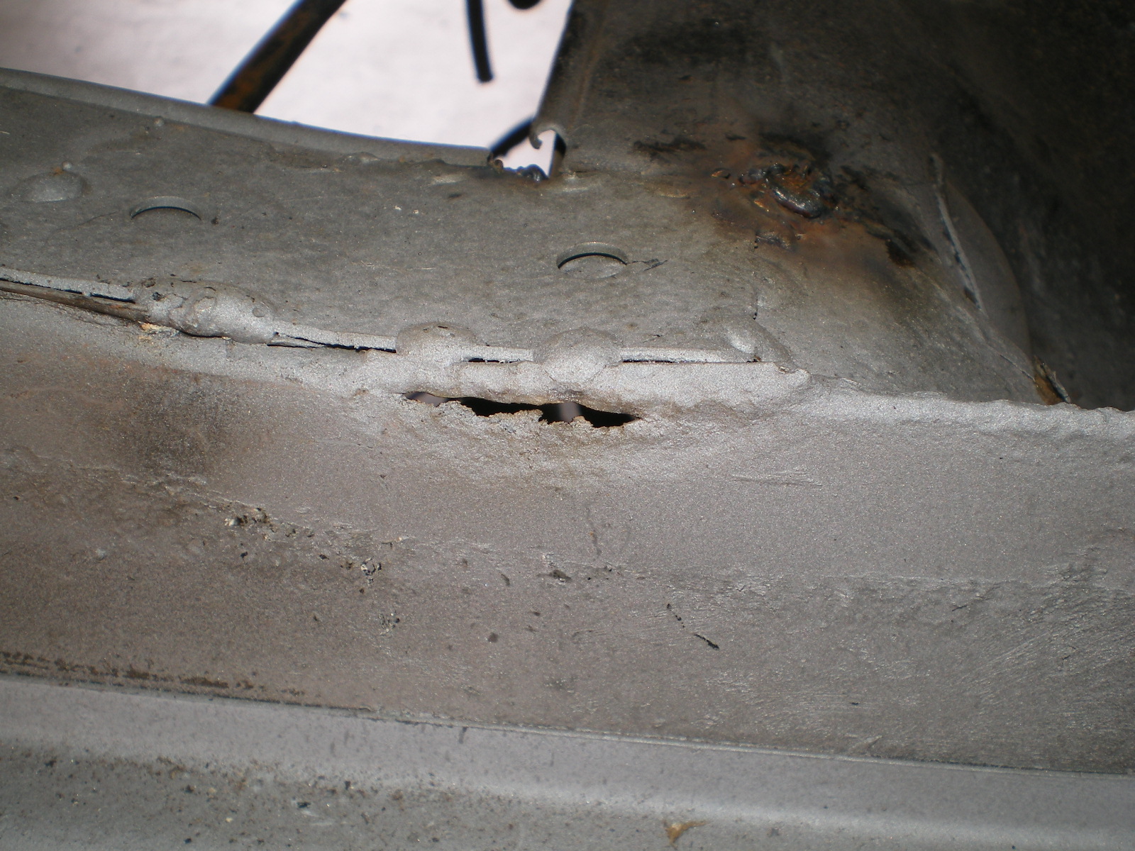 and now they're ground down and gone a shot of primer to ward off the rust gods Here is another spot that needs to be filled. Oops, (IMG:style_emoticons/default/chair.gif) I need to re-size these pic's and continue in the next post. |