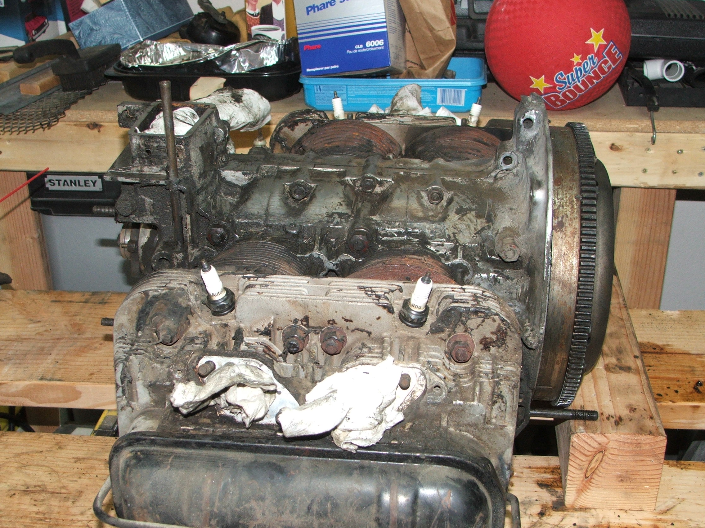 I checked compression before pulling the motor out and #3 was at 40lbs. Found out that the head burned through. I tracked down a rebuilt set of 1.7 heads in NC (Thanks Bill), and am having Pat at Vee W Unlimited build it back up. |