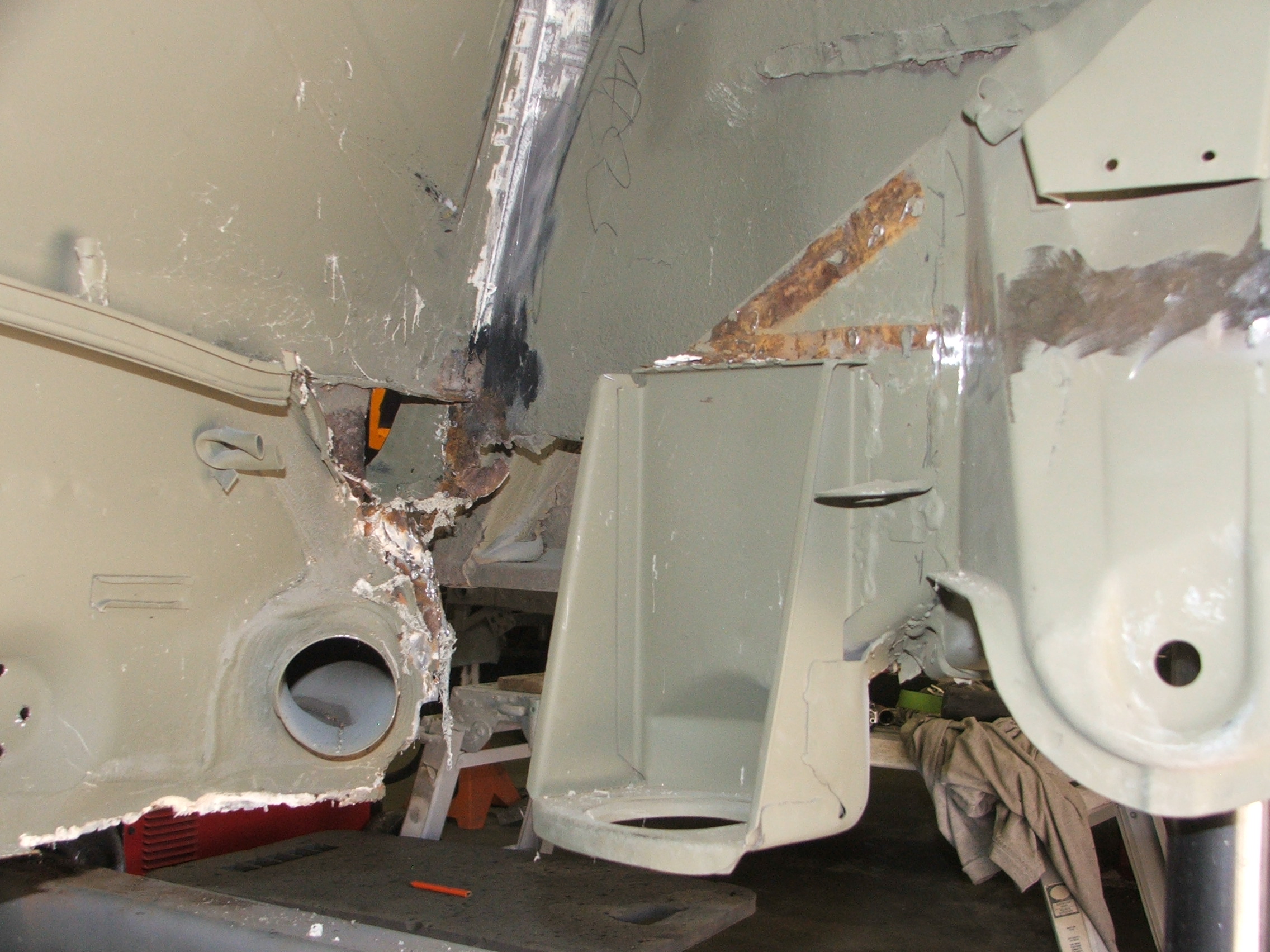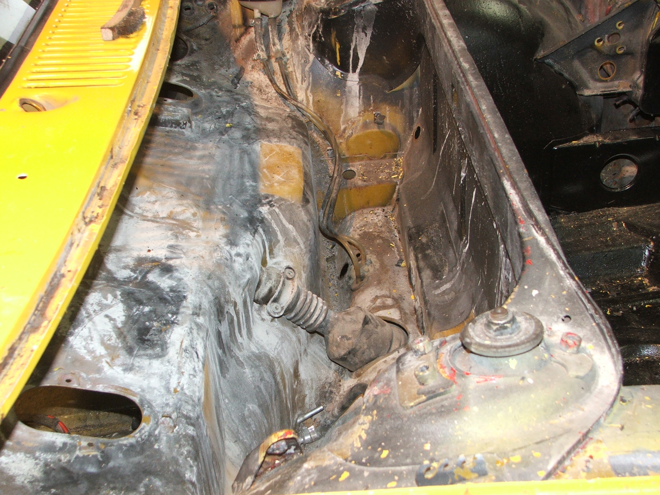 I think the car may have had a small fire or two in it's life. When I tore down the motor. It was covered in what looked like melted plastic. Not sure what it was. The gas tank area was covered in what looked like fire extinguisher powder as well. I checked compression before pulling the motor out and #3 was at 40lbs. Found out that the head burned through. I tracked down a rebuilt set of 1.7 heads in NC (Thanks Bill), and am having Pat at Vee W Unlimited build it back up. I'm curious to see what is under all the paint and the sections of the car near the front that appeared to be in a fire at one point? |
