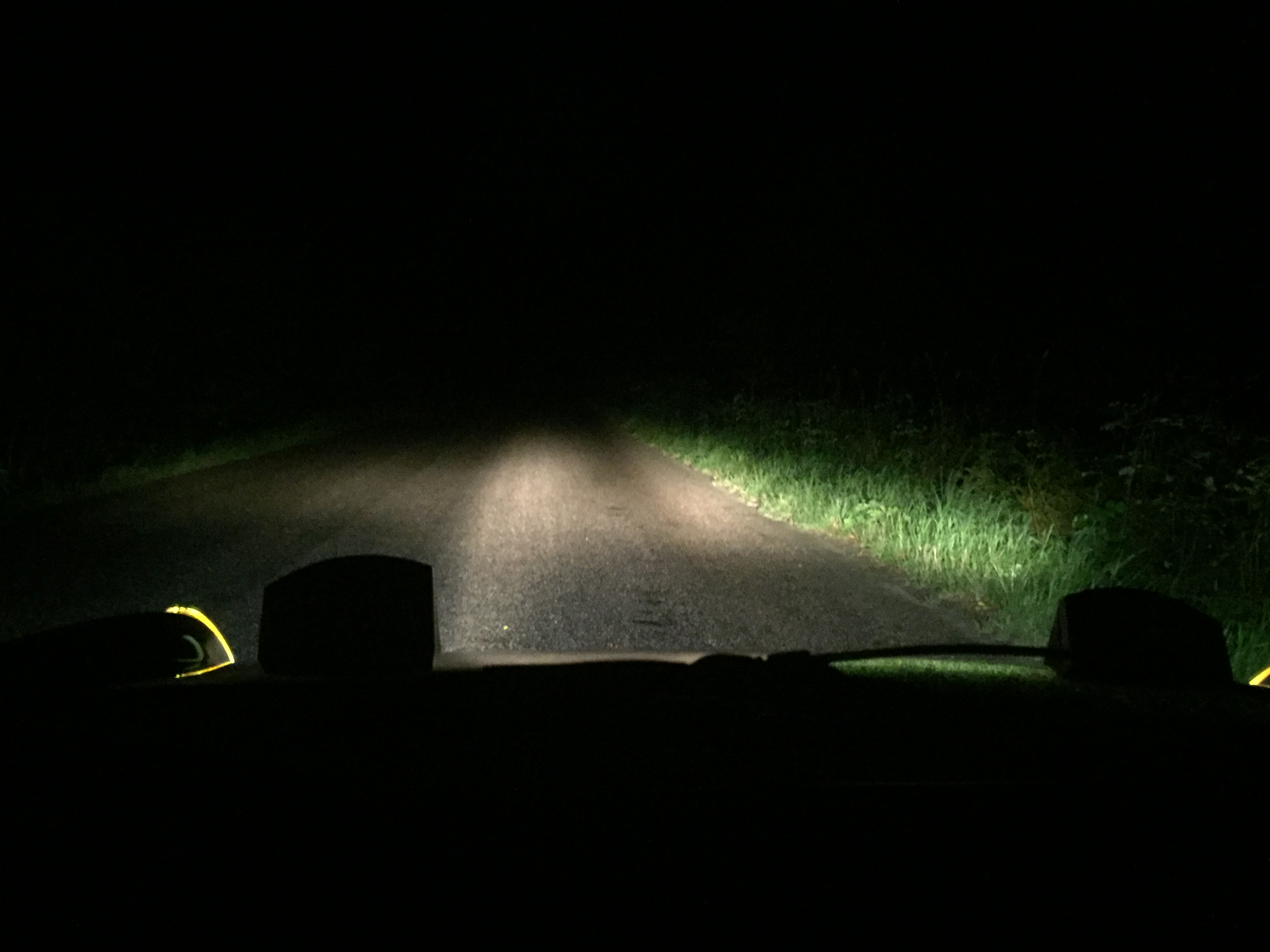 This is the sealed beam on low/dipped beam. Quite short range. This is the sealed beam on high beam. Better range of course but still not what I'd call good. These are the LED H4's on low/dipped beam. The experience is that they are much brighter and light up the road further ahead than the sealed beam low beam did. These are the H4 LEDs on high beam. I was quite dissapointed as there wasnt much difference from the low beam. As far as I can tell there is no extra range on the high beam and as the light pattern on the ground shows most of the extra light seems to end up close to the car. There was a little more vertical spread in the light but it didnt do much in actual long range light that you want on high beams. My verdict: The improvement of the low beams makes it worth the upgrade. I wont be driving my car much in the dark so its ok for me. If you do alot of night driving I would try a set of Osram or Philips H4 bulbs too for comparison. (and get separate +12v feeds and relays for the headlights to ensure reliability) |