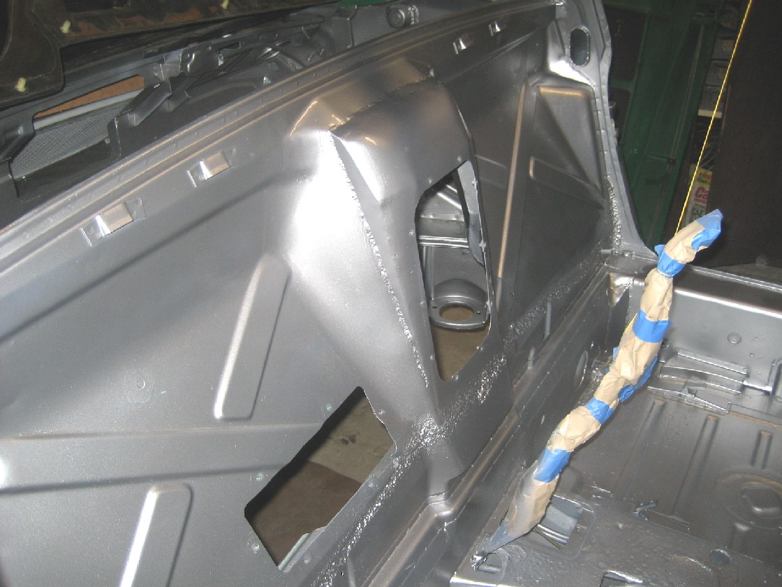 The firewall hump only needed to be moved forward at the top. The crank pulley and alternator clearance at the bottom was adequate as is. What I did, was to cut the outline of what I needed, but not cut the bottom. I simply cut and inverted 'U', (attached at the bottom) and bent the it forward at the top. I made filler sections, and welded them in. Also, as all us 914 types do, an access panel was fabricated. Notice too, I had to make a sort of pie cut portion on the drivers side of the hump to clear the accessory drive serpentine belt. One additional area that required clearance, was the thermostat housing. The firewall needed a small hump there too, so I decided to make a removable hump thingy. I don't have a photo of the removable hump, so I'll describe it briefly. I only needed about 3/4" worth of hump, so I took a sheet metal pan I found at McMaster-Carr that was about 4" x 8" x 2" deep and cut it to 3/4" and welded a flange around its perifery. Not as easy as it sounds, since if you notice in the photos, there are stiffening ribs in the firewall which required the flange to change planes, so it was a bit involved. As with the access panel, I made this hump thing removable as well. To get the motor out of the car, the thermostat housing needs to be removed beforehand....things are that tight! Photos are out of order, and some show the result in its final painted form, but you get the idea. Attached thumbnail(s) Attached image(s)