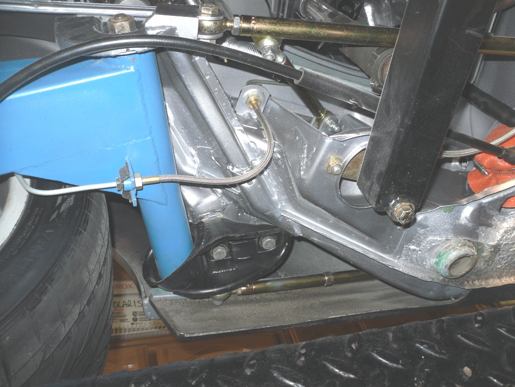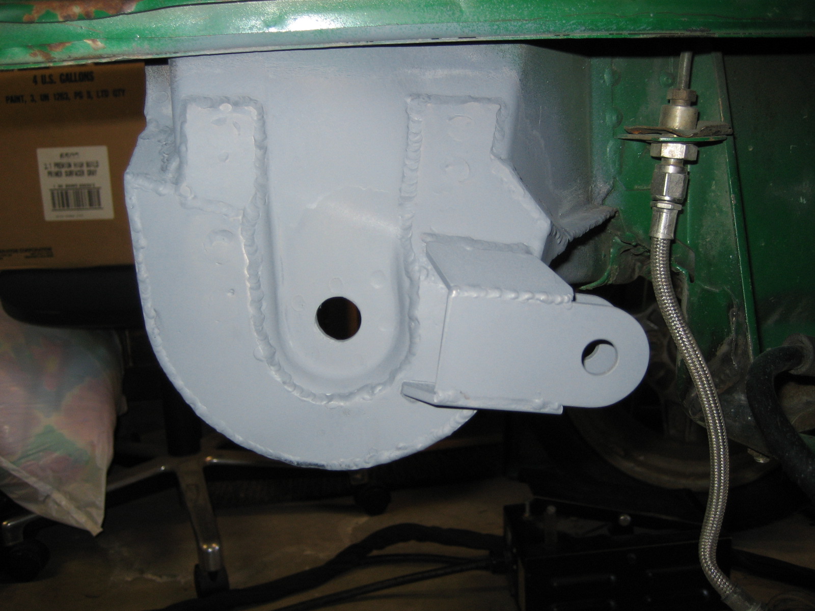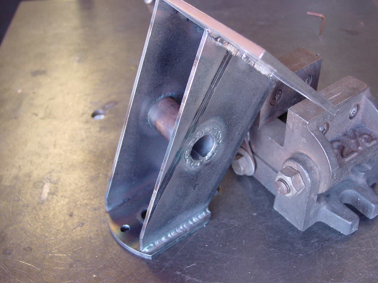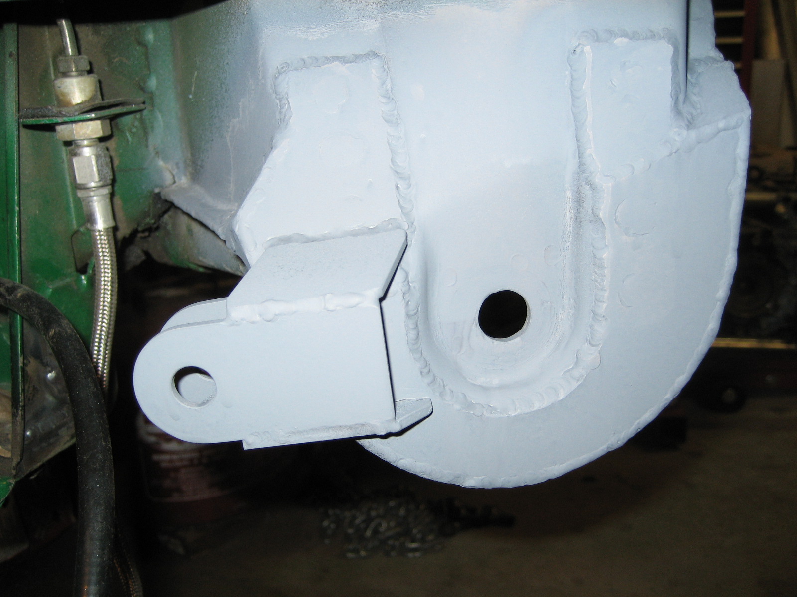 I re-enforced the inner suspension ears with a sort of scab plate and boxed combo along with the traditional link to the firewall. I made cardboard templates for the scab plates, cut out some sheet metal, and TIG welded those into place. As with most inner ears, the hole for the pivot shaft usually gets worn out-of-round, so I made sure to add some weld bead and ream the holes true.