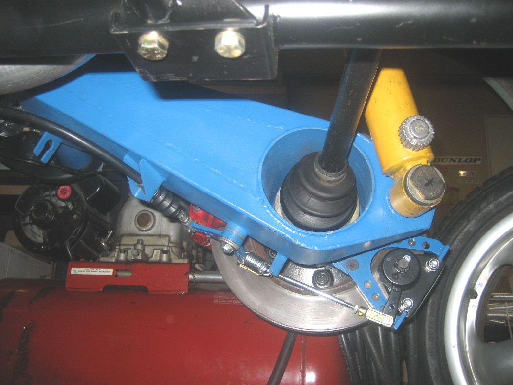 A couple more comments on the trailing arms. Welded structures are subject to movement due mostly to shrinkage from heat. As such, I did get some movement here and there, but the most significant area was the pivot shaft tube. Basically it was no longer straight, so I had to subsequently heat and bend it until it was straight. Also, the bearing bore diameter, to my surprise, shrunk a small amount which I didn't expect since the weld was what I thought was an adequate distance. Now we're talking about tenth's of a thousanth of an inch, but this is a press fit and needs to stay within a suitable range. In the end, the correct final step after welding, would have been to normalize or stress relieve the structure, but that would have added cost, time, and required an alignment fixture....too much added hassle so I didn't do it. The overall weight of this custom piece is about the same as a stock trailing arm with reinforcement kit, so I think that worked out well. I had considered, and even started machining parts to make an aluminum trailing arm, but the risk just wasn't worth it.......A welded aluminum structure requires a multi step treatment cycle to relieve stresses, normalize, anneal, and heat treat. And in the end, it's still suseptable to sudden fatigue failure. I added a photo of the aluminum bearing carriers that I didn't use. The parking brake is a Wilwood mechanical spot caliper, and I configured the linkage such that the stock 914 parking brake cable and clevis setup could be used without modification. The Wilwood caliper is a floating type which means it sits loosely in it's mount. The result is that it rattles when driving the car; very annoying! What I may do, is design some type of slide cofiguration (pins and bushings) to eliminate the rattle. So the big unanswered question surely on everyone's mind, is why blue? Had a can of Ford engine enamel.......and now that they're on the car, the color looks kinda cool actually. I threw in a photo of the stock trailing arm in the weld fixture. Attached thumbnail(s) Attached image(s)