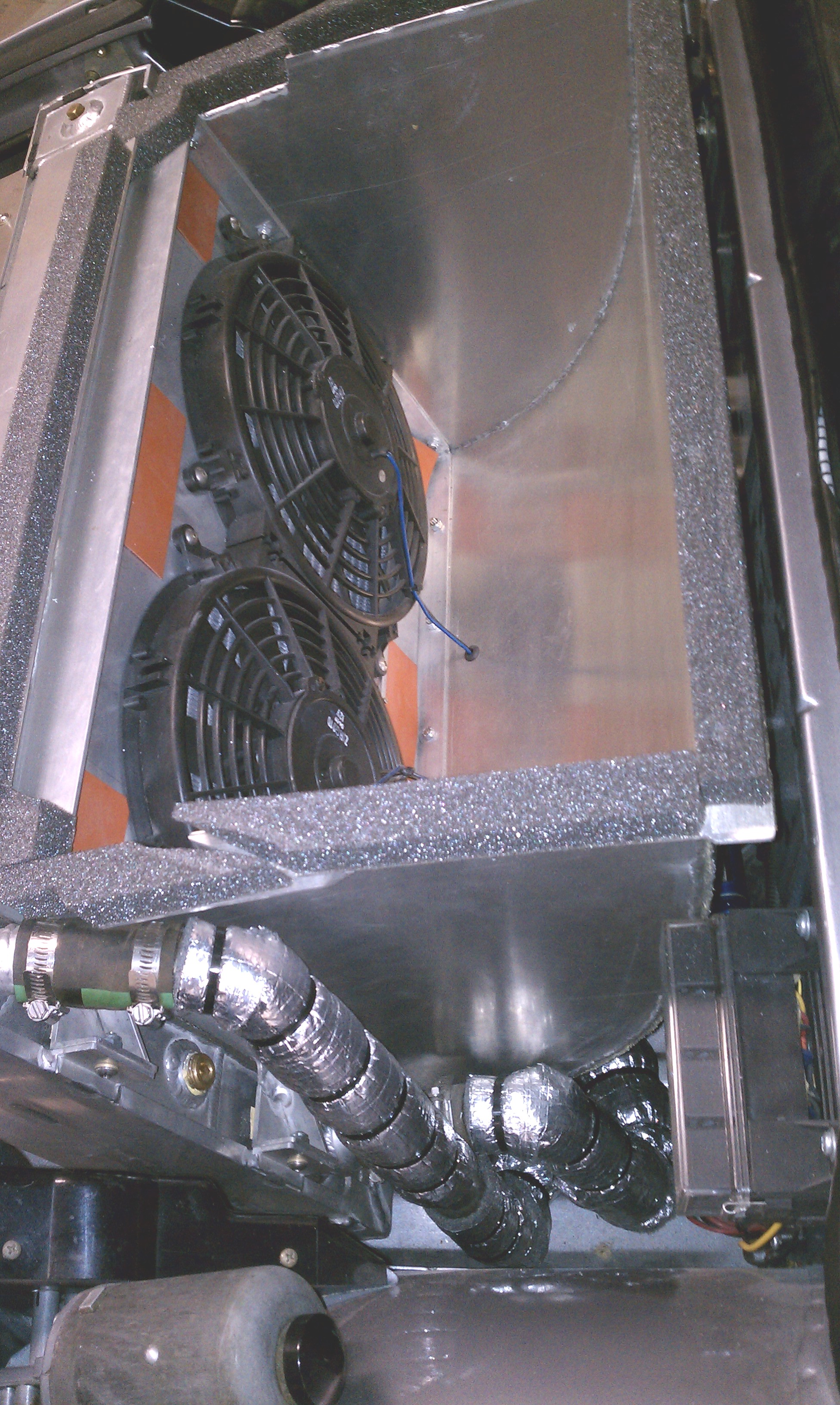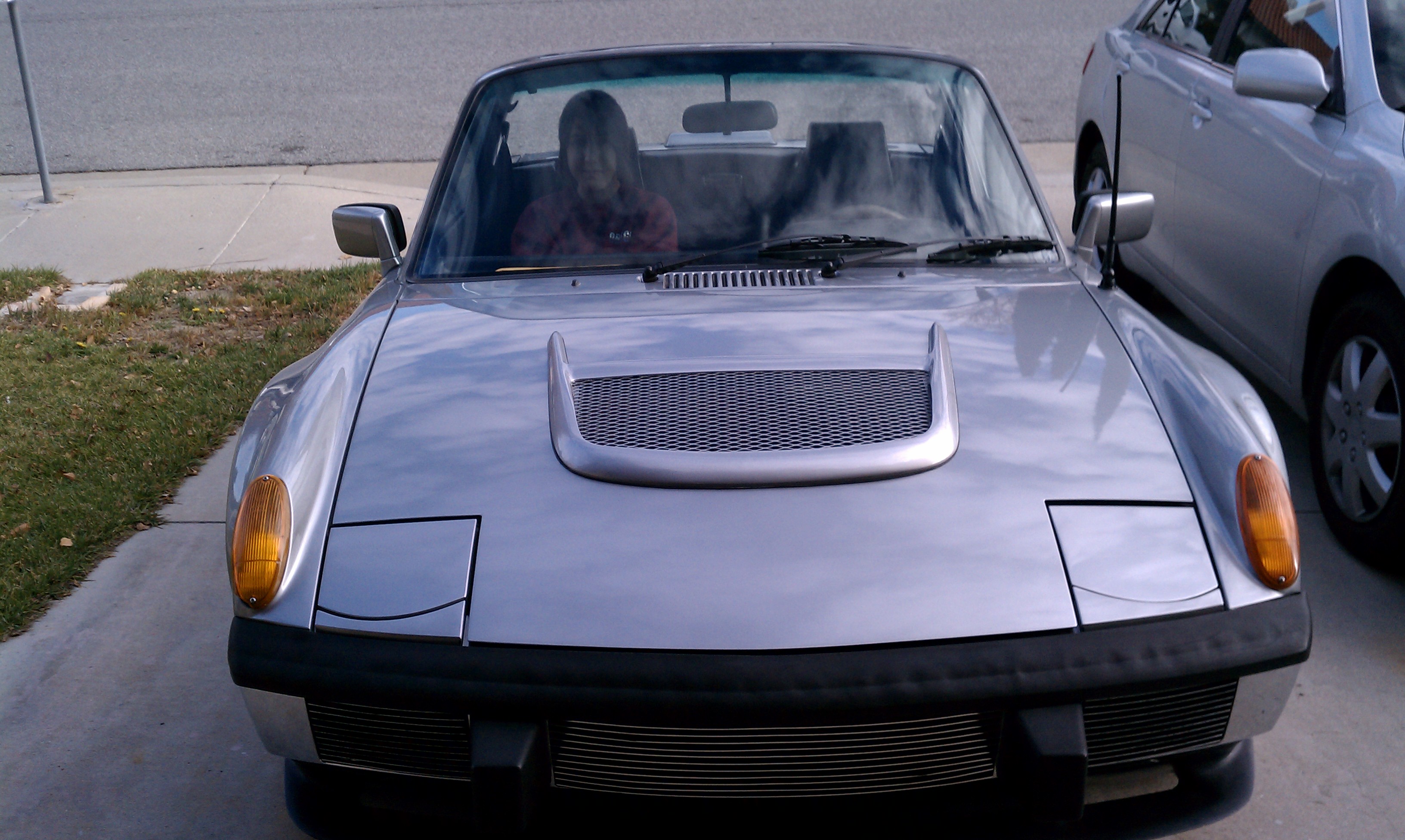 I started with an aluminum radiator from AFCO; P/N 80133N which is an ASA racing radiator, dual pass, cap delete, 27 1/2 x 16 x 3. I see now that Summit sells them, though it's about $100.00 more than I paid a few years ago when I bought directly from AFCO. I'm going to gush a bit about how great these guys at AFCO are to deal with. Again, your typical Mid-Western stock car supplier/manufacturer that is a joy to work with...great attitude, etc. Anyway, the radiator size works out well in the 914; all that was needed was to tip it slightly forward, and it fit. First I cut an opening in the front bulkhead, and re-enforced the center rib with a formed piece of channel to help stiffen the structure. I then determined the most suitable position for the radiator and went about designing a mounting scheme. I did what I've done on race cars, which is to build a U shaped channel lined with foam into which the radiator gets inserted into. This avoids any hard mounting, and completely shock mounts and isolates the radiator. I always cringe when I see folks hard mount radiators. There are of course other ways to shock mount, but this is how I like to do it. I made the U shaped channel out of aluminum with tabs in strategic locations for mounting. For the mounting points, I also shock mounted this structure to the chassis with two rubber isolators on the bottom, and two rubbber grommet mounts on the top. I used two Zirgo 10" puller fans and mounted them to a shroud. I also made some silicone rubber flaps to pass additional air at higher speeds thru the shroud as well. The shroud bolts to the structure. For the ducting, I made some sheet aluminum ducts both front and back that mount to the radiator U structure, but do not fasten to the bulkhead, but stop short with foam gasketing to make the final seal. For the exit side, I made a duct that turns upwards. A foam gasket seals the gap between it and the hood. The hood vent piece (diffuser) was designed with the help of an Art Center College of Design student, as I have no styling talent what so ever. I made a foam model which I covered with fiberglass and filled and sanded smooth. The size of the opening in the hood is 1.7 times the inlet side to help create the requisite pressure differential to draw the air out (with the help of the vent/diffuser). This diffuser sandwiches a rubber gasket to protect the paint, and is fastened to the hood by stailness button head screws from the underside (I bonded threaded inserts into the diffuser). With all this however, like very much what byndbad914 did with the louvered diffuser on his track car. Looks racey and subtle; if I would have known at the time, I would have simply gone that route instead. I'll get to the piping in the next post. Attached thumbnail(s) Attached image(s)
