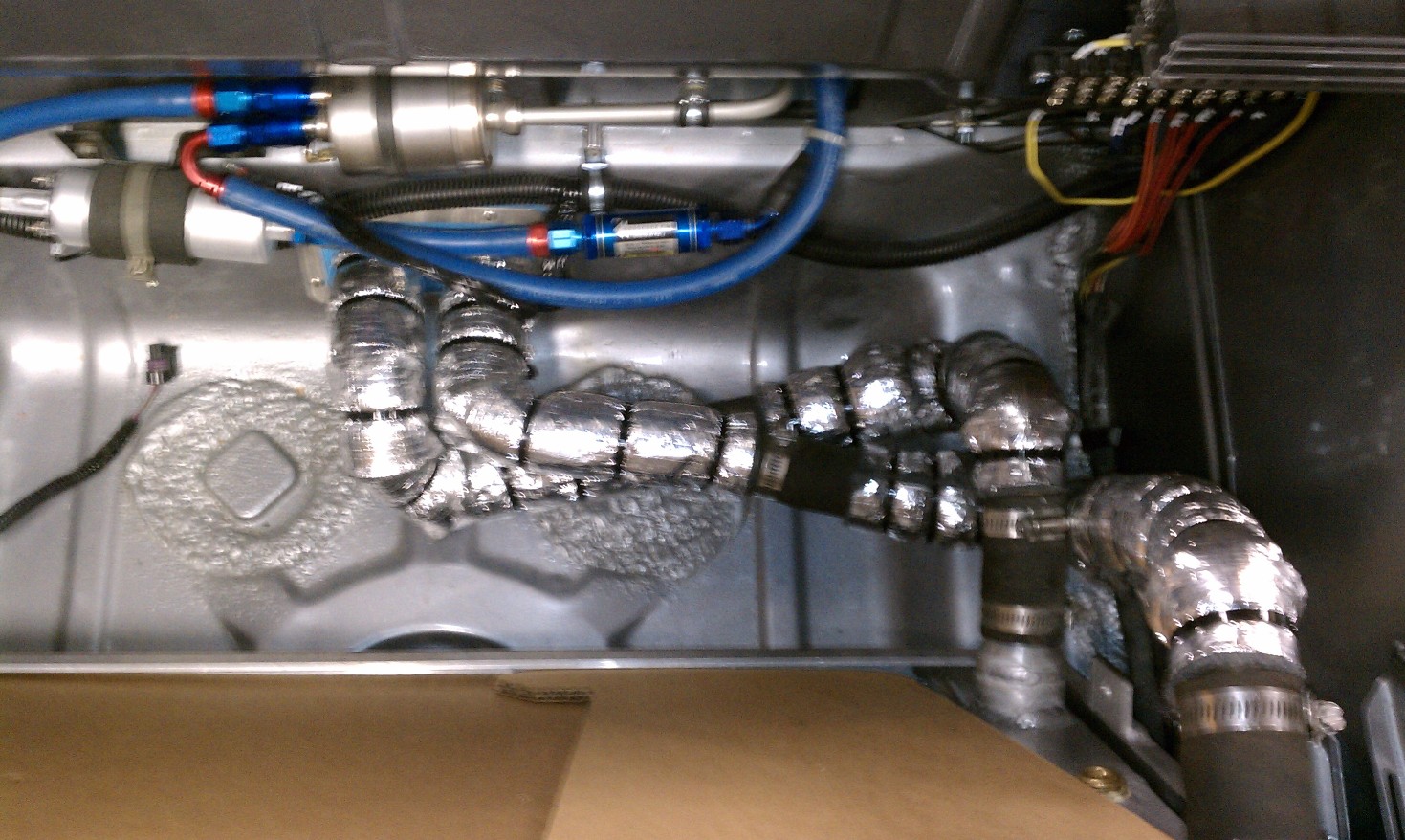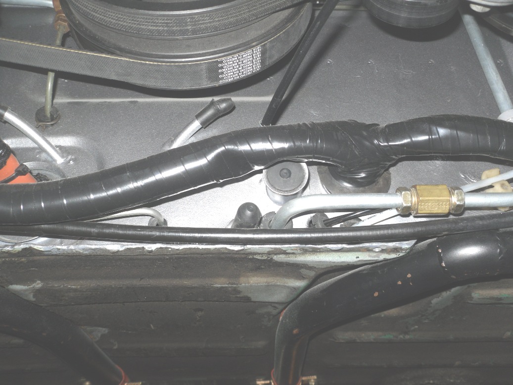 I found a couple of more photos (with the exit ducting removed) of how the piping routed in the front trunk and insulated.