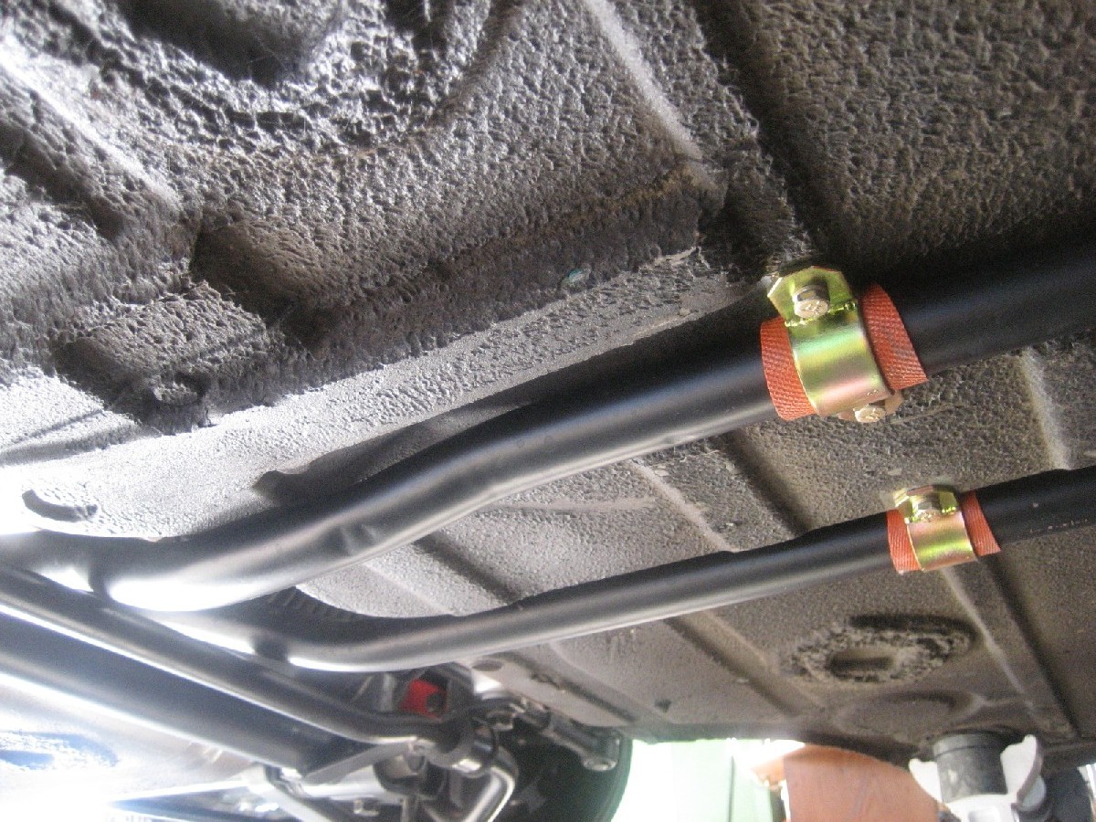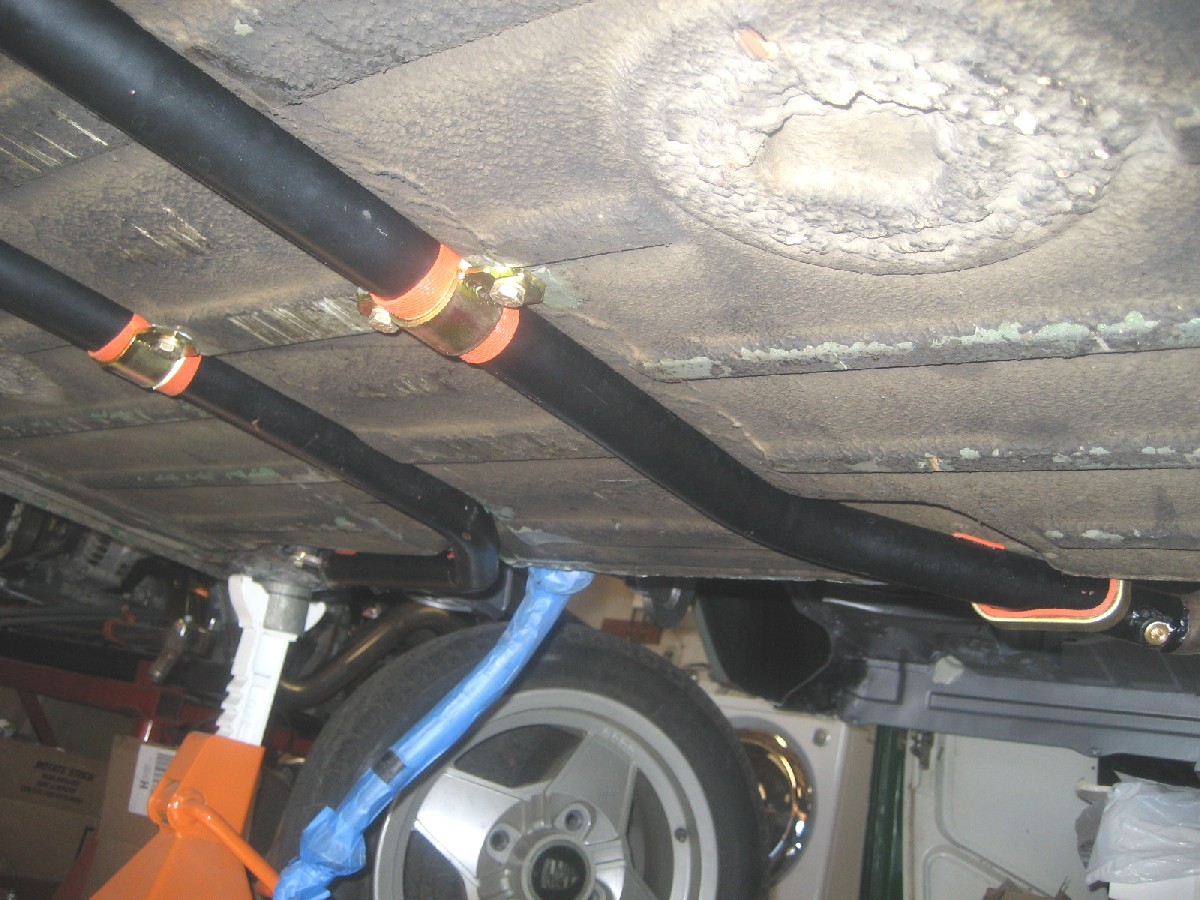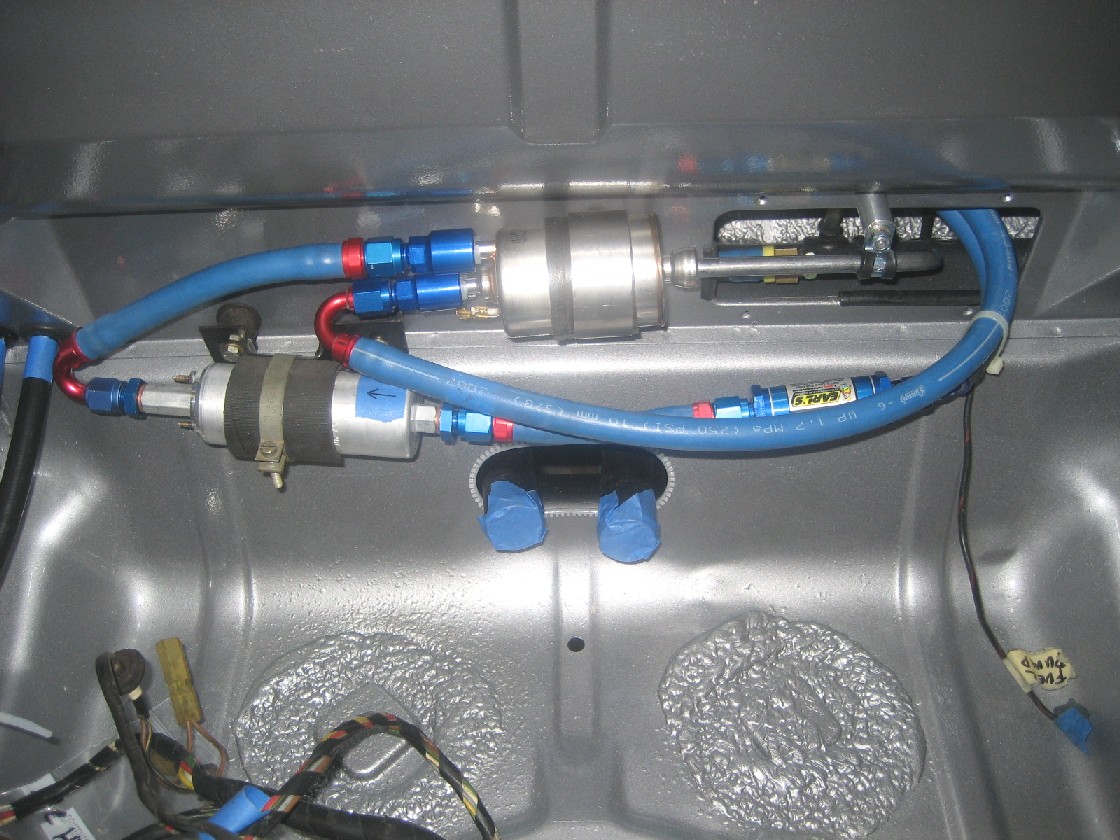 In order to adapt -6AN fittings to the stock 914 fuel tank, I tapped the exisiting inlet and outlet bungs to 3/8NPT....I got this tip from 914WORLD; Thanks! I installed some -6AN X 3/8NPT fittings. What I did on the outlet fitting, was to silver braze a tube and screen (sock) to mimic the 914 in tank screen (actually a VW part) to strain out any big particles. I used Summit Twist Tite push on hose and fittings that's good for 250psi. The feed hose goes through an Earl's 100 micron course filter before entering the Walbro 255 electric fuel pump. One of the two sure death's of this type of pump is particulate contamination, so an additional $50 for the pre-filter is worth it. The high pressure side of the pump feeds into a Vette filter/regulator to bring the pressure down to 58psi. It has a bypass which is plumbed back to the the orignal 914 return line bung. The regulated pressure feed hose goes to a thru-tunnel steel tube, but more on that in a minute. The Vette filter/regulator uses GM type push-on connections; one 3/8' male inlet, one 5/16" male return, and one 3/8" female out. To couple the two male fittings to -6AN, Russell makes adapter fittings, but here's a work of caution: The early style uses a plastic retaining clip that reportedly fails on occasion, according to experiences on the LS1 boards where some fires resulted. Russell subsequently offered a re-designed adapter that employs a positive locking system (644120, 3/8" x -6AN, and 644110, 5/16" x -6AN). The adapters shown in my photo, are the early stlye which I replaced as soon as I read the failure accounts. For the regulated side with the 3/8" female connector, I bought from NAPA a steel adapter tube that had the appropriate swaged male ends, cut one end off, and installed a 45 degree flare nut and flared the othe end. I then made a 180 degree bend to better route the hose under the tank and to the through tunnel steel tube. I purposely made the hoses long enough to allow me to pull the fuel tank up high enough to service anything underneath it without having to romove the hose fittings. Now to the steel through tunnel line. Since I knew I wanted a steel line with fittings capable of sealing 58psi fuel pressure safely, I decided on a 60" pre-made 3/8" steel brake line with 45 degree flared ends. Here's why I went this route: NAPA offers brass 45 degree flare 3/8" x -6AN push-on high pressure hose adapters in both male and female. This kept things really simple without the need for all kinds of fittings cobbled together. The brake line was bent to shape by trial and error untill it had the shape I was looking for. It passes through the stock 914 rubber fuel line grommet at the front. I did have to slit the grommet to get the line in it, then I plugged the return line hole and pushed the grommet into place. The brake line at the engine bay makes a 90 degree bend towards the passenger side. Here, I added a flare line coupling and used a second pre-made brake line formed to run a path up, then turn towards the passenger side under the engine shelf, all hung from Adel clamps. This line stops just above the engine shelf where another NAPA flare to -6AN hose fitting is used. With another Summit hose, it runs to the LS1 fuel rail through a heat reflective tube. The fitting on the fuel rail in also a GM push-on, so another Russell adapter fitting was used there. That was long winded for sure, but hope it helps detail what the photos don't show. Attached thumbnail(s) Attached image(s)